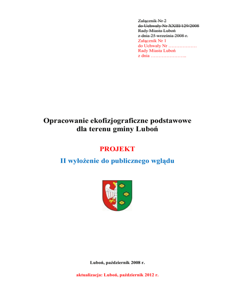 Załącznik Nr 2 do Uchwały Nr XXIII/129/2008 Rady Miasta Luboń z dnia 25 września 2008 r. Załącznik Nr 1 do Uchwały Nr ……………… Rady Miasta Luboń z dnia ………………….. Opracowanie ekofizjograficzne podstawowe dla terenu gminy Luboń PROJEKT II wyłożenie do publicznego wglądu Luboń, październik 2008 r. aktualizacja: Luboń, październik 2012 r. SPIS TREŚCI 1. WPROWADZENIE ........................................................................................................ 3 1.1. Przedmiot i cel opracowania .................................................................................... 3 1.2. Lokalizacja ............................................................................................................... 5 1.3. Rys historyczny ........................................................................................................ 5 2. OPIS ŚRODOWISKA PRZYRODNICZEGO ............................................................. 6 2.1. Położenie fizyczno-geograficzne .............................................................................. 6 2.2. Krajobraz ................................................................................................................... 6 2.3. Budowa geologiczna ................................................................................................. 9 2.4. Gleby ....................................................................................................................... 12 2.5. Wody podziemne..................................................................................................... 12 2.6. Wody powierzchniowe ............................................................................................ 14 2.7. Klimat ...................................................................................................................... 17 2.8. Szata roślinna .......................................................................................................... 20 3. OCENA STANU I FUNKCJONOWANIA ŚRODOWISKA PRZYRODNICZEGO 23 3.1. Wody podziemne .................................................................................................... 23 3.2. Wody powierzchniowe ........................................................................................... 27 3.3. Gleby ....................................................................................................................... 37 3.4. Powietrze ................................................................................................................. 40 3.5. Klimat akustyczny ................................................................................................... 45 3.6. Ochrona przyrody i zabytków ................................................................................. 55 4. OGRANICZENIA W PLANOWANIU I ZAGOSPODAROWANIU PRZESTRZENI ...................... 74 4.1. Ograniczenia formalno – prawne ........................................................................... 74 4.1.1. Ograniczenia wynikające z przepisów ustawy o ochronie przyrody ........... 74 4.1.2. Ograniczenia wynikające z przepisów ustawy Prawo ochrony środowiska 76 4.1.3. Ograniczenia wynikające z przepisów ustawy o ochronie gruntów rolnych i leśnych ........................................................................................................... 80 4.1.4. Ograniczenia wynikające z przepisów ustawy – Prawo wodne................... 81 4.1.5. Ograniczenia wynikające z przepisów ustawy o ochronie zabytków i opiece nad zabytkami ............................................................................................... 87 4.1.6. Ograniczenia wynikające z przepisów ustawy o lasach .............................. 88 4.2. Ograniczenia wynikające z uwarunkowań środowiskowych ................................. 89 OPRACOWANIE EKOFIZJOGRAFICZNE PODSTAWOWE DLA TERENU GMINY LUBOŃ 4.2.1. Spadki terenu ................................................................................................. 89 4.2.2. Poziom wód gruntowych ............................................................................... 89 4.2.3. Przydatność gruntów dla celu posadowienia budynków ............................... 90 4.2.4. Topoklimat .................................................................................................... 90 5. PREDYSPOZYCJE ŚRODOWISKOWE DO KSZTAŁTOWANIA STRUKTURY FUNKCJONALNO PRZESTRZENNEJ .............................................................................................................. 91 6. WYKORZYSTANE AKTY PRAWNE, MAPY I OPRACOWANIA............................................. 93 ANEKS ................................................................................................................................ 99 SPIS ZAŁĄCZNIKÓW 1. Mapa – Geomorfologia 2. Mapa – Hydrografia 3. Mapa – Ochrona zasobów przyrody, zabytków i zdrowia człowieka 4. Mapa – Predyspozycje środowiskowe do kształtowania struktury funkcjonalno przestrzennej 2 OPRACOWANIE EKOFIZJOGRAFICZNE PODSTAWOWE DLA TERENU GMINY LUBOŃ 1. WPROWADZENIE 1.1. Przedmiot i cel opracowania Niniejsze opracowanie ekofizjograficzne wykonane zostało dla gminy Luboń, dla której będzie opracowywanea zmiana studium uwarunkowań i kierunków zagospodarowania przestrzennego. Zgodnie z art. 72 Prawa ochrony środowiska z dnia 27 kwietnia 2001 r. (Dz. U. z 2008 r. Nr 25, poz. 150 z późn. zm.)., Nr 111, poz. 708, Nr 138, poz. 865, Nr 154, poz. 958, Nr 171, poz. 1056, Nr 199, poz. 1227, Nr 223, poz. 1464, Nr 227, poz. 1505, z 2009 r. Nr 19, poz. 100, Nr 20, poz. 106, Nr 79, poz. 666, Nr 130, poz. 1070, Nr 215, poz. 1664, z 2010 r. Nr 21, poz. 104, Nr 28, poz. 145, Nr 40, poz. 227, Nr 76, poz. 489, Nr 119, poz. 804, Nr 152, poz. 1018 i poz. 1019, Nr 182, poz. 1228, Nr 229, poz. 1498. Nr 249, poz. 1657, z 2011 r. Nr 32, poz. 159, Nr 63, poz. 322, Nr 94, poz. 551, Nr 99, poz. 569, Nr 122, poz. 695, 