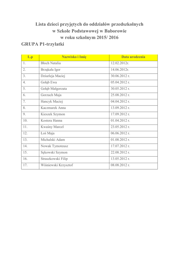 Lista dzieci przyjętych do oddziałów przedszkolnych w Szkole Podstawowej w Baborowie w roku szkolnym 2015/ 2016 GRUPA P1-trzylatki Nazwisko i Imię L.p Data urodzenia 1. Błoch Natalia 12.02.2012r. 2. Brząkała Igor 14.06.2012r. 3. Dziurleja Maciej 30.06.2012 r. 4. Gołąb Ewa 05.04.2012 r. 5. Gołąb Małgorzata 30.05.2012 r. 6. Gorzuch Maja 25.08.2012 r. 7. Hancyk Maciej 04.04.2012 r. 8. Kaczmarek Anna 13.09.2012 r. 9. Kieszek Szymon 17.09.2012 r. 10. Kostera Hanna 01.04.2012 r. 11. Kwaśny Marcel 23.05.2012 r. 12. Łoś Maja 06.06.2012 r. 13. Michalski Adam 01.08.2012 r. 14. Nowak Tymoteusz 17.07.2012 r. 15. Sękowski Szymon 22.08.2012 r. 16. Straszkowski Filip 13.05.2012 r. 17. Wiśniewski Krzysztof 08.08.2012 r. Lista dzieci przyjętych do oddziałów przedszkolnych w Szkole Podstawowej w Baborowie w roku szkolnym 2015/ 2016 GRUPA P2-czterolatki Nazwisko i imię L.p Data urodzenia 1. Biniak Maja 19.11.2011 r. 2. Bukowski Cezary 17.04.2011 r. 3. Jabłońska Maria 29.01.2011 r. 4. Jaśkowiak Lilianna 25.01.2011 r. 5. Juszczak Maksymilian 23.02.2011 r. 6. Kostarz Szymon 20.05.2011 r. 7. Kotliński Filip 20.08.2011 r. 8. Kurczewska Gabriela 03.01.2011 r. 9. Michalski Ignacy 09.02.2011 r. 10. Mrówka Marcel 04.05.2011 r. 11. Nowak Szymon 30.10.2011 r. 12. Paszkiewicz Maria 23.06.2011 r. 13. Piątkowski Konstanty 27.02.2011 r. 14. Pilch Natalia 12.02.2011 r. 15. Potocki Aleksander 15.06.2011 r. 16. Przepiórka Piotr 11.08.2011 r. 17. Średziński Filip 07.10.2011 r. 18. Tomaszewski Wiktor 14.02.2011 r. 19. Wachowak Inez 27.03.2011 r. 20. Wachowiak Kornelia 27.06.2011 r. 21. Wachowiak Maria 02.01.2011 r. 22. Wencel Mikołaj 06.03.2011 r. 23. Wieczorek Kamila 16.10.2011 r. 24. Wiorek Franciszek 27.02.2011 r. 25. Zielińska Lena 06.08.2011 r. Lista dzieci przyjętych do oddziałów przedszkolnych w Szkole Podstawowej w Baborowie w roku szkolnym 2015/ 2016 GRUPA P3-pięciolatki, sześciolatki Nazwisko i imię L.p Data urodzenia 1. Bartnik Julia 04.04.2009 r. 2. Ceglarz Jan 23.07.2010 r. 3. Dondajewski Mateusz 15.06.2010 r. 4. Jakubowska Marta 22.11.2008 r. 5. Jakubowski Miłosz 20.06.2010 r. 6. Kalemba Fabian 10.01.2009 r. 7. Kufel Jakub 14.11.2010 r. 8. Matuszak Antoni 22.02.2010 r. 9. Mazurkiewicz Martyna 13.06.2010 r. 10. Mikołajczak Oliwier 28.09.2010 r. 11. Nowak Alan 16.11.2010 r. 12. Nowak Jolanta 26.02.2010 r. 13. Piechowiak Adrian 13.12.2009 r. 14. Przyłucka Zuzanna 04.06.2009 r. 15. Pytel Lena 19.03.2010 r. 16. Romanowska Maja 02.08.2010 r. 17. Runowski Krzysztof 20.08.2010 r. 18. Spychała Blanka 20.11.2010 r. 19. Szczepaniak Szymon 12.11.2010 r. 20. Szypa Marta 18.06.2010 r. 21. Ślotała Sebastian 17.06.2010 r. 22. Świniarska Maja 13.07.2010 r. 23. Wiza Amelia 19.03.2010 r. 24. Wojciechowski Cezary 24.04.2010 r. 25. Woźniak Alicja 22.10.2010 r. 26. Frankowska Aleksandra 05.02.2010 r. Lista dzieci nieprzyjętych do oddziałów przedszkolnych w Szkole Podstawowej w Baborowie. w roku szkolnym 2015/ 2016 Nazwisko i imię L.p Data urodzenia 1. Pflaum Michał 25.10.2011 r. 2. Słomiński Stanisław 09.04.2012 r. 3. Plszak Oliwia 08.10.2012 r.