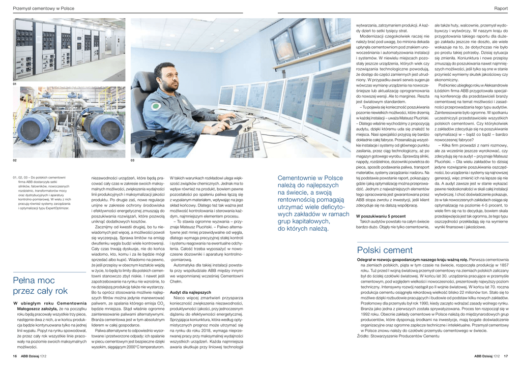 Przemysł cementowy w Polsce Raport 01 02 03 01, 0 2, 03 – Do polskich cementowni firma ABB dostarczyła setki silników, falowników, nowoczesnych rozdzielnic, transformatorów mocy oraz dystrybucyjnych i aparatury kontrolno-pomiarowej. W wielu z nich pracują również systemy zarządzania i optymalizacji typu ExpertOptimizer. Pełna moc przez cały rok W ubiegłym roku Cementownia Małogoszcz założyła, że na początku roku będą pracowały wszystkie trzy piece, następnie dwa z nich, a w końcu produkcja będzie kontynuowana tylko na jednej linii wypału. Popyt na rynku spowodował, że przez cały rok wszystkie linie pracowały na poziomie swoich maksymalnych możliwości. 16 ABB Dzisiaj 1|12 niezawodności urządzeń, które będą pracować cały czas w zakresie swoich maksymalnych możliwości, zwiększenia wydajności linii produkcyjnych i maksymalizacji jakości produktu. Po drugie zaś, nowe regulacje unijne w zakresie ochrony środowiska i efektywności energetycznej zmuszają do poszukiwania rozwiązań, które pozwolą uniknąć dodatkowych kosztów. Zacznijmy od kwestii drugiej, bo tu niewiadomych jest więcej, a możliwości powoli się wyczerpują. Sprawa limitów na emisję dwutlenku węgla budzi wiele kontrowersji. Cały czas trwają dyskusje, nie do końca wiadomo, kto, komu i za ile będzie mógł sprzedać albo kupić. Wiadomo na pewno, że jeśli przepisy w obecnym kształcie wejdą w życie, to będą to limity dla polskich cementowni stanowczo zbyt niskie. I nawet jeśli zapotrzebowanie na rynku nie wzrośnie, to na dzisiejszą produkcję także nie wystarczy. Bo tu oprócz stosowania możliwie najlepszych filtrów można jedynie manewrować paliwem, ze spalania którego emisja CO 2 będzie mniejsza. Stąd właśnie ogromne zainteresowanie paliwami alternatywnymi. Branża cementowa jest w tym absolutnym liderem w całej gospodarce. Paliwa alternatywne to odpowiednio wysortowane i przetworzone odpady: ich spalanie w piecu cementowym jest bezpieczne dzięki wysokim, sięgającym 2000°C temperaturom. W takich warunkach rozkładowi ulega większość związków chemicznych. Jednak ma to wpływ również na produkt, bowiem pewne pozostałości po spaleniu paliwa łączą się z wypalanym materiałem, wpływając na jego skład końcowy. Dlatego też tak ważna jest możliwość kontrolowania i sterowania każdym, najmniejszym elementem procesu. – To stawia ogromne wyzwania – przyznaje Mateusz Pluciński. – Paliwo alternatywne jest mniej przewidywalne od węgla, dlatego wymaga precyzyjnej stałej kontroli i systemu reagowania na ewentualne odchylenia. Całość trzeba wyposażyć w nowoczesne dozowniki i aparaturę kontrolno-pomiarową. Automatyka dla takiej instalacji powstała przy współudziale ABB między innymi we wspomnianej wcześniej Cementowni Chełm. Audyt dla najlepszych Nieco więcej zmartwień przysparza konieczność zwiększenia niezawodności, produktywności i jakości, przy jednoczesnym dążeniu do efektywności energetycznej. Sprzyjająca koniunktura, która według optymistycznych prognoz może utrzymać się na rynku do roku 2018, wymaga nieprzerwanej pracy przy maksymalnej wydajności wszystkich urządzeń. Każda najmniejsza awaria skutkuje przy liniowej technologii Cementownie w Polsce należą do najlepszych na świecie, a swoją rentownością pomagają utrzymać wiele deficytowych zakładów w ramach grup kapitałowych, do których należą. wytwarzania, zatrzymaniem produkcji. A każdy dzień to setki tysięcy strat. Modernizacji czegokolwiek raczej nie należy brać pod uwagę, bo miniona dekada upłynęła cementowniom pod znakiem unowocześniania i automatyzowania instalacji i systemów. W niewielu miejscach pozostały jeszcze urządzenia, których wiek czy rozwiązania technologiczne powodują, że dostęp do części zamiennych jest utrudniony. W przypadku awarii serwis sugeruje wówczas wymianę urządzenia na nowocześniejsze lub aktualizację oprogramowania do nowszej wersji. Ale to margines. Reszta jest światowym standardem. – Tu pojawia się konieczność poszukiwania pozornie niewielkich możliwości, które drzemią w każdej instalacji – uważa Mateusz Pluciński. – Dlatego właśnie wychodzimy z propozycją audytu, dzięki któremu uda się znaleźć te miejsca. Nasi specjaliści przyjrzą się bardzo dokładnie całej fabryce. Przeanalizują wszystkie instalacje i systemy od głównego punktu zasilania, przez ciąg technologiczny, aż po magazyn gotowego wyrobu. Sprawdzą silniki, napędy, rozdzielnice, dozowniki powietrza do pieca, sposób podawania paliwa, transport materiałów, systemy zarządzania i nadzoru. Na tej podstawie powstanie raport, pokazujący gdzie i jaką optymalizację można przeprowadzić. Jednym z najważniejszych elementów tego opracowania jest gwarantowana przez ABB stopa zwrotu z inwestycji, jeśli klient zdecyduje się na dalszą współpracę. W poszukiwaniu 5 procent Takich audytów powstało na całym świecie bardzo dużo. Objęły nie tylko cementownie, ale także huty, walcownie, przemysł wydobywczy i wytwórczy. W naszym kraju do przygotowania takiego raportu dla dużego zakładu jeszcze nie doszło, ale wiele wskazuje na to, że dotychczas nie było po prostu takiej potrzeby. Dzisiaj sytuacja się zmieniła. Koniunktura i nowe przepisy zmuszają do poszukiwania nawet najmniejszych możliwości, jeśli tylko są one w stanie przynieść wymierny skutek jakościowy czy ekonomiczny. Pod koniec ubiegłego roku w Aleksandrowie Łódzkim firma ABB przygotowała specjalną konferencję dla przedstawicieli branży cementowej na temat możliwości i zasadności przeprowadzania tego typu audytów. Zainteresowanie było ogromne. W spotkaniu uczestniczyli przedstawiciele wszystkich polskich cementowni. Czy którykolwiek z zakładów zdecyduje się na poszukiwanie optymalizacji w – bądź co bądź – bardzo nowoczesnej fabryce? – Kilka firm prowadzi z nami rozmowy, ale za wcze