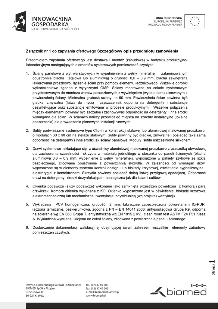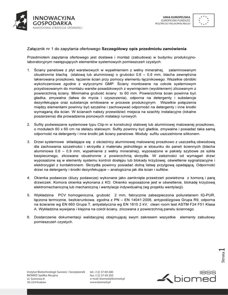 Załącznik nr 1 do zapytania ofertowego Szczegółowy opis przedmiotu zamówienia Przedmiotem zapytania ofertowego jest dostawa i montaż (zabudowa) w budynku produkcyjnolaboratoryjnym następujących elementów systemowych pomieszczeń czystych: 1. Ściany panelowe z płyt warstwowych w wypełnieniem z wełny mineralnej, zalaminowanym obustronnie blachą (stalową lub aluminiową) o grubości 0,6 – 0,9 mm, blacha zewnętrzna lakierowana proszkowo, łączenie ścian przy pomocy elementu łącznikowego. Wszelkie obróbki wykończeniowe zgodne z wytycznymi GMP. Ściany montowane na cokole systemowym przystosowanym do montażu warstw posadzkowych z wywinięciem (wyobleniem) zlicowanym z powierzchnią ściany. Minimalna grubość ściany to 60 mm. Powierzchnia ścian powinna być gładka, zmywalna (łatwa do mycia i czyszczenia), odporna na detergenty i substancje dezynfekujące oraz substancje emitowane w procesie produkcyjnym. Wszelkie połączenia między elementami powinny być szczelne i zachowywać odporność na detergenty i inne środki wymaganą dla ścian. W ścianach należy przewidzieć miejsca na szachty instalacyjne (lokalne poszerzenia) dla prowadzenia pionowych instalacji rurowych. 2. Sufity podwieszane systemowe typu Clip-in w konstrukcji stalowej lub aluminiowej malowanej proszkowo, o modułach 60 x 60 cm na stelażu stalowym. Sufity powinny być gładkie, zmywalne i posiadać taka samą odporność na detergenty i inne środki jak ściany panelowe. Moduły sufitu uszczelnione silikonem. 3. Drzwi systemowe składające się z ościeżnicy aluminiowej malowanej proszkowo z uszczelką obwodową dla zachowania szczelności i skrzydła z materiału jednolitego w stosunku do paneli ściennych (blacha aluminiowa 0,6 – 0,9 mm, wypełnienie z wełny mineralnej), wyposażone w pakiety szybowe ze szkła bezpiecznego, zlicowane obustronnie z powierzchnią skrzydła. W zależności od wymagań drzwi wyposażone są w elementy systemu kontroli dostępu lub blokady krzyżowej, oświetlenie sygnalizacyjne i elektrorygiel z kontaktronem. Skrzydła powinny posiadać dolną listwę przylgową opadającą, Odporność drzwi na detergenty i środki dezynfekujące – analogiczna jak dla ścian i sufitów. 4. Okienka podawcze (śluzy podawcze) wykonane jako zamknięta przestrzeń powietrzna z komorą i parą drzwiczek. Komora okienka wykonana z KO. Okienko wyposażone jest w oświetlenie, blokadę krzyżową elektromechaniczną lub mechaniczną i wentylacje indywidualną (wg projektu wentylacji). 5. Wykładzina PCV homogeniczna, grubość 2 mm, fabrycznie zabezpieczona poliuretanem IQ-PUR, łączona termicznie, bezkierunkowa, zgodna z PN – EN 14041:2006, antypoślizgowa Grupa R9, odporna na ścieranie wg EN 660 Grupa T, antystatyczna wg EN 1815 2 kV, clean room test ASTM F24 F51 Klasa A. Wykładzina wywijana i klejona na cokół ściany, zlicowana z powierzchnią panelu ściennego. 1 elementy zabudowy Strona 6. Dostarczenie dokumentacji walidacyjnej obejmującej swym zakresem wszystkie pomieszczeń czystych.
