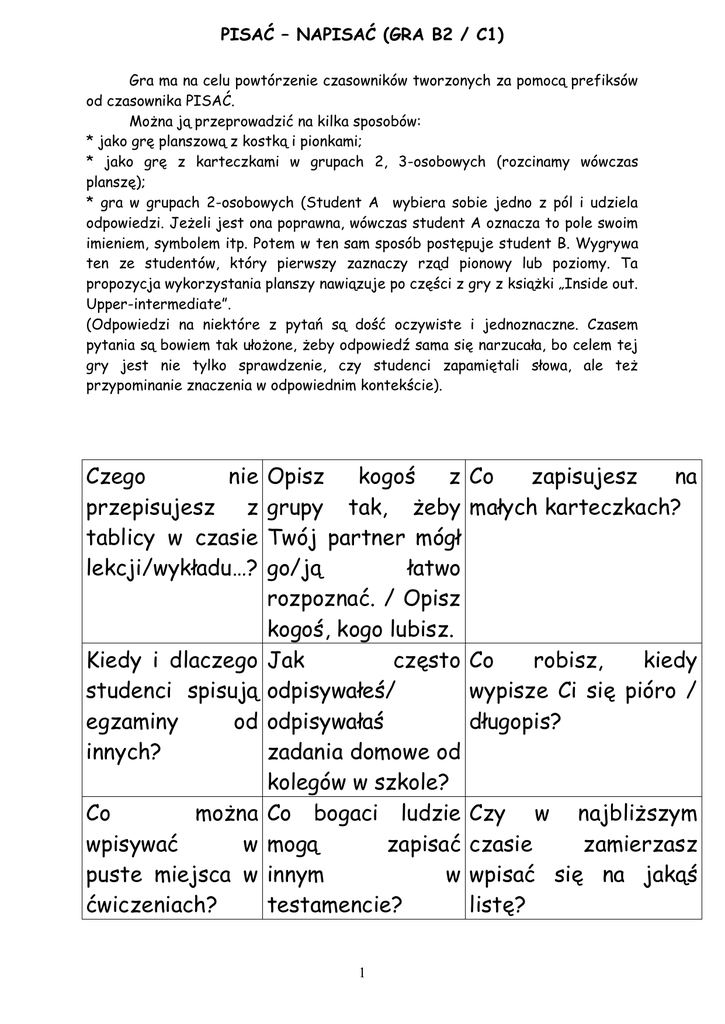 PISAĆ – NAPISAĆ (GRA B2 / C1) Gra ma na celu powtórzenie czasowników tworzonych za pomocą prefiksów od czasownika PISAĆ. Można ją przeprowadzić na kilka sposobów: * jako grę planszową z kostką i pionkami; * jako grę z karteczkami w grupach 2, 3-osobowych (rozcinamy wówczas planszę); * gra w grupach 2-osobowych (Student A wybiera sobie jedno z pól i udziela odpowiedzi. Jeżeli jest ona poprawna, wówczas student A oznacza to pole swoim imieniem, symbolem itp. Potem w ten sam sposób postępuje student B. Wygrywa ten ze studentów, który pierwszy zaznaczy rząd pionowy lub poziomy. Ta propozycja wykorzystania planszy nawiązuje po części z gry z książki „Inside out. Upper-intermediate”. (Odpowiedzi na niektóre z pytań są dość oczywiste i jednoznaczne. Czasem pytania są bowiem tak ułożone, żeby odpowiedź sama się narzucała, bo celem tej gry jest nie tylko sprawdzenie, czy studenci zapamiętali słowa, ale też przypominanie znaczenia w odpowiednim kontekście). Czego nie przepisujesz z tablicy w czasie lekcji/wykładu…? Kiedy i dlaczego studenci spisują egzaminy od innych? Co można wpisywać w puste miejsca w ćwiczeniach? Opisz kogoś z grupy tak, żeby Twój partner mógł go/ją łatwo rozpoznać. / Opisz kogoś, kogo lubisz. Jak często odpisywałeś/ odpisywałaś zadania domowe od kolegów w szkole? Co bogaci ludzie mogą zapisać innym w testamencie? 1 Co zapisujesz na małych karteczkach? Co robisz, kiedy wypisze Ci się pióro / długopis? Czy w najbliższym czasie zamierzasz wpisać się na jakąś listę? Jak często i Czy kiedy czytasz gdzie się nowy tekst po podpisujesz? polsku wypisujesz z niego nowe słowa? Czy w Co robisz, kiedy najbliższym zapiszesz cały czasie planujesz zeszyt? wypisać się z czegoś (np. z biblioteki…)? Co byś Co można zapisać zrobił/zrobiła, na płycie CD? gdyby ktoś przepisał Ci dom, działkę…? Kiedy odpisujesz Co i gdzie można na maile, listy, podpisać? smsy…? Dlaczego Co chłopcy popisują uczniowie/studenci się przed sobą, mogą spisać z np. siłą Internetu? fizyczną? 2 Co w czasie ostatniej wizyty przepisał Ci lekarz? Jak wpisałbyś się / wpisałabyś się komuś do albumu, pamiętnika…? Czy w najbliższym czasie planujesz zapisać się na jakiś kurs, do biblioteki…? Co można dopisać i gdzie? Gdybyś był/była lekarzem, co zapisałbyś/zapisałabyś Pacjentowi na chandrę?
