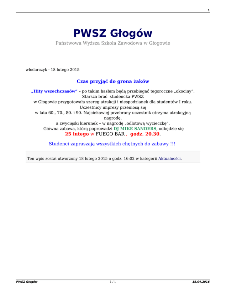 1 PWSZ Głogów Państwowa Wyższa Szkoła Zawodowa w Głogowie wlodarczyk · 18 lutego 2015 Czas przyjąć do grona żaków „Hity wszechczasów” – po takim hasłem będą przebiegać tegoroczne „okociny”. Starsza brać studencka PWSZ w Głogowie przygotowała szereg atrakcji i niespodzianek dla studentów I roku. Uczestnicy imprezy przeniosą się w lata 60., 70., 80. i 90. Najciekawiej przebrany uczestnik otrzyma atrakcyjną nagrodę, a zwycięski kierunek – w nagrodę „odlotową wycieczkę”. Główna zabawa, którą poprowadzi DJ MIKE SANDERS, odbędzie się 25 lutego w FUEGO BAR , godz. 20.30. Studenci zapraszają wszystkich chętnych do zabawy !!! Ten wpis został utworzony 18 lutego 2015 o godz. 16:02 w kategorii Aktualności. PWSZ Głogów -1/1- 15.04.2016