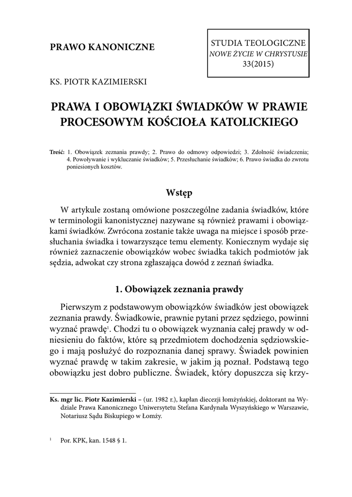 STUDIA TEOLOGICZNE PRAWO KANONICZNE NOWE ŻYCIE W CHRYSTUSIE 33(2015) KS. PIOTR KAZIMIERSKI PRAWA I OBOWIĄZKI ŚWIADKÓW W PRAWIE PROCESOWYM KOŚCIOŁA KATOLICKIEGO Treść: 1. Obowiązek zeznania prawdy; 2. Prawo do odmowy odpowiedzi; 3. Zdolność świadczenia; 4. Powoływanie i wykluczanie świadków; 5. Przesłuchanie świadków; 6. Prawo świadka do zwrotu poniesionych kosztów. Wstęp W artykule zostaną omówione poszczególne zadania świadków, które w terminologii kanonistycznej nazywane są również prawami i obowiązkami świadków. Zwrócona zostanie także uwaga na miejsce i sposób przesłuchania świadka i towarzyszące temu elementy. Koniecznym wydaje się również zaznaczenie obowiązków wobec świadka takich podmiotów jak sędzia, adwokat czy strona zgłaszająca dowód z zeznań świadka. 1. Obowiązek zeznania prawdy Pierwszym z podstawowym obowiązków świadków jest obowiązek zeznania prawdy. Świadkowie, prawnie pytani przez sędziego, powinni wyznać prawdę1. Chodzi tu o obowiązek wyznania całej prawdy w odniesieniu do faktów, które są przedmiotem dochodzenia sędziowskiego i mają posłużyć do rozpoznania danej sprawy. Świadek powinien wyznać prawdę w takim zakresie, w jakim ją poznał. Podstawą tego obowiązku jest dobro publiczne. Świadek, który dopuszcza się krzyKs. mgr lic. Piotr Kazimierski – (ur. 1982 r.), kapłan diecezji łomżyńskiej, doktorant na Wydziale Prawa Kanonicznego Uniwersytetu Stefana Kardynała Wyszyńskiego w Warszawie, Notariusz Sądu Biskupiego w Łomży. 1 Por. KPK, kan. 1548 § 1. Ks. Piotr Kazimierski woprzysięstwa, powinien być sprawiedliwie ukarany2. Znaczenie zeznań świadków wynika nie tylko z ich zdolności przypominania zdarzeń, lecz przede wszystkim z tego że są oni szczególnie zobowiązani do mówienia prawdy. Prawodawca nakłada na sędziego obowiązek przypominania stronom i świadkom o poważnym obowiązku „mówienia całej i tylko prawdy”3. 2. Prawo do odmowy odpowiedzi Jednym z podstawowych praw przysługujących świadkom jest prawo do odmowy odpowiedzi. Od tego obowiązku, są zwolnieni: - duchowni w odniesieniu do tych faktów, które im ujawniono ze względu na ich świętą posługę; urzędnicy państwowi, lekarze, położne, adwokaci, notariusze i inni zobowiązani do zachowania tajemnicy urzędowej czy zawodowej, nawet z racji udzielonej porady, w odniesieniu do spraw objętych tą tajemnicą; - ci, którzy wskutek swoich zeznań obawiają się zniesławienia, złego traktowania lub innych poważnych złych następstw w stosunku do siebie lub współmałżonka bądź bliskich krewnych lub powinowatych. Sędzia nie ma obowiązku badania słuszności przyczyny zwalniającej świadka od udzielenia odpowiedzi na pytania sędziego. Gdyby świadek, mimo przyczyny tłumaczącej udzielił odpowiedzi sędziemu, sędzia może te odpowiedzi potraktować jako materiał dowodowy, chyba, że chodziłoby o wiadomości zasłyszane ze spowiedzi lub z okazji spowiedzi4. 3. Zdolność świadczenia Każdy może wystąpić w charakterze świadka, chyba, że prawo nie pozwala mu na to bądź całkowicie, bądź częściowo. Jest więc zasadą, że każdy może być świadkiem, jeśli ma zdolność do postrzegania i ko2 3 4 Por. T. Pawluk, Prawo Kanoniczne według Kodeksu Jana Pawła II, t. 4,Doczesne dobra Kościoła, Sankcje w Kościele, Procesy, Olsztyn 1990, s. 263. Por. R. Sztychmiler, Przesłuchanie świadków w procesie kanonicznym w: Dowodzenie w procesach kościelnych (red. J. Krzywkowska, R Sztychmiler), Olsztyn 2014, s. 50; DC art. 167 §1 Por. T. Pawluk, Prawo Kanoniczne…,dz. cyt., s. 263. 418 Prawa i obowiązki świadków w prawie procesowym Kościoła Katolickiego munikowania swych spostrzeżeń. W świetle ustawy nikt nie może być zdyskwalifikowany jako świadek, chyba, że jego doznania psychofizyczne budzą zastrzeżenie. Ustawodawca kodeksowy jednak w stosunku do niektórych osób, mimo ich zdolności świadczenia, wprowadza pewne ograniczenia co do możliwości składania zeznań w sądzie. Podstawą tych ograniczeń są względy etyczne oraz wzgląd na dobro dusz. Ograniczenia sprawiają, że świadek nie może złożyć żadnych zeznań w sądzie5 albo może je złożyć pod pewnymi warunkami6. 3.1 Zakaz dopuszczania do świadczenia ze względu na psychofizyczne właściwości osoby Nie powinno się dopuszczać do składania zeznań osób małoletnich, którzy nie ukończyli czternastego roku życia, oraz osób upośledzonych pod względem umysłowym; można ich jednak przesłuchać na podstawie dekretu sędziego, zawierającego uzasadnienie takiego przesłuchania7. Niedojrzałych uważa się za nieodpowiednich do świadczenia, gdyż ich doznania psychofizyczne mogą budzić zastrzeżenia. Osoby takie zazwyczaj mają ograniczoną zdolność skupienia uwagi, łatwo ulegają sugestii, mieszają fakty, a ponadto są skłonne do fantazjowania. Niekiedy jednak sędzia, kierując się roztropnością, może przyjąć zeznania od osoby niedojrzałej, która osiągnęła odpowiedni poziom rozwoju, jeśliby jej zeznania jako świadka bezpośredniego okazały się konieczne. W takim wypadku sędzia powinien uzasadnić w dekrecie konieczność przesłuchania. Osoby niedojrzałe składają zeznania z reguły bez przysięgania8. To co wyżej powiedziano o niedojrzałych, odnosi się odpowiednio także do osób upośledzonych pod względem umysłowym. Do właściwej oceny zeznań takich osób, w razie potrzeby, mogą przyczynić się uwagi biegłego dotyczące osobowości świadka, w szczególności co do jego rozwoju umysłowego oraz zdolności spostrzegania i odtwarzania spostrzeżeń9. 5 6 7 8 9 Por. KPK, kan. 1550 § 2. Por. T. Pawluk, Prawo Kanoniczne…, dz. cyt., s. 263-264. Por. KPK, kan. 1550 § 1. Por. T. Pawluk, Prawo Kanoniczne…, dz. cyt., s. 264. Tamże. 419 Ks. Piotr Kazimierski 3.2 Świadkowie niezdatni Jeżeli chodzi o świadków niezdatnych, za takich należy uznać tyc
