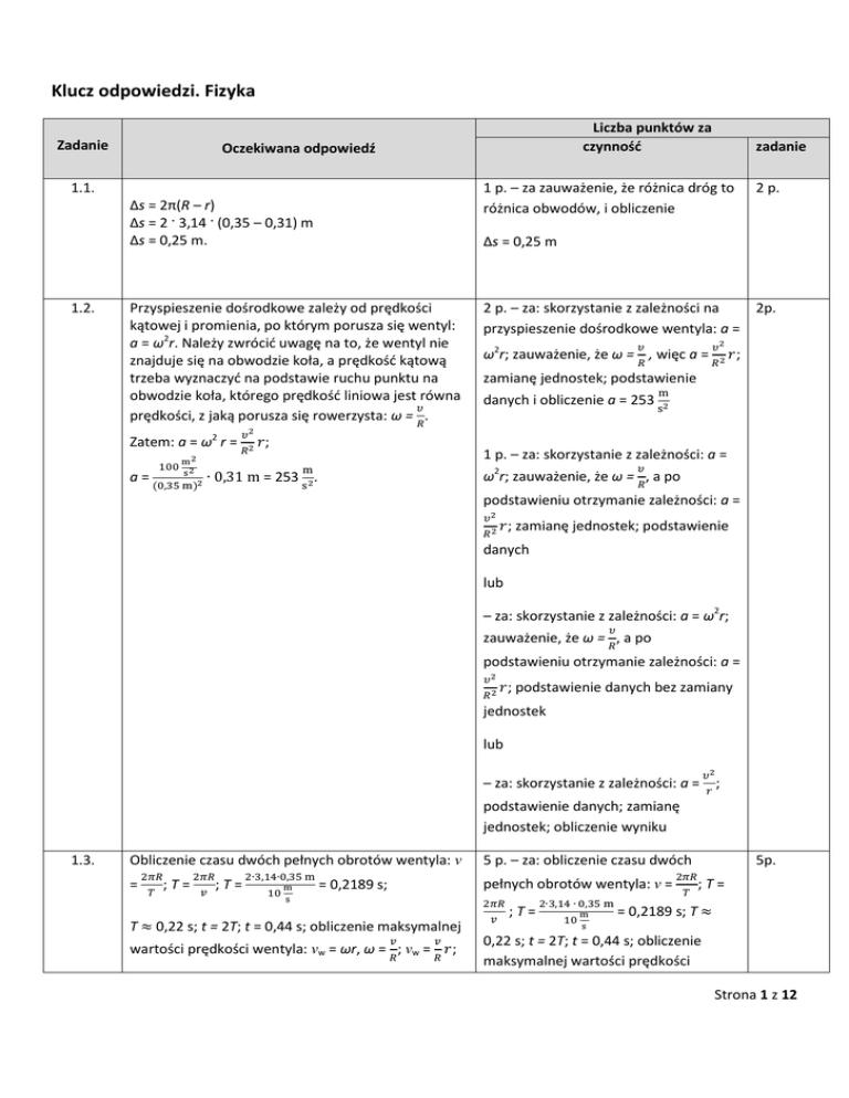 Klucz odpowiedzi. Fizyka Zadanie Liczba punktów za czynność Oczekiwana odpowiedź 1.1. 1 p. – za zauważenie, że różnica dróg to różnica obwodów, i obliczenie Δs = 2π(R – r) Δs = 2 · 3,14 · (0,35 – 0,31) m Δs = 0,25 m. 1.2. ; a= = 253 . 2 p. Δs = 0,25 m Przyspieszenie dośrodkowe zależy od prędkości kątowej i promienia, po którym porusza się wentyl: a = ω2r. Należy zwrócić uwagę na to, że wentyl nie znajduje się na obwodzie koła, a prędkość kątową trzeba wyznaczyć na podstawie ruchu punktu na obwodzie koła, którego prędkość liniowa jest równa prędkości, z jaką porusza się rowerzysta: ω = . Zatem: a = ω2 r = zadanie 2 p. – za: skorzystanie z zależności na przyspieszenie dośrodkowe wentyla: a = ω2r; zauważenie, że ω = , więc a = 2p. ; zamianę jednostek; podstawienie danych i obliczenie a = 253 1 p. – za: skorzystanie z zależności: a = ω2r; zauważenie, że ω = , a po podstawieniu otrzymanie zależności: a = ; zamianę jednostek; podstawienie danych lub – za: skorzystanie z zależności: a = ω2r; zauważenie, że ω = , a po podstawieniu otrzymanie zależności: a = ; podstawienie danych bez zamiany jednostek lub – za: skorzystanie z zależności: a = ; podstawienie danych; zamianę jednostek; obliczenie wyniku 1.3. Obliczenie czasu dwóch pełnych obrotów wentyla: v 5 p. – za: obliczenie czasu dwóch = pełnych obrotów wentyla: v = ;T= ;T= = 0,2189 s; ;T= T 0,22 s; t = 2T; t = 0,44 s; obliczenie maksymalnej wartości prędkości wentyla: vw = ωr, ω = ; vw = ; 5p. ;T= = 0,2189 s; T 0,22 s; t = 2T; t = 0,44 s; obliczenie maksymalnej wartości prędkości Strona 1 z 12 vw = = 8,86 ; zauważenie, że w kierunku poziomym wentyl względem rowerzysty wykonuje drgania. Jeżeli przyjmiemy, że początkowo wentyl znajdował się na wysokości osi koła od strony rowerzysty, to zmiana poziomej składowej prędkości opisywana będzie funkcją sinus. wentyla: vw = ωr; ω = ; vw = ; vw = = 8,86 ; zauważenie, że w kierunku poziomym względem rowerzysty wentyl wykonuje drgania; narysowanie, wyskalowanie i opisanie osi; sporządzenie wykresu sinusoidalnego lub cosinusoidalnego 4 p. – za: skorzystanie z zależności: v = v π do obliczenia czasu; skorzystanie 8,86 z zależności: ω = , vw = 0 0,22 0,44 t [s] -8,86 Jeżeli przyjmiemy, że początkowo wentyl znajdował się w najwyższym położeniu, to zmiana poziomej składowej jego prędkości opisywana będzie funkcją cosinus o takiej samej amplitudzie i takim samym okresie jak na wykresie wyżej. do obliczenia wartości prędkości wentyla; zauważenie, że w kierunku poziomym wentyl względem rowerzysty wykonuje drgania; narysowanie, wyskalowanie i opisanie osi; sporządzenie wykresu sinusoidalnego lub cosinusoidalnego lub – za: obliczenie czasu z zależności: v = π , ; obliczenie wartości prędkości wentyla z zależności: vw = ωr; ω = ; vw = ; zauważenie, że w kierunku poziomym względem rowerzysty wentyl wykonuje drgania; narysowanie, wyskalowanie i opisanie osi 3 p. – za: skorzystanie z zależności: v = π do obliczenia czasu; skorzystanie z zależności: vw = ωr, ω = , vw = do obliczenia wartości prędkości; błędne obliczenie czasu lub prędkości; zauważenie, że w kierunku poziomym wentyl względem rowerzysty wykonuje drgania; narysowanie, wyskalowanie i opisanie osi, błędne sporządzenie wykresu Strona 2 z 12 2 p. – za: obliczenie czasu dwóch pełnych obrotów wentyla; skorzystanie z zależności: v = π i obliczenie czasu jednego pełnego obrotu T = 0,22 s; narysowanie, wyskalowanie i opisanie osi, brak wykresu 1 p. – za: skorzystanie z zależności: v = π i obliczenie czasu jednego pełnego obrotu 1.4. Przemieszczenie wentyla tylnego koła względem ramy roweru po czasie równym jednemu okresowi wynosi 1 p. – za zaznaczenie dokończenia A 1p. A. 0 cm. B. 30 cm. C. 70 cm. D. 188 cm. 2.1 → 2.2. E= ;λ= + + 1 p. – za poprawne zapisanie reakcji 1p. rozpadu (w zapisie można nie uwzględnić antyneutrina elektronowego ) 2 p. – za: zamianę MeV na J; ; zastosowanie zależności: E = 1eV = 1,6·10-19 J ; podstawienie danych i obliczenie długości fali: λ = 9,33 · 10–13 m λ= λ = 9,33 · 10 2p. 1 p. – za: zamianę MeV na J; –13 m zastosowanie zależności: E = ; podstawienie danych, popełnienie błędów rachunkowych lub – za zastosowanie zależności: E = ; podstawienie danych, bez zamiany MeV na J Strona 3 z 12 2.3. 3 p. – za: narysowanie, opisanie i wyskalowanie osi; sporządzenie wykresu m [g] 3p. 56,25 52,5 2 p. – za: narysowanie, opisanie i błędne wyskalowanie osi; sporządzenie wykresu 45 30 0 0 5,26 10,52 15,78 1 p. – za: narysowanie, opisanie i wyskalowanie osi; błędne sporządzenie wykresu 21,04 t [lat] 3.1. 2 p. – za zastosowanie prawa = powszechnego ciążenia: ; = 2p. ; = = 1,06 = = ; 1 p. – za: zastosowanie prawa powszechnego ciążenia; podstawienie danych, popełnienie błędów rachunkowych = 1,06 lub – za obliczenie siły oddziaływania Ziemi i Słońca tylko w jednym przypadku lub – za odwrotne obliczenie stosunku sił 3.2. P 1. 2. 3. Pory roku zależą od odległości Ziemi od Słońca. Energia mechaniczna Ziemi w jej ruchu wokół Słońca nie jest zachowana, ponieważ zmienia się odległość Ziemi od Słońca. W wyniku oddziaływania grawitacyjnego między Słońcem a Ziemią na planetę działa siła F X X 2 p. – za zaznaczenie w tabeli: 1. F; 2. F; 3. P; 4. P 2p. 1 p. – za zaznaczenie w tabeli tylko dwu poprawnych odpowiedzi X Strona 4 z 12 4. grawitacji, która pełni funkcję siły dośrodkowej; dlatego Ziemia krąży wokół Słońca. 4. Zmiany odległości Ziemi od Słońca i prędkości liniowej planety zachodzą w taki sposób, że promień wodzący poprowadzony od Słońca do planety w równych przedziałach czasu zakreśla jednakowe pola powierzchni. Praca wykonana przez siłę grawitacji X 1 p. – za zaznaczenie dokończenia B 1p. 2 p. – za: skorzystanie