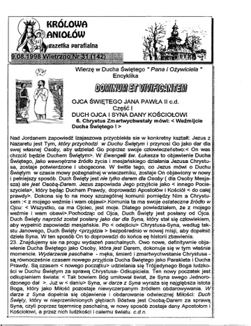 KRÓLOWA ANIOŁÓW gazetka parafialna W ierzę w Ducha Świętego " Pana i O żyw iciela" Encyklika M" OJCA ŚW IĘTEG O JANA PAW ŁA II c.d. Część I DUCH OJCA I SYNA DANY KO ŚCIO ŁO W I 6. Chrystus Zmartwychwstały mówi: < Weźmijcie Ducha Świętego! > Nad Jordanem zapowiedź Izajaszowa przyoblekła sie w konkretny kształt: Jezus z Nazaretu jest Tym, k tó ry p rz y c h o d z i w D u ch u Ś w iętym i przynosi Go jako dar dla swej własnej O soby, aby udzielać Go poprzez swoje człowieczeństwo: < On was chrzcić będzie Duchem Świętym>. W E w angelii św. Ł u k a s z a to objawienie Ducha Świętego, ja k o w ew n ę trzn e źró d ło życia i mesjańskiego działania Jezusa Chrystu sa, zostaje potwierdzone i ubogacone. W świtle tego, co Jezus mówi o Duchu Świętym w czasie mowy pożegnalnej w wieczerniku, zostaje On objawiony w nowy i pełniejszy sposób. Duch Święty jest nie tylko d a re m dla O s o b y ( dla Osoby Mesja sza) ale je s t O sobą-D arem . Jezus zapowiada Jego przyjście jako < innego Pocie szyciela^ który będąc Duchem Prawdy, doprowadzi Apostołów i Kościół < do całej prawdy>. Dokona się to na mocy szczególnej komunii pomiędzy Nim a Chrystu sem :< z mojego weźmie i wam objawi>.Komunia ta ma swoje o sta te c z n e ź ródło w O jcu: < Wszystko, ca ma Ojciec, jest moje. Dlatego powiedziałem, że z mojego weźmie i wam obawi>. Pochodząc od Ojca, Duch Święty jest posłany od Ojca. Duch Święty n a p rz ó d został posłany ja k o d a r dla Syna, który stał się człowiekiem, aby wypełnić zapowiedzi mesjańskie. Po < odejściu> Chrystusa-Syna, według tek stu Janowego, Duch Święty <przyjdzie > bezpośrednio w nowej misji, aby dopełnić dzieła Syna. W ten sposób On to doprowadzi do końca eę historii zbawienia. 23. Znajdujemy sie na progu wydazeń paschalnych. Owo nowe, definitywnie obja wienie Ducha Świętego jako Osoby, która je s t Darem, dokonuje się w tym właśnie momencie. W yda rze n ie p a schalne - męka, śmierć i zmartwychwstanie Chrystusa są równocześnie czasem no w e g o przyjścia Ducha Świętego jako Parakleta i Ducha Prawdy. Są czasem < nowego początku> udzielania się Trójjedynego Boga ludzko ści w Duchu Świętym za sprawą Chrystusa- Odkupiciela. Ten nowy początek jest odkupieniem świata: < Tak bowiem Bóg umiłował świat, że Syna swego Jednorodzonego dał >. Już w < daniu> Syna, w da rze z S yna wyraża się najgłębsza istota Boga, który jako Miłość pozostaje niewyczerpanym źródłem obdarowywania. W darze z S yn a dopełnia się objawienie i obdarowanie odwiecznej Miłości: D uch Święty, który w nieprzeniknionych głębiach Bóstwa jest Osobą-Darem za sprawą Syna, czyli poprzez tajemnicę paschalną w nowy sposób zostaje dany Apostołom i Kościołowi, a przez nich ludzkości i całemu światu, c.d.n. NIEDZIELA 19 zw. R C. Wszechmogący, wieczny Boże, ośmielamy się Ciebie nazwać Ojcem, + umocnij w naszych sercach ducha przybranych dzieci,* abyśmy mogli osiągnąć obiecane dziedzictwo. Przez naszego Pana. S Ł O W O B o g a ży w eg o Czytanie I - Mdr 18, 6 - 9 Pobożni synowie dobrych składali w ukryciu ofiary i ustanowili zgodnie Boskie prawo, że te same dobra i niebezpieczeństwa święci podejmą jednakowo. Czytanie H - Hbr 11,1 - 2.8 - 1 2 Bracia: Wiara jest poręką tych dóbr, których się spodziewamy, dowodem tych rzeczywisto ści, których nie widzimy. Dzięki niej to przod kowie otrzymali świadectwo. Ewangelia - Łk 12, 32 - 48 Niech będą przepasane biodra wasze i zapalo ne pochodnie! A wy bądźcie podobni do ludzi, oczekujących swego pana, kiedy z uczty weselnej powróci, aby mu zaraz otwo rzyć, gdy nadejdzie i zakołacze. Szczęśliwi owi słudzy, których pan zastanie czuwa jących, gdy nadej dzie... Wy też bądź cie gotowi, gdyż o godzinie, której się nie domyślacie, Syn Człowieczy przyjdzie. 15 sierpnia Uroczystość WniebowzięciaNMP Boże, Ty wejrzałeś na pokorę Najświętszej Maryi Panny i wyniosłeś Ją do godności Matki Twojego Jedynego Syna, a w dniu dzisiejszym uwieńczyłeś Ją najwyższą chwałą, + spraw, abyśmy zbawieni przez śmierć i zmartwychwstanie Jezusa Chrystusa * przez Jej prośby mogli wejść do wiecznej chwały. Ewangelia - Łk 1, 39 - 56 W ted y Maryja rzekła: " Wielbi dusza moja Pana, i raduje się duch mój w Bogu, moim Zbawcy. Bo wejrzał na uniżenie Służebnicy swojej. Oto bowiem błogosła wić mnie będą odtąd wszystkie pokolenia" Maryjo zostałaś w yniesiona na Twój tron niebieski a Pan powiedział: "Przyjdź, wybrana, drogocenna Perło, w ejdź do m ieszkania życia w iecznego Melton z Sardes, II w. biegniesz w Panie, jest noc. Wędrowaliśmy wieczorem o zmierzchu. Tylko wyczuwaliśmy Twoją obecność, tak jakby w półmroku, ale zawierzyliśmy Twojej bliskości. Pozostań z nami, czuwaj nad nami w naszej podróży w naszej podróży życia. Wędrujemy o zmierzchu . Jutro jednak wzejdzie słońce. niebo Według legendy apostołowie nie znaleźli w grobie ciała Maryi, tylko kwiaty okalały zarys Jej postaci, a zapach ziół wypełniał powietrze. i A D.Dziś tj 9.08 o godz — \ 2100Apel Jasnogórski. □ z życia parafii Codziennie o godz. 2030 Msza św. a po niej Apel Jasnogórski. Modlimy się o trzeźwość w narodzie polskim i o zgodę i miłość między ludźmi. W modlitwach tych uczestniczyło: w niedz.- 50; w pon. -50; wtorek - 58; w środę- 56; we czw. 53 osoby. W piątek i sobotę nie liczyłem. A Ty ? □ W sobotę 15.08 Uroczystość Wniebowzięcia N.M.P. Msze św. jak w niedziele o 800 i o 1030 Po sumie poświęcenie owoców, ziół i kwiatów. W tym dniu jest odpust w Jasionce. □ W niedzielę 16.08 dzień modlitwy w intencji Ojca Świętego Jana Pawła II. Jest to także dzień imienin J.E.Ks Biskupa Stefana Mo skwy. □ Ostateczna decyzja o dzwonach. Bóg zapłać za ofiary na remont plebanii. W składanie ofiar włączyło się 160 rodzin, obojętnych pozostało 38 rodzin.