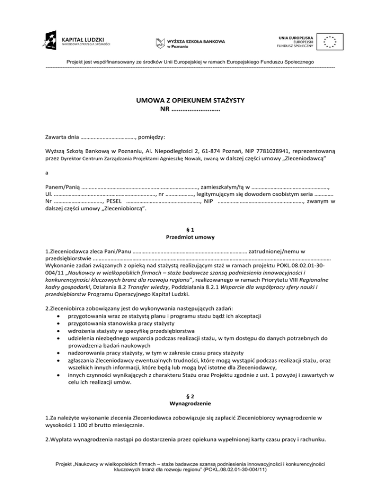 Projekt jest współfinansowany ze środków Unii Europejskiej w ramach Europejskiego Funduszu Społecznego -------------------------------------------------------------------------------------------------------------------------------------------------------------------------- UMOWA Z OPIEKUNEM STAŻYSTY NR ……………………… Zawarta dnia ………………………………., pomiędzy: Wyższą Szkołą Bankową w Poznaniu, Al. Niepodległości 2, 61-874 Poznań, NIP 7781028941, reprezentowaną przez Dyrektor Centrum Zarządzania Projektami Agnieszkę Nowak, zwaną w dalszej części umowy „Zleceniodawcą” a Panem/Panią ……………………………………………………………………., zamieszkałym/łą w ……………………………………………., Ul. ……………………………………………………………, nr ………………., legitymującym się dowodem osobistym seria …………. Nr ……………………………, PESEL ………………………………………….., NIP …………………………………………………., zwanym w dalszej części umowy „Zleceniobiorcą”. §1 Przedmiot umowy 1.Zleceniodawca zleca Pani/Panu …………………………………………………………………… zatrudnionej/nemu w przedsiębiorstwie ……………………………………………………………………………………………………………………………………………… Wykonanie zadań związanych z opieką nad stażystą realizującym staż w ramach projektu POKL.08.02.01-30004/11 „Naukowcy w wielkopolskich firmach – staże badawcze szansą podniesienia innowacyjności i konkurencyjności kluczowych branż dla rozwoju regionu”, realizowanego w ramach Priorytetu VIII Regionalne kadry gospodarki, Działania 8.2 Transfer wiedzy, Poddziałania 8.2.1 Wsparcie dla współpracy sfery nauki i przedsiębiorstw Programu Operacyjnego Kapitał Ludzki. 2.Zleceniobirca zobowiązany jest do wykonywania następujących zadań: przygotowania wraz ze stażystą planu i programu stażu bądź ich akceptacji przygotowania stanowiska pracy stażysty wdrożenia stażysty w specyfikę przedsiębiorstwa udzielenia niezbędnego wsparcia podczas realizacji stażu, w tym dostępu do danych potrzebnych do prowadzenia badań naukowych nadzorowania pracy stażysty, w tym w zakresie czasu pracy stażysty zgłaszania Zleceniodawcy ewentualnych trudności, które mogą wystąpić podczas realizacji stażu, oraz wszelkich innych informacji, które będą lub mogą być istotne dla Zleceniodawcy, innych czynności wynikających z charakteru Stażu oraz Projektu zgodnie z ust. 1 powyżej i zawartych w celu ich realizacji umów. §2 Wynagrodzenie 1.Za należyte wykonanie zlecenia Zleceniodawca zobowiązuje się zapłacić Zleceniobiorcy wynagrodzenie w wysokości 1 100 zł brutto miesięcznie. 2.Wypłata wynagrodzenia nastąpi po dostarczenia przez opiekuna wypełnionej karty czasu pracy i rachunku. Projekt „Naukowcy w wielkopolskich firmach – staże badawcze szansą podniesienia innowacyjności i konkurencyjności kluczowych branż dla rozwoju regionu” (POKL.08.02.01-30-004/11) Projekt jest współfinansowany ze środków Unii Europejskiej w ramach Europejskiego Funduszu Społecznego -------------------------------------------------------------------------------------------------------------------------------------------------------------------------- 3.Zapłata nastąpi z dołu na podstawie prawidłowo wystawionego rachunku do 10go każdego miesiąca, płatne do 20tego każdego miesiąca następującego po miesiącu, którego dotyczy wynagrodzenie. Zapłata nastąpi pod warunkiem dostarczenia wraz z rachunkiem, o którym mowa w zdaniu poprzedzającym karty czasu pracy Opiekuna. §3 Postanowienia końcowe 1.Wszystkie zmiany i uzupełnienia niniejszej umowy mogą być dokonywane za zgodą obu stron w formie pisemnej pod rygorem nieważności. 2.W sprawach nieuregulowanych niniejszej umowy mają zastosowanie odpowiednie przepisy Kodeksu Cywilnego. 3.Wszystkie ewentualne spory wynikające z niniejszej umowy, strony będą starać się rozstrzygnąć polubownie. W razie nie osiągnięcia porozumienia, właściwym dla rozstrzygnięcia sporu jest sąd właściwy ze względu na siedzibę Zleceniodawcy. 4.Umowa niniejsza sporządzona została w trzech jednobrzmiących egzemplarzach, z których jeden otrzymuje Zleceniobiorca. 5. Umowa zostaje zawarta na czas wykonywania przez Stażystę Stażu w Przedsiębiorstwie. 6. Umowa może zostać rozwiązana przez Zleceniodawcę w trybie natychmiastowym bez zachowania okresu wypowiedzenia w następujących przypadkach: a) skreślenia Stażysty ze Stażu, b) utraty przez Zleceniobiorcę statusu osoby zatrudnionej w Przedsiębiorstwie, c) naruszania przez Zleceniobiorcę warunków niniejszej umowy pomimo wezwania Zleceniodawcy do zaniechania tego naruszania, d) innego istotnego naruszenia warunków niniejszej umowy przez Zleceniobiorcę. 7. Terminom stosowanym w niniejszej umowie nadaje się znaczenie w niej wyraźnie wskazane lub wskazane w regulaminie projektu, który stanowi integralny załącznik do niniejszej umowy. W szczególności Strony dopuszczają prawo Zleceniodawcy do wprowadzania zmian w tym regulaminie projektu oraz prawo Zleceniodawcy do interpretacji tego regulaminu projektu zgodnie z wytycznymi lub innymi uwagami instytucji finansujących projekt lub w inny sposób uczestniczących w realizacji projektu jako finansowanego ze środków zgodnie z treścią § 1 przedmiotowego regulaminu projektu. Załączniki: Wzór rachunku Wzór karty czasu pracy Zleceniodawca ………………………………………….. Zleceniobiorca ……………………………………… Projekt „Naukowcy w wielkopolskich firmach – staże badawcze szansą podniesienia innowacyjności i konkurencyjności kluczowych branż dla rozwoju regionu” (POKL.08.02.01-30-00