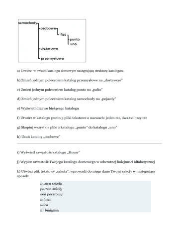 a) Utwórz w swoim katalogu domowym następującą strukturę katalogów. b) Zmień jednym poleceniem katalog przemysłowe na „dostawcze” c) Zmień jednym poleceniem katalog punto na „palio” d) Zmień jednym poleceniem katalog samochody na „pojazdy” e) Wyświetl drzewo bieżącego katalogu f) Utwórz w katalogu punto 3 pliki tekstowe o nazwach: jeden.txt, dwa.txt, trzy.txt g) Skopiuj wszystkie pliki z katalogu „punto” do katalogu „uno” h) Usuń katalog „osobowe” i) Wyświetl zawartość katalogu „Home” j) Wypisz zawartość Twojego katalogu domowego w odwrotnej kolejności alfabetycznej k) Utwórz plik tekstowy „szkoła”, wprowadź do niego dane Twojej szkoły w następujący sposób: nazwa szkoły patron szkoły kod pocztowy miasto ulica nr budynku l) Wypisz zawartość pliku „szkoła” na ekran m) Wypisz 2 pierwsze linie pliku „szkoła” na ekran n) Wypisz 3 ostatnie linie pliku „szkoła” na ekran