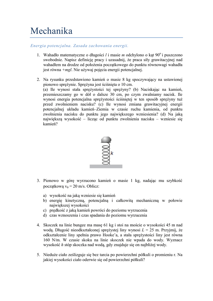 Mechanika Energia potencjalna. Zasada zachowania energii. 1. Wahadło matematyczne o długości l i masie m odchylono o kąt 90o i puszczono swobodnie. Napisz definicję pracy i uzasadnij, że praca siły grawitacyjnej nad wahadłem na drodze od położenia początkowego do punktu równowagi wahadła jest równa +mgl. Nie używaj pojęcia energii potencjalnej. 2. Na rysunku przedstawiono kamień o masie 8 kg spoczywający na ustawionej pionowo sprężynie. Sprężyna jest ściśnięta o 10 cm. (a) Ile wynosi stała sprężystości tej sprężyny? (b) Naciskając na kamień, przemieszczamy go w dół o dalsze 30 cm, po czym zwalniamy nacisk. Ile wynosi energia potencjalna sprężystości ściśniętej w ten sposób sprężyny tuż przed zwolnieniem nacisku? (c) Ile wynosi zmiana grawitacyjnej energii potencjalnej układu kamień–Ziemia w czasie ruchu kamienia, od punktu zwolnienia nacisku do punktu jego największego wzniesienia? (d) Na jaką największą wysokość – licząc od punktu zwolnienia nacisku – wzniesie się kamień? 3. Pionowo w górę wyrzucono kamień o masie 1 kg, nadając mu szybkość początkową v0 = 20 m/s. Oblicz: a) wysokość na jaką wzniesie się kamień b) energię kinetyczną, potencjalną i całkowitą mechaniczną w połowie największej wysokości c) prędkość z jaką kamień powróci do poziomu wyrzucenia d) czas wznoszenia i czas spadania do poziomu wyrzucenia 4. Skoczek na linie bungee ma masę 61 kg i stoi na moście o wysokości 45 m nad wodą. Długość nieodkształconej sprężystej liny wynosi L = 25 m. Przyjmij, że odkształcenie liny spełnia prawo Hooke’a, a stała sprężystości liny jest równa 160 N/m. W czasie skoku na linie skoczek nie wpada do wody. Wyznacz wysokość h stóp skoczka nad wodą, gdy znajduje się on najbliżej wody. 5. Nieduże ciało ześlizguje się bez tarcia po powierzchni półkuli o promieniu r. Na jakiej wysokości ciało oderwie się od powierzchni półkuli? 6. Ciało o ciężarze 44 N pchnięto w górę po równi pochyłej, nachylonej do poziomu pod kątem 30 stopni, z prędkością początkową 5 m/s. Okazało się, że ciało przebyło drogę 1,5 m, zatrzymało się i ześliznęło w dół. Obliczyć siłę tarcia (zakładając, że siła ta ma wartość stałą) oraz prędkość v ciała przy podstawie równi. 7. Sprawdzić czy siła jest zachowawcza (wsk. Należy policzyć rot F): 8. Energia potencjalna, odpowiadająca pewnemu dwuwymiarowemu polu sił, wyraża sie wzorem: U(x, y) =1/2 k (x2 + y2) (a) Wyznaczyć Fx i Fy oraz przedstawić wektor siły w każdym punkcie przy pomocy współrzędnych x i y. (b) Znaleźć Fr oraz Fθ oraz przedstawić wektor siły w każdym punkcie przy pomocy współrzędnych biegunowych r i θ tego punktu.
