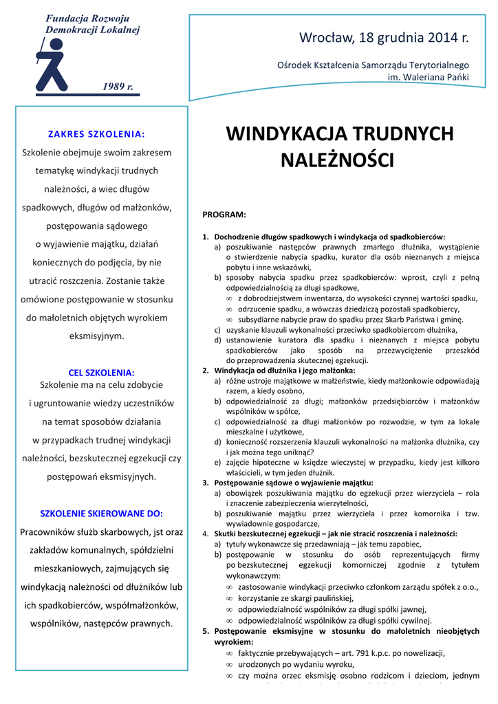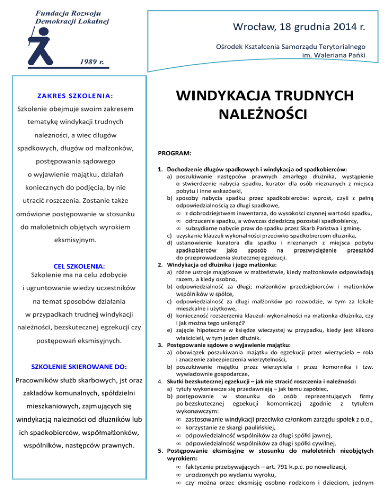 RozwiązaniaWrocław, informatyczne 18 grudnia 2014 r. Ośrodek Kształcenia Samorządu Terytorialnego im. Waleriana Pańki ZAKRES SZKOLENIA: Szkolenie obejmuje swoim zakresem tematykę windykacji trudnych WINDYKACJA TRUDNYCH NALEŻNOŚCI należności, a wiec długów spadkowych, długów od małżonków, PROGRAM: postępowania sądowego o wyjawienie majątku, działań koniecznych do podjęcia, by nie utracić roszczenia. Zostanie także omówione postępowanie w stosunku do małoletnich objętych wyrokiem eksmisyjnym. CEL SZKOLENIA: Szkolenie ma na celu zdobycie i ugruntowanie wiedzy uczestników na temat sposobów działania w przypadkach trudnej windykacji należności, bezskutecznej egzekucji czy postępowań eksmisyjnych. SZKOLENIE SKIEROWANE DO: Pracowników służb skarbowych, jst oraz zakładów komunalnych, spółdzielni mieszkaniowych, zajmujących się windykacją należności od dłużników lub ich spadkobierców, współmałżonków, wspólników, następców prawnych. 1. Dochodzenie długów spadkowych i windykacja od spadkobierców: a) poszukiwanie następców prawnych zmarłego dłużnika, wystąpienie o stwierdzenie nabycia spadku, kurator dla osób nieznanych z miejsca pobytu i inne wskazówki, b) sposoby nabycia spadku przez spadkobierców: wprost, czyli z pełną odpowiedzialnością za długi spadkowe, • z dobrodziejstwem inwentarza, do wysokości czynnej wartości spadku, • odrzucenie spadku, a wówczas dziedziczą pozostali spadkobiercy, • subsydiarne nabycie praw do spadku przez Skarb Państwa i gminę. c) uzyskanie klauzuli wykonalności przeciwko spadkobiercom dłużnika, d) ustanowienie kuratora dla spadku i nieznanych z miejsca pobytu spadkobierców jako sposób na przezwyciężenie przeszkód do przeprowadzenia skutecznej egzekucji. 2. Windykacja od dłużnika i jego małżonka: a) różne ustroje majątkowe w małżeństwie, kiedy małżonkowie odpowiadają razem, a kiedy osobno, b) odpowiedzialność za długi; małżonków przedsiębiorców i małżonków wspólników w spółce, c) odpowiedzialność za długi małżonków po rozwodzie, w tym za lokale mieszkalne i użytkowe, d) konieczność rozszerzenia klauzuli wykonalności na małżonka dłużnika, czy i jak można tego uniknąć? e) zajęcie hipoteczne w księdze wieczystej w przypadku, kiedy jest kilkoro właścicieli, w tym jeden dłużnik. 3. Postępowanie sądowe o wyjawienie majątku: a) obowiązek poszukiwania majątku do egzekucji przez wierzyciela – rola i znaczenie zabezpieczenia wierzytelności, b) poszukiwanie majątku przez wierzyciela i przez komornika i tzw. wywiadownie gospodarcze, 4. Skutki bezskutecznej egzekucji – jak nie stracić roszczenia i należności: a) tytuły wykonawcze się przedawniają – jak temu zapobiec, b) postępowanie w stosunku do osób reprezentujących firmy po bezskutecznej egzekucji komorniczej zgodnie z tytułem wykonawczym: • zastosowanie windykacji przeciwko członkom zarządu spółek z o.o., • korzystanie ze skargi paulińskiej, • odpowiedzialność wspólników za długi spółki jawnej, • odpowiedzialność wspólników za długi spółki cywilnej. 5. Postępowanie eksmisyjne w stosunku do małoletnich nieobjętych wyrokiem: • faktycznie przebywających – art. 791 k.p.c. po nowelizacji, • urodzonych po wydaniu wyroku, • czy można orzec eksmisję osobno rodzicom i dzieciom, jednym przyznać a drugich pozbawić prawa do lokalu socjalnego? DANE DO KONTAKTU: Ośrodek Kształcenia Samorządu Terytorialnego im. Waleriana Pańki 40-014 Katowice ul. Mariacka 1 NIP 522-000-18-95 tel/fax. 32 259 86 73, 32 253 84 09 e-mail: [email protected] www.okst.pl ZGŁOSZENIA: Wypełnioną kartę zgłoszenia należy przesłać mailem lub faksem do 15 grudnia 2014 r. Brak pisemnej rezygnacji min. trzy dni przed szkoleniem będzie równoznaczny z obciążeniem Państwa pełnym kosztem szkolenia. Uwaga: Liczba miejsc ograniczona. OSOBA DO KONTAKTU: Barbara Tekień, tel. 32 206 98 43 w. 34, [email protected] Miejsce szkolenia: Wrocław, siedziba Ośrodka, Piłsudskiego 49-57, III piętro. ul. Marszałka J. Termin i godzina: 18 grudnia 2014 r., godz. 10.00 – 15.00. Cena: 339 zł netto od osoby, zwolnione z VAT w przypadku finansowania szkolenia ze środków publicznych. cena zawiera materiały szkoleniowe, zaświadczenie o ukończeniu szkolenia, poczęstunek i serwis kawowy. RABAT 10% za każdą następną osobę zgłoszoną z tej samej instytucji. Karta zgłoszenia – kod szkolenia: 1232/14D/T Nazwa Nabywcy (dane do FVAT):.................................................................................………………………………………… Ulica: ........................................... Miejscowość…………………..………………kod pocztowy………….….………………………. NIP: ............................................................. Tel......................................…………e-mail………………………..……………… 1. ............................................................................................................................................................................. imię i nazwisko, (wypełnić drukowanymi) wydział/ stanowisko 2............................................................................................................................................................RABAT 10% imię i nazwisko, (wypełnić drukowanymi) wydział/ stanowisko Oświadczam, że szkolenie dla ww. pracowników jest kształceniem zawodowym finansowanym w całości lub co najmniej 70% ze środków publicznych (właściwe zaznaczyć) TAK / NIE ......…………………………………. Podpis UWAGA! Ilość miejsc ograniczona. O udziale w szkoleniu decyduje kolejność szkoleń. Zgłoszenie na szkolenie musi zostać potwierdzone przesłaniem do Ośrodka karty zgłoszenia. Brak pisemnej rezygnacji ze szkolenia najpóźniej na trzy dni przed terminem będzie równozn