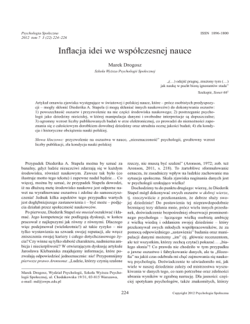 ISSN 1896-1800 Psychologia Spo eczna 2012 tom 7 3 (22) 224–226 Inßacja idei we wspó czesnej nauce Marek Drogosz Szko a Wy!sza Psychologii Spo ecznej „(…) odej!" pragn#, znu$ony tym (…) jak nauk# w pacht bior% ignorantów stada” Szekspir, Sonet 661 Artyku omawia zjawiska wyst#puj%ce w !wiatowej i polskiej nauce, które – prócz osobistych predyspozycji – mog y sk oni" Diederika A. Stapela (i mog% sk ania" innych naukowców) do dokonywania oszustw: 1) powszechno!" oszustw i przyzwolenie na nie cz#!ci !rodowiska naukowego; 2) postrzeganie psychologii jako dziedziny nie!cis ej, w której manipulacja danymi i swobodne interpretacje s% dopuszczalne; 3) ogromny wzrost liczby publikowanych bada& w erze elektronicznej, co prowadzi do niemo$no!ci zapoznania si# z ca o!ciowym dorobkiem dowolnej dziedziny oraz utrudnia ocen# jako!ci bada&; 4) z a kondycja i historyczne obci%$enia nauki polskiej. S owa kluczowe: przyzwolenie na oszustwa w nauce, „nieoznaczono!"” psychologii, gwa towny wzrost liczby publikacji, z a kondycja nauki polskiej Przypadek Diederika A. Stapela mo$na by uzna" za banalny, gdy$ ludzie nieuczciwi zdarzaj% si# w ka$dym !rodowisku, równie$ naukowym. Zawsze tak by o (co ilustruje motto tego tekstu) i zapewne nadal b#dzie… Co wi#cej, mo$na by uzna", $e przypadek Stapela dowodzi, i$ na d u$sz% met# !rodowisko naukowe jest odporne nawet na wyraÞnowane oszustwa i zdolne do samooczyszczenia! Jednak kilka aspektów tego przypadku wartych jest dog #bniejszego zastanowienia i – by" mo$e – podj#cia dzia a& przez spo eczno!" naukowców. Po pierwsze, Diederik Stapel nie musia oszukiwa" i k ama". Jego kompetencje nie podlegaj% dyskusji, w ko&cu pracowa z najlepszymi jak równy z równymi. Dlaczego wi#c podejmowa (wielokrotnie!) a$ takie ryzyko – nie tylko wystawienia na szwank swojej reputacji, ale wr#cz zniszczenia swojej kariery i ca ego dotychczasowego $ycia? Czy winne s% tylko s abo!" charakteru, nadmierna ambicja i niecierpliwo!"? W otwieraj%cym dyskusj# artykule Jaros awa Klebaniuka znajdujemy informacje, które pozwalaj% odpowiedzie" jednoznacznie: nie! Przypomnijmy pierwsze prawo Aronsona: „Ludzie, którzy czyni% szalone Marek Drogosz, Wydzia Psychologii, Szko a Wy$sza Psychologii Spo ecznej, ul. Chodakowska 19/31, 03-815 Warszawa, e-mail: [email protected] rzeczy, nie musz% by" szaleni” (Aronson, 1972; zob. te$ Aronson, 2011, s. 218). To $artobliwe sformu owanie oznacza, $e zasadniczy wp yw na ludzkie zachowanie ma sytuacja spo eczna. Skala zjawiska naginania danych jest w psychologii szokuj%co wielka! Dochodzimy tu do punktu drugiego: wierz#, $e Diederik Stapel móg dokonywa" swych oszustw w dobrej wierze, tj. rzeczywi!cie z przekonaniem, $e dobrze s u$y swojej dziedzinie! Do postawienia tej nieprawdopodobnie brzmi%cej tezy sk ania mnie, prócz wielu innych przes anek, do!wiadczenie bezpo!redniej obserwacji prominentnego psychologa – %cz%cego wielk% osobist% ambicj# z wielk% wiedz% i oddaniem swojej dziedzinie – który przekonywa swych m odych wspó pracowników, $e za pomoc% odpowiedniego „ustawienia” badania oraz manipulacji danymi mo$emy „im” (tj. g ównie recenzentom, ale te$ wszystkim, którzy zechc% czyta") pokaza"… „biaego s onia”! Co prawda nie chodzi o w tym przypadku o jawne oszustwo i fabrykowanie danych, ale ta „ÞlozoÞa” na jaki! czas odebra a mi ch#" zajmowania si# naukow% psychologi%. Do!wiadczenie to u!wiadomi o mi, jak wiele w naszej dziedzinie zale$y od mistrzostwa wyszukiwania w danych tego, co nam potrzebne oraz zdolno!ci ubrania wyników w zgrabn% narracj#. Dla jasno!ci: cz#!ciej spotykam psychologów, tak$e znakomitych, którzy 224 Copyright 2012 Psychologia Spo eczna INFLACJA IDEI WE WSPÓ'CZESNEJ NAUCE z$ymaj% si# z tego powodu, jednak z o$ono!" i „nieoznaczono!"” naszej dziedziny sprawia, $e granica pomi#dzy tym, co jest rzeczywi!cie mierzone, a tym, co jest tylko koncepcj% w g owie badacza, jest niezwykle rozmyta… Po trzecie, omawiany przypadek jest rezultatem nie tylko procesów specyÞcznych dla psychologii; w!ród jego przyczyn s% z pewno!ci% zjawiska zachodz%ce w ca ej nauce, b#d%ce konsekwencj% uprzemys owienia, urynkowienia i umasowienia nauki, co ogólnie nazwa bym inßacj" idei. Je!li sprawdzimy w bazie PsychInfo liczb# artyku ów opublikowanych w recenzowanych czasopismach w latach 1991–1995, otrzymamy wynik 257 tysi#cy; je!li sprawdzimy liczb# takich tekstów w latach 2006–2010 – uzyskamy wynik 595 tysi#cy artyku ów pogrupowanych w niemal 160 subdziedzin psychologii! (yjemy we wspania ych czasach powszechnego, atwego dost#pu do informacji, ale ocena jej warto!ci i sensowne z niej korzystanie staj% si# coraz trudniejsze, co ju$ do!" dawno przewidzia i opisa nasz pisarz i wizjoner Stanis aw Lem (1999). Dzi! od tysi#cy przedstawicieli dowolnej dziedziny nauki wymaga si# publikowania oryginalnych prac z coraz wi#ksz% cz#sto!ci%. Ocena ich jako!ci przez kolegów, nieb#d%cych specjalistami w danej sub-subdziedzinie jest praktycznie niemo$liwa, wi#c polega si# w coraz wi#kszym stopniu na bezdusznym systemie punktów. Efektem tego jest ca y szereg patologicznych zjawisk: nie tylko !wiadome lub nie!wiadome pope nianie plagiatów, ale te$ np. powstawanie klik, dopuszczaj%cych do publikacji tylko osoby z w asnego kr#gu. Skala punktów zreszt% nieustannie si# rozci%ga, co jest znakomit% i dos own% ilustracj% metafory inßacji idei… Warto po czwarte oderwa" si# od g ównego przedmiotu rozwa$a& i skupi" si# na chwil# na sytuacji nauki polskiej, której nie sposób bezpo!rednio porównywa" z nauk% w bardziej rozwini#tych krajach. Nie ud)my si#, $e skoro konkurencja u nas nie jest tak ostra, to by" mo$e wielkie ambicje nie odgrywaj% równie du$ej roli i jest bardziej uczciwie. Dost#pne raporty o stanie polskiej nauki, a tak$e zwyk e uwa$ne s uchanie kolegów naukowców z ró$nych dziedzin, mówi% co! dok adnie przeciwnego: w wielu polskich o!rodkach naukowych nieuczciwo!" jest wr#cz usankcjonow