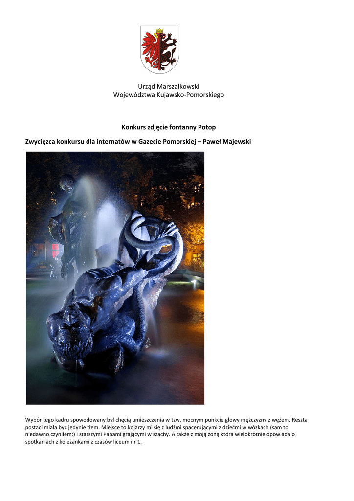 Urząd Marszałkowski Województwa Kujawsko-Pomorskiego Konkurs zdjęcie fontanny Potop Zwycięzca konkursu dla internatów w Gazecie Pomorskiej – Paweł Majewski Wybór tego kadru spowodowany był chęcią umieszczenia w tzw. mocnym punkcie głowy mężczyzny z wężem. Reszta postaci miała być jedynie tłem. Miejsce to kojarzy mi się z ludźmi spacerującymi z dziećmi w wózkach (sam to niedawno czyniłem:) i starszymi Panami grającymi w szachy. A także z moją żoną która wielokrotnie opowiada o spotkaniach z koleżankami z czasów liceum nr 1. To chęć umieszczenia dwóch posągów w mocnych punktach. Celem takiego kadrowania było też uniknięcie świateł w kadrze, by zdjęcie nie miało "przepalonych" miejsc. Inspiracją do zdjęcia był właśnie popołudniowy spacer z żoną. Postanowiłem wtedy wykonać to zdjęcie wieczorem, gdyż zaintrygowała mnie powstała piana w fontannie, która tam się tego dnia utrzymywała, niczym śnieg. Celem tego kadrowania było ukazanie niedawno postawionej (kilka dni wcześniej ustawiono tę część fontanny) części centralnej fontanny. Stąd taki centralny pionowy kadr. Oczywiście starałem się też uniknąć w kadrze lamp oświetlających, by nie powstały "przepalenia". U dołu kadru ciekawy "śnieg". Opracowanie: Biuro Prasowe Urzędu Marszałkowskiego Styczeń 2013 r.