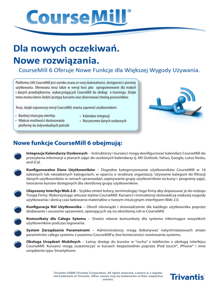 Dla nowych oczekiwań. Nowe rozwiązania. CourseMill 6 Oferuje Nowe Funkcje dla Większej Wygody Używania. Platforma LMS CourseMill jest szeroko znana ze swej skalowalności, dostępności i prostoty użytkowania. Oferowana teraz także w wersji host jako oprogramowanie dla małych i dużych przedsiębiorstw, wykorzystujących CourseMill do obsługi e-learningu. Dzięki temu można łatwo śledzić postępy kursanta oraz obserwować trening pracowników. Teraz, dzięki najnowszej wersji CourseMill, można zapewnić użytkownikom: • Bardziej intuicyjny interfejs • Większe możliwości dostosowania platformy do indywidualnych potrzeb • Kalendarz integracji • Rozszerzenie danych osobowych Nowe funkcje CourseMill 6 obejmują: Integracja Kalendarzy Osobowych - Instruktorzy i kursanci mogą skonfigurować kalendarz CourseMill do przesyłania informacji o planach zajęć do osobistych kalendarzy tj. MS Outlook, Yahoo, Google, Lotus Notes, and iCal. Konfigurowalne Dane Użytkowników – Dogodne kategoryzowanie użytkowników CourseMill w 16 zależnych lub niezależnych kategoriach, w oparciu o strukturę organizacji. Używanie kategorii do filtracji danych użytkowników w ramach sprawozdań, zapisywanie grupy użytkowników na kursy i programy zajęć, tworzenie kursów dostępnych dla określonej grupy użytkowników. Ulepszony Interfejs Web 2.0 – Szybko zmień kolory, terminologię i logo firmy aby dopasować je do rodzaju Twojej Firmy. Wykorzystując arkusze stylów CourseMill. Kursanci i instruktorzy doświadczą większej wygody użytkowania i skrócą czas ładowania materiałów z nowym intuicyjnym interfejsem Web 2.0. Konfiguracja Ról Użytkownika – Określ obowiązki i doświadczenie dla każdego użytkownika poprzez dodawanie i usuwanie uprawnień, opierających się na określonej roli w CourseMill. Komunikaty dla Całego Sytemu – Stwórz własne komunikaty dla systemu informujące wszystkich użytkowników podczas logowania. System Zarządzania Parametrami – Administratorzy mogą dokonywać natychmiastowych zmian parametrów całego systemu z poziomu CourseMill’a, bez konieczności resetowania systemu. Obsługa Urządzeń Mobilnych – Łatwy dostęp do kursów w “ruchu” z telefonów z obsługą interfejsu CourseMill. Kursanci mogą uczestniczyć w kursach bezpośrednio poprzez iPod touch®, iPhone® i inne urządzenia typu Smartphone. Trivantis ©2009 Trivantis Corporation. All rights reserved. Lectora is a registered trademark of Trivantis. Other names may be trademarks of their respective owners. Automatyczna Archiwizacja Danych – Zaoszczędź czas, poprzez drukowanie sprawozdań tylko na podstawie najnowszych danych. Starsze wpisy są automatycznie archiwizowane, co przyśpiesza generowanie sprawozdań. Zawiadomienia o Sesjach – Łatwo załączaj informacje na temat sesji tj. notatki z sesji i dni spotkań, w dostarczanych automatycznie zawiadomieniach o kursie. Wysyłanie Ważnych Zawiadomień – Dostarczaj kursantom koniecznych informacji poprzez ponowne wysłanie wiadomości na temat zapisania się na kurs oraz informacji o jego zakończeniu. Wyszukiwarka Metadanych – Kursanci mogą teraz szybciej i łatwiej wyszukiwać kursy poprzez wykorzystanie popularnych słów i wyrażeń kluczowych (wymogiem jest, aby kurs zawierał metadane). Monitorowanie i Zatwierdzanie Forum Dyskusyjnego - Dla zwiększenia bezpieczeństwa, administratorzy i sprawozdawcy mogą kontrolować zawartość forum dyskusyjnego, poprzez zatwierdzanie wiadomości, zanim zostaną zamieszczone na forum. Rozszerzone Karty Sprawozdań – Karty sprawozdań zawierają teraz bonusowe godziny dostępu uzyskane, dzięki pomyślnemu zakończeniu każdego kursu. Ulepszona Rejestracja Dużej Ilości Użytkowników – Oszczędza czas i wysiłek poprzez wykorzystanie dodatkowych informacji o użytkowniku, przy wielokrotnej rejestracji tj.: adres zamieszkania, numer telefonu, sklasyfikowane podorganizacje, przypisanie sprawozdawcy, specyfikacje rejestracji kursu oraz wynik ukończenia kursu. Rozszerzone Szybkie Wyszukiwanie – Użytkownik znajdzie szybko dowolny element poprzez filtrowanie kursów, programu zajęć i listę użytkowników - wykorzystując różne warianty wyszukiwania. Pomoc Online – Poszukaj odpowiedzi na pytania dotyczące CourseMill przy pomocy narzędzia pomocy online. Kliknij na przycisk Pomocy, który umożliwi dostęp do kontekstowych informacji, pozwalających poznać zalety i funkcjonalności CourseMill’a. Wstępne Wymagania Programu Zajęć – Dodaje warunki dostępu do program zajęć, które wymagają od kursanta przystąpienia do określonych kursów przed przystąpieniem do nowych programów nauczania. W celu uzyskania szczegółowych informacji skontaktuj się tel. 667 117 026 fax. (63) 219 11 90 http://www.lectora.pl Trivantis ©2009 Trivantis Corporation. All rights reserved. Lectora is a registered trademark of Trivantis. Other names may be trademarks of their respective owners.