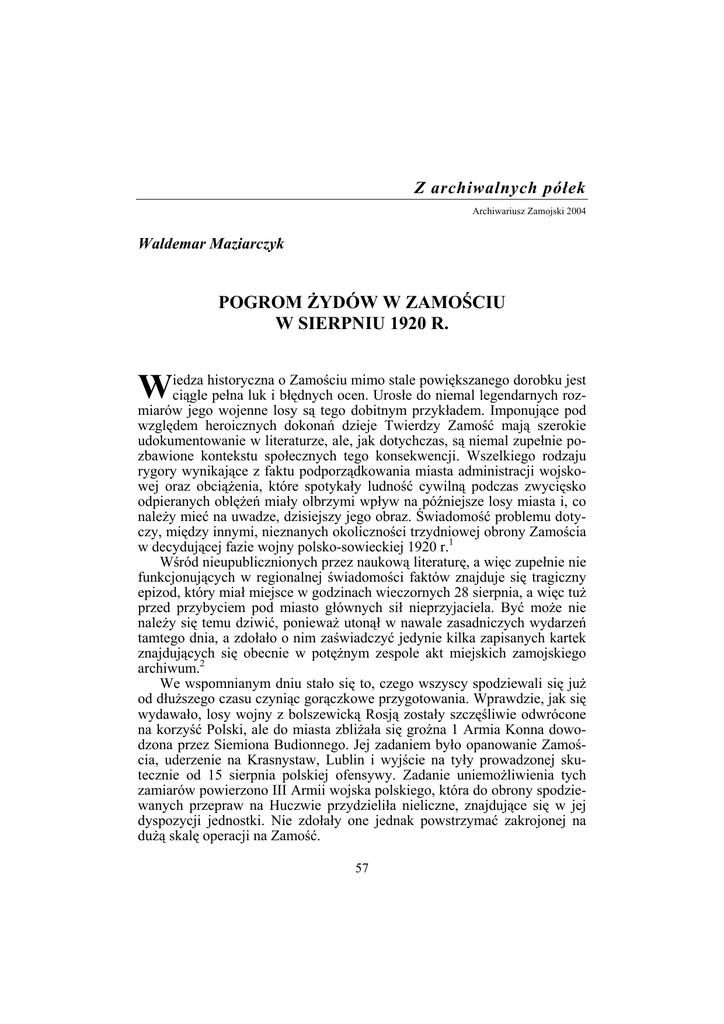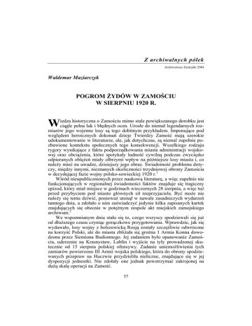Z archiwalnych półek Archiwariusz Zamojski 2004 Waldemar Maziarczyk POGROM ŻYDÓW W ZAMOŚCIU W SIERPNIU 1920 R. iedza historyczna o Zamościu mimo stale powiększanego dorobku jest W ciągle pełna luk i błędnych ocen. Urosłe do niemal legendarnych rozmiarów jego wojenne losy są tego dobitnym przykładem. Imponujące pod względem heroicznych dokonań dzieje Twierdzy Zamość mają szerokie udokumentowanie w literaturze, ale, jak dotychczas, są niemal zupełnie pozbawione kontekstu społecznych tego konsekwencji. Wszelkiego rodzaju rygory wynikające z faktu podporządkowania miasta administracji wojskowej oraz obciążenia, które spotykały ludność cywilną podczas zwycięsko odpieranych oblężeń miały olbrzymi wpływ na późniejsze losy miasta i, co należy mieć na uwadze, dzisiejszy jego obraz. Świadomość problemu dotyczy, między innymi, nieznanych okoliczności trzydniowej obrony Zamościa w decydującej fazie wojny polsko-sowieckiej 1920 r.1 Wśród nieupublicznionych przez naukową literaturę, a więc zupełnie nie funkcjonujących w regionalnej świadomości faktów znajduje się tragiczny epizod, który miał miejsce w godzinach wieczornych 28 sierpnia, a więc tuż przed przybyciem pod miasto głównych sił nieprzyjaciela. Być może nie należy się temu dziwić, ponieważ utonął w nawale zasadniczych wydarzeń tamtego dnia, a zdołało o nim zaświadczyć jedynie kilka zapisanych kartek znajdujących się obecnie w potężnym zespole akt miejskich zamojskiego archiwum.2 We wspomnianym dniu stało się to, czego wszyscy spodziewali się już od dłuższego czasu czyniąc gorączkowe przygotowania. Wprawdzie, jak się wydawało, losy wojny z bolszewicką Rosją zostały szczęśliwie odwrócone na korzyść Polski, ale do miasta zbliżała się groźna 1 Armia Konna dowodzona przez Siemiona Budionnego. Jej zadaniem było opanowanie Zamościa, uderzenie na Krasnystaw, Lublin i wyjście na tyły prowadzonej skutecznie od 15 sierpnia polskiej ofensywy. Zadanie uniemożliwienia tych zamiarów powierzono III Armii wojska polskiego, która do obrony spodziewanych przepraw na Huczwie przydzieliła nieliczne, znajdujące się w jej dyspozycji jednostki. Nie zdołały one jednak powstrzymać zakrojonej na dużą skalę operacji na Zamość. 57 W chwili gdy sowieckie forpoczty zauważono z usytuowanego na szczycie wieży ratuszowej punktu obserwacyjnego kończono naprędce kopanie rowów strzelniczych i rozstawianie zasieków z kolczastego drutu, a na stacji kolejowej wyładowywał się 31 pułk strzelców kaniowskich, który został przydzielony do obrony Zamościa dosłownie w ostatniej chwili. Tymczasem, przy wjeździe do miasta od strony Tomaszowa i traktu na Hrubieszów zapanował niebywały chaos. Tłumy uciekającej przed bolszewikami ludności cywilnej, żołnierzy rozbitych jednostek oraz tabory woj.skowe wypełniły Nową Osadę i zatarasowały na pewien czas ulicę Lwowską. Wśród rzęsistego deszczu rozpoczęły się rabunki i ekscesy, którym nie zdołano w porę zapobiec.3 Niektóre były tak tragiczne w skutkach, że zostały odnotowane, a informacja znalazła się w dokumentacji zamojskiego Magistratu. Źródło w postaci kilku oddzielnych dokumentów pochodzi z okresu o kilka miesięcy późniejszego od dotyczących go wydarzeń, ale, jak łatwo się domyśleć, zaistniało jako kontynuacja wcześniejszych działań poza administracją zamojską. Dla lepszego zrozumienia całego kontekstu sprawy warto przytoczyć zasadniczy tekst najwcześniejszego z nich. Jest to adresowane do Zarządu miasta Zamościa pismo Naczelnika Departamentu Pracy i Opieki Społecznej przy Delegacie tegoż ministerstwa na okręg lubelski datowane w Lublinie 4 maja 1921 r.: “...Na skutek otrzymanego z Ministerstwa (Pracy i Opieki Społecznej - przyp. autora) pisma Dozoru Bożniczego przesłanego do Pana Prezydenta Rady Ministrów, delegat Ministerstwa Pracy i Opieki Społecznej prosi o nadesłanie imiennej listy członków gminy żydowskiej poszkodowanych przez wojska generała Bałachowicza w celu bliższego zbadania tej sprawy...” 4 Zwlekanie z wszczęciem odpowiednich kroków przez zamojskich urzędników spowodowało wysłanie korespondencji ponaglającej.5 W rezultacie, pospiesznie powiadomiono władze gminy żydowskiej prosząc o stosowny wykaz nazwisk. 6 W nadesłanej 23 czerwca odpowiedzi czytamy między innymi: „...Wskutek pisma Magistratu z dnia 23 b.m. Zarząd Gminy Żydowskiej w Zamościu ma zaszczyt przesłać przy niniejszym listę poszkodowanych przez wojska generała Bałachowicza...”. Z załącznika zawierającego bardziej szczegółowe dane dowiadujemy się o bestialskim wyczynie żołnierzy, którzy schronili się w obrębie fortyfikacji Zamościa i z chęci rabunku, a, być może, aby powetować swoje niepowodzenia na froncie, dokonali bezprzykładnego rozboju na cywilnej ludności. Zostało wówczas poszkodowanych 37 osób, a ich dane osobowe i rodzaj doznanych krzywd znajdują się na sporządzonej liście.7 Z zawartych tam informacji wyłania się obraz wstrząsający. Pięciu Żydów zamordowano przy użyciu najbardziej okrutnych sposobów, pozostałych bardzo poważnie poraniono szablami, a wszystkich obrabowano z posiadanego majątku. Na obecnym etapie badań nie jesteśmy w stanie ustalić bliższych okoliczności opisanych zajść. Zweryfikować jednak należy zawarte w obu zacytowanych dokumentach informacje dotyczące ich sprawców tym bardziej, 58 że jako nieprawdziwe funkcjonują do dzisiaj w źródłach żydowskich. 8 Nie wiemy w jaki sposób ustalono, że byli to żołnierze Bałachowicza. Jest jednak pewne, iż walcząca w wojnie 1920 r. po polskiej stronie białoruska dywizja pod dowództwem generała Stanisława Bułak-Bałachowicza nigdy nie operowała w pobliżu Zamościa. Aby to stwierdzić wystarczy przejrzeć opublikowane dokumenty operacyjne armii polskiej z tego okresu. 9 W interesującym nas okresie jednostka toczyła