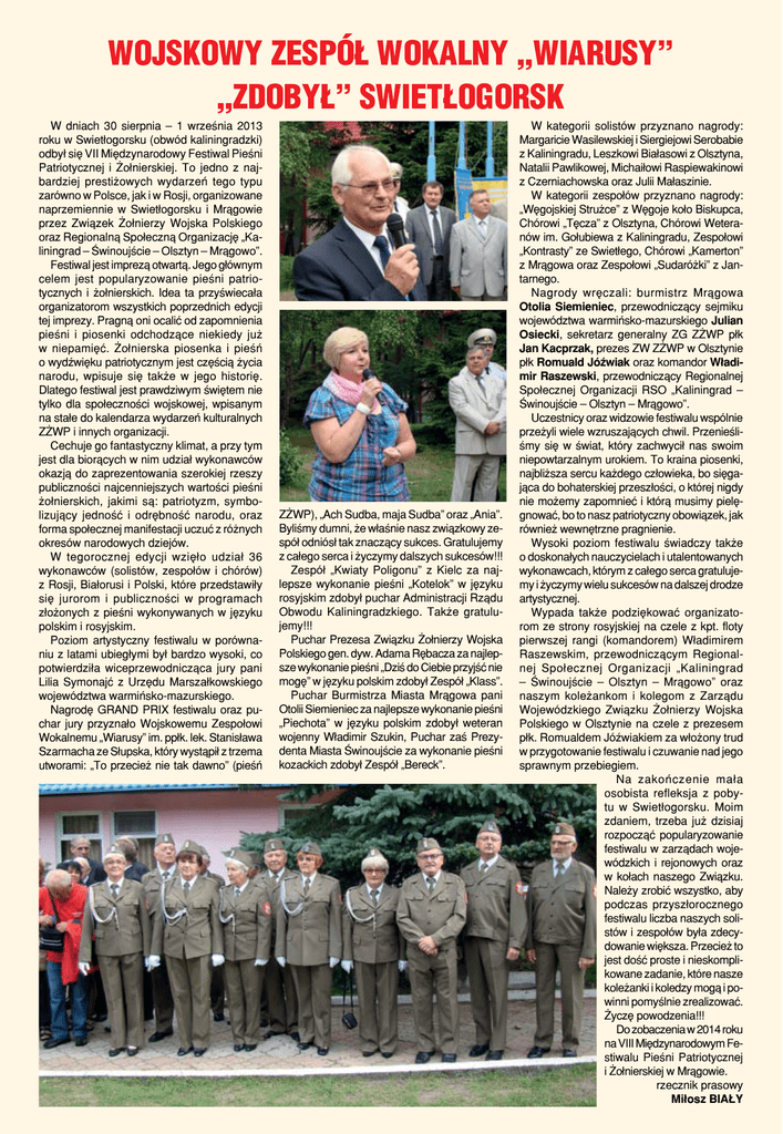 Wojskowy Zespół Wokalny „Wiarusy” „zdobył” Swietłogorsk W dniach 30 sierpnia – 1 września 2013 roku w Swietłogorsku (obwód kaliningradzki) odbył się VII Międzynarodowy Festiwal Pieśni Patriotycznej i Żołnierskiej. To jedno z najbardziej prestiżowych wydarzeń tego typu zarówno w Polsce, jak i w Rosji, organizowane naprzemiennie w Swietłogorsku i Mrągowie przez Związek Żołnierzy Wojska Polskiego oraz Regionalną Społeczną Organizację „Kaliningrad – Świnoujście – Olsztyn – Mrągowo”. Festiwal jest imprezą otwartą. Jego głównym celem jest popularyzowanie pieśni patriotycznych i żołnierskich. Idea ta przyświecała organizatorom wszystkich poprzednich edycji tej imprezy. Pragną oni ocalić od zapomnienia pieśni i piosenki odchodzące niekiedy już w niepamięć. Żołnierska piosenka i pieśń o wydźwięku patriotycznym jest częścią życia narodu, wpisuje się także w jego historię. Dlatego festiwal jest prawdziwym świętem nie tylko dla społeczności wojskowej, wpisanym na stałe do kalendarza wydarzeń kulturalnych ZŻWP i innych organizacji. Cechuje go fantastyczny klimat, a przy tym jest dla biorących w nim udział wykonawców okazją do zaprezentowania szerokiej rzeszy publiczności najcenniejszych wartości pieśni żołnierskich, jakimi są: patriotyzm, symbolizujący jedność i odrębność narodu, oraz forma społecznej manifestacji uczuć z różnych okresów narodowych dziejów. W tegorocznej edycji wzięło udział 36 wykonawców (solistów, zespołów i chórów) z Rosji, Białorusi i Polski, które przedstawiły się jurorom i publiczności w programach złożonych z pieśni wykonywanych w języku polskim i rosyjskim. Poziom artystyczny festiwalu w porównaniu z latami ubiegłymi był bardzo wysoki, co potwierdziła wiceprzewodnicząca jury pani Lilia Symonajć z Urzędu Marszałkowskiego województwa warmińsko-mazurskiego. Nagrodę GRAND PRIX festiwalu oraz puchar jury przyznało Wojskowemu Zespołowi Wokalnemu „Wiarusy” im. ppłk. lek. Stanisława Szarmacha ze Słupska, który wystąpił z trzema utworami: „To przecież nie tak dawno” (pieśń ZŻWP), „Ach Sudba, maja Sudba” oraz „Ania”. Byliśmy dumni, że właśnie nasz związkowy zespół odniósł tak znaczący sukces. Gratulujemy z całego serca i życzymy dalszych sukcesów!!! Zespół „Kwiaty Poligonu” z Kielc za najlepsze wykonanie pieśni „Kotelok” w języku rosyjskim zdobył puchar Administracji Rządu Obwodu Kaliningradzkiego. Także gratulujemy!!! Puchar Prezesa Związku Żołnierzy Wojska Polskiego gen. dyw. Adama Rębacza za najlepsze wykonanie pieśni „Dziś do Ciebie przyjść nie mogę” w języku polskim zdobył Zespół „Klass”. Puchar Burmistrza Miasta Mrągowa pani Otolii Siemieniec za najlepsze wykonanie pieśni „Piechota” w języku polskim zdobył weteran wojenny Władimir Szukin, Puchar zaś Prezydenta Miasta Świnoujście za wykonanie pieśni kozackich zdobył Zespół „Bereck”. W kategorii solistów przyznano nagrody: Margaricie Wasilewskiej i Siergiejowi Serobabie z Kaliningradu, Leszkowi Białasowi z Olsztyna, Natalii Pawlikowej, Michaiłowi Raspiewakinowi z Czerniachowska oraz Julii Małaszinie. W kategorii zespołów przyznano nagrody: „Węgojskiej Strużce” z Węgoje koło Biskupca, Chórowi „Tęcza” z Olsztyna, Chórowi Weteranów im. Gołubiewa z Kaliningradu, Zespołowi „Kontrasty” ze Swietłego, Chórowi „Kamerton” z Mrągowa oraz Zespołowi „Sudaróżki” z Jantarnego. Nagrody wręczali: burmistrz Mrągowa Otolia Siemieniec, przewodniczący sejmiku województwa warmińsko-mazurskiego Julian Osiecki, sekretarz generalny ZG ZŻWP płk Jan Kacprzak, prezes ZW ZŻWP w Olsztynie płk Romuald Jóźwiak oraz komandor Władimir Raszewski, przewodniczący Regionalnej Społecznej Organizacji RSO „Kaliningrad – Świnoujście – Olsztyn – Mrągowo”. Uczestnicy oraz widzowie festiwalu wspólnie przeżyli wiele wzruszających chwil. Przenieśliśmy się w świat, który zachwycił nas swoim niepowtarzalnym urokiem. To kraina piosenki, najbliższa sercu każdego człowieka, bo sięgająca do bohaterskiej przeszłości, o której nigdy nie możemy zapomnieć i którą musimy pielęgnować, bo to nasz patriotyczny obowiązek, jak również wewnętrzne pragnienie. Wysoki poziom festiwalu świadczy także o doskonałych nauczycielach i utalentowanych wykonawcach, którym z całego serca gratulujemy i życzymy wielu sukcesów na dalszej drodze artystycznej. Wypada także podziękować organizatorom ze strony rosyjskiej na czele z kpt. floty pierwszej rangi (komandorem) Władimirem Raszewskim, przewodniczącym Regionalnej Społecznej Organizacji „Kaliningrad – Świnoujście – Olsztyn – Mrągowo” oraz naszym koleżankom i kolegom z Zarządu Wojewódzkiego Związku Żołnierzy Wojska Polskiego w Olsztynie na czele z prezesem płk. Romualdem Jóźwiakiem za włożony trud w przygotowanie festiwalu i czuwanie nad jego sprawnym przebiegiem. Na zakończenie mała osobista refleksja z pobytu w Swietłogorsku. Moim zdaniem, trzeba już dzisiaj rozpocząć popularyzowanie festiwalu w zarządach wojewódzkich i rejonowych oraz w kołach naszego Związku. Należy zrobić wszystko, aby podczas przyszłorocznego festiwalu liczba naszych solistów i zespołów była zdecydowanie większa. Przecież to jest dość proste i nieskomplikowane zadanie, które nasze koleżanki i koledzy mogą i powinni pomyślnie zrealizować. Życzę powodzenia!!! Do zobaczenia w 2014 roku na VIII Międzynarodowym Festiwalu Pieśni Patriotycznej i Żołnierskiej w Mrągowie. rzecznik prasowy Miłosz BIAŁY