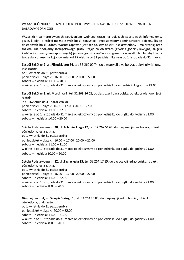 WYKAZ OGÓLNODOSTĘPNYCH BOISK SPORTOWYCH O NAWIERZCHNII SZTUCZNEJ NA TERENIE DĄBROWY GÓRNICZEJ Wszystkich zainteresowanych spędzeniem wolnego czasu na boiskach sportowych informujemy, gdzie, kiedy i o której można z tych boisk korzystać. Przedstawiamy administratora obiektu, liczbę dostępnych boisk, adres. Ważne zapewne jest też to, czy obiekt jest oświetlony i ma szatnię oraz toaletę. Nie podajemy szczegółowego grafiku zajęć na obiektach (szkolne godziny lekcyjne, zajęcia klubów i stowarzyszeń sportowych) jedynie godziny ogólnodostępne dla wszystkich. Uwzględniamy także dwa okresy funkcjonowania: od 1 kwietnia do 31 października oraz od 1 listopada do 31 marca. Zespół Szkół nr 2, al. Piłsudskiego 24, tel: 32 260 00 74, do dyspozycji dwa boiska, obiekt oświetlony, jest szatnia. od 1 kwietnia do 31 października poniedziałek – piątek: 16.00 – 17.00 i 20.00 – 22.00 sobota – niedziela: 11.00 – 20.00 w okresie od 1 listopada do 31 marca obiekt czynny od poniedziałku do niedzieli do godziny 21.00 Zespół Szkół nr 3, ul. Morcinka 4, tel: 32 268 86 02, do dyspozycji dwa boiska, obiekt oświetlony, jest szatnia. od 1 kwietnia do 31 października poniedziałek – piątek: 16.00 – 17.00 i 20.00 – 22.00 sobota – niedziela: 11.00 – 22.00 w okresie od 1 listopada do 31 marca obiekt czynny od poniedziałku do piątku do godziny 21.00, sobota – niedziela 10.00 – 20.00 Szkoła Podstawowa nr 20, ul .Adamieckiego 12, tel: 32 262 51 62, do dyspozycji dwa boiska, obiekt oświetlony, jest szatnia. od 1 kwietnia do 31 października poniedziałek – piątek: 16.00 – 17.00 i 20.00 – 22.00 sobota – niedziela: 11.00 – 21.00 w okresie od 1 listopada do 31 marca obiekt czynny od poniedziałku do piątku do godziny 21.00, sobota – niedziela 10.00 – 20.00 Szkoła Podstawowa nr 12, ul .Tysiąclecia 25, tel: 32 264 17 19, do dyspozycji jedno boisko, obiekt oświetlony, jest szatnia. od 1 kwietnia do 31 października poniedziałek – piątek: 16.00 – 17.00 i 20.00 – 22.00 sobota – niedziela: 11.00 – 22.00 w okresie od 1 listopada do 31 marca obiekt czynny od poniedziałku do piątku do godziny 21.00, sobota – niedziela 8.00 – 20.00 Gimnazjum nr 4, ul. Wyspiańskiego 1, tel: 32 264 26 85, do dyspozycji jedno boisko, obiekt oświetlony, brak szatni. od 1 kwietnia do 31 października poniedziałek – piątek: 20.00 – 22.00 sobota – niedziela: 11.00 – 21.00 w okresie od 1 listopada do 31 marca obiekt czynny od poniedziałku do piątku do godziny 21.00, sobota – niedziela 8.00 – 20.00 Zespół Szkół nr 7, ul. Jaworowa 6, tel: 32 262 40 42, do dyspozycji jedno boisko, obiekt oświetlony, brak szatni. od 1 kwietnia do 31 października poniedziałek – piątek: 16.00 – 17.00 i 20.00 – 21.00 sobota – niedziela: 11.00 – 21.00 w okresie od 1 listopada do 31 marca obiekt czynny od poniedziałku do piątku do godziny 21.00, sobota – niedziela 9.00 – 21.00 Szkoła Podstawowa nr 17, ul. Ofiar Katynia 76, tel: 32 264 50 65, do dyspozycji jedno boisko, obiekt nieoświetlony, brak szatni. boisko dostępne od 15 marca do 15 listopada poniedziałek – piątek: 15.00 – 19.30 sobota – niedziela: 10.45 – 19.30 W święta i dni ustawowo wolne obiekt nieczynny I Liceum Ogólnokształcące, ul. Kopernika 40, tel: 32 262 34 80, do dyspozycji jedno boisko, obiekt oświetlony, brak szatni. od 1 kwietnia do 31 października poniedziałek – piątek: 16.00 – 21.00 sobota – niedziela: 9.00 – 21.00 w okresie od 1 listopada do 31 marca obiekt czynny od poniedziałku do piątku 16.00 - 20.00, sobota – niedziela 9.00 – 20.00 Zespół Szkół Sportowych, ul. Chopina 34, tel: 32 262 69 68, do dyspozycji dwa boiska, obiekt oświetlony, brak szatni. od 1 kwietnia do 31 października poniedziałek – piątek: 17.00 – 21.00 sobota – niedziela: 10.00 – 16.00 w okresie od 1 listopada do 31 marca obiekt czynny od poniedziałku do piątku 17.00 - 20.00, sobota – niedziela 10.00 – 16.00 II Liceum Ogólnokształcące, ul. Górnicza 17, tel: 32 262 34 80, do dyspozycji jedno boisko, obiekt nieoświetlony, brak szatni. od 1 maja do 31 października poniedziałek – piątek: 16.00 do zmroku sobota – niedziela: 9.00 do zmroku W święta państwowe obiekt nieczynny Centrum Sportu i Rekreacji, ul. Konopnickiej 29, tel: 32 261 20 10, do dyspozycji jedno boisko, obiekt oświetlony, brak szatni. Terminy i godziny rezerwacji boiska piłkarskiego do uzgodnienia z Dyrekcją CSiR Klub Sportowy „Unia Ząbkowice”, al. Zwycięstwa 29, do dyspozycji dwa boiska, obiekt oświetlony, jest szatnia. Terminy i godziny rezerwacji boiska piłkarskiego do uzgodnienia z Zarządem Klubu Szkoła Podstawowa nr 10, ul. Górników Redenu 4, tel: 32 262 28 41, do dyspozycji jedno boisko, obiekt nieoświetlony, brak szatni. W zależności od pory roku obiekt czynny: poniedziałek – piątek: 15.00 do zmroku sobota – niedziela: 9.00 do zmroku Szkoła Podstawowa nr 8, ul. Krasińskiego 34, tel: 32 264 19 80, do dyspozycji jedno boisko, obiekt nieoświetlony, brak szatni. od 1 kwietnia do 31 października poniedziałek – piątek: 16.00 – 21.00/do zmroku sobota – niedziela: 9.00 – 21.00/do zmroku w okresie od 1 listopada do 31 marca obiekt czynny od poniedziałku do piątku 16.00 - 20.00/do zmroku, sobota – niedziela 9.00 – 20.00/do zmroku Szkoła Podstawowa nr 3, ul. Mireckiego 1, tel: 32 262 26 14, do dyspozycji jedno boisko, obiekt nieoświetlony, brak szatni. W zależności od pory roku obiekt czynny: poniedziałek – piątek: 16.00 do zmroku sobota – niedziela: 9.00 do zmroku Szkoła Podstawowa nr 25, ul. Mieszka I, el: 32 264 09 31, do dyspozycji jedno boisko, obiekt nieoświetlony, brak szatni. W zależności od pory roku obiekt czynny: poniedziałek – piątek: 15.00 do zmroku sobota – niedziela: 9.00 do zmroku Szkoła Podstawowa nr 18, al. Piłsudskiego 73, tel: 32 264 13 00, do dyspozycji trzy boiska, obiekty nieoświetlone, br