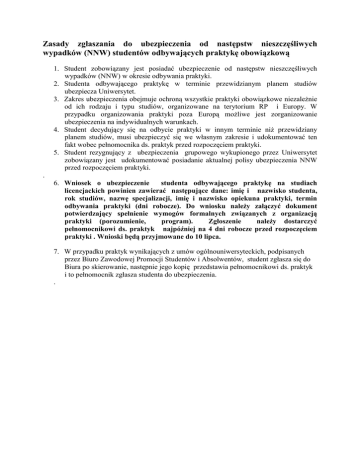 Zasady zgłaszania do ubezpieczenia od następstw nieszczęśliwych wypadków (NNW) studentów odbywających praktykę obowiązkową 1. Student zobowiązany jest posiadać ubezpieczenie od następstw nieszczęśliwych wypadków (NNW) w okresie odbywania praktyki. 2. Studenta odbywającego praktykę w terminie przewidzianym planem studiów ubezpiecza Uniwersytet. 3. Zakres ubezpieczenia obejmuje ochroną wszystkie praktyki obowiązkowe niezależnie od ich rodzaju i typu studiów, organizowane na terytorium RP i Europy. W przypadku organizowania praktyki poza Europą możliwe jest zorganizowanie ubezpieczenia na indywidualnych warunkach. 4. Student decydujący się na odbycie praktyki w innym terminie niż przewidziany planem studiów, musi ubezpieczyć się we własnym zakresie i udokumentować ten fakt wobec pełnomocnika ds. praktyk przed rozpoczęciem praktyki. 5. Student rezygnujący z ubezpieczenia grupowego wykupionego przez Uniwersytet zobowiązany jest udokumentować posiadanie aktualnej polisy ubezpieczenia NNW przed rozpoczęciem praktyki. . 6. Wniosek o ubezpieczenie studenta odbywającego praktykę na studiach licencjackich powinien zawierać następujące dane: imię i nazwisko studenta, rok studiów, nazwę specjalizacji, imię i nazwisko opiekuna praktyki, termin odbywania praktyki (dni robocze). Do wniosku należy załączyć dokument potwierdzający spełnienie wymogów formalnych związanych z organizacją praktyki (porozumienie, program). Zgłoszenie należy dostarczyć pełnomocnikowi ds. praktyk najpóźniej na 4 dni robocze przed rozpoczęciem praktyki . Wnioski będą przyjmowane do 10 lipca. 7. W przypadku praktyk wynikających z umów ogólnouniwersyteckich, podpisanych przez Biuro Zawodowej Promocji Studentów i Absolwentów, student zgłasza się do Biura po skierowanie, następnie jego kopię przedstawia pełnomocnikowi ds. praktyk i to pełnomocnik zgłasza studenta do ubezpieczenia. .