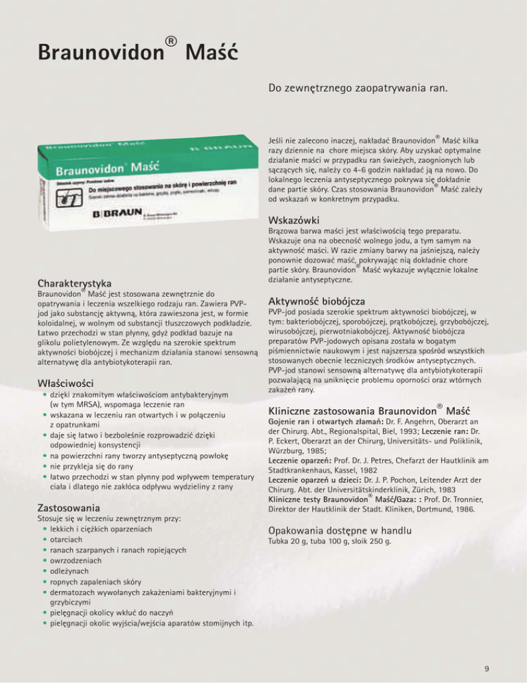Braunovidon® Maść Do zewnętrznego zaopatrywania ran. Jeśli nie zalecono inaczej, nakładać Braunovidon® Maść kilka razy dziennie na chore miejsca skóry. Aby uzyskać optymalne działanie maści w przypadku ran świeżych, zaognionych lub sączących się, należy co 4-6 godzin nakładać ją na nowo. Do lokalnego leczenia antyseptycznego pokrywa się dokładnie dane partie skóry. Czas stosowania Braunovidon® Maść zależy od wskazań w konkretnym przypadku. Wskazówki Charakterystyka Braunovidon® Maść jest stosowana zewnętrznie do opatrywania i leczenia wszelkiego rodzaju ran. Zawiera PVPjod jako substancję aktywną, która zawieszona jest, w formie koloidalnej, w wolnym od substancji tłuszczowych podkładzie. Łatwo przechodzi w stan płynny, gdyż podkład bazuje na glikolu polietylenowym. Ze względu na szerokie spektrum aktywności biobójczej i mechanizm działania stanowi sensowną alternatywę dla antybiotykoterapii ran. Właściwości • dzięki znakomitym właściwościom antybakteryjnym (w tym MRSA), wspomaga leczenie ran • wskazana w leczeniu ran otwartych i w połączeniu z opatrunkami • daje się łatwo i bezboleśnie rozprowadzić dzięki odpowiedniej konsystencji • na powierzchni rany tworzy antyseptyczną powłokę • nie przykleja się do rany • łatwo przechodzi w stan płynny pod wpływem temperatury ciała i dlatego nie zakłóca odpływu wydzieliny z rany Zastosowania Stosuje się w leczeniu zewnętrznym przy: • lekkich i ciężkich oparzeniach • otarciach • ranach szarpanych i ranach ropiejących • owrzodzeniach • odleżynach • ropnych zapaleniach skóry • dermatozach wywołanych zakażeniami bakteryjnymi i grzybiczymi • pielęgnacji okolicy wkłuć do naczyń • pielęgnacji okolic wyjścia/wejścia aparatów stomijnych itp. Brązowa barwa maści jest właściwością tego preparatu. Wskazuje ona na obecność wolnego jodu, a tym samym na aktywność maści. W razie zmiany barwy na jaśniejszą, należy ponownie dozować maść, pokrywając nią dokładnie chore partie skóry. Braunovidon® Maść wykazuje wyłącznie lokalne działanie antyseptyczne. Aktywność biobójcza PVP-jod posiada szerokie spektrum aktywności biobójczej, w tym: bakteriobójczej, sporobójczej, prątkobójczej, grzybobójczej, wirusobójczej, pierwotniakobójczej. Aktywność biobójcza preparatów PVP-jodowych opisana została w bogatym piśmiennictwie naukowym i jest najszersza spośród wszystkich stosowanych obecnie leczniczych środków antyseptycznych. PVP-jod stanowi sensowną alternatywę dla antybiotykoterapii pozwalającą na uniknięcie problemu oporności oraz wtórnych zakażeń rany. Kliniczne zastosowania Braunovidon® Maść Gojenie ran i otwartych złamań: Dr. F. Angehrn, Oberarzt an der Chirurg. Abt., Regionalspital, Biel, 1993; Leczenie ran: Dr. P. Eckert, Oberarzt an der Chirurg, Universitäts- und Poliklinik, Würzburg, 1985; Leczenie oparzeń: Prof. Dr. J. Petres, Chefarzt der Hautklinik am Stadtkrankenhaus, Kassel, 1982 Leczenie oparzeń u dzieci: Dr. J. P. Pochon, Leitender Arzt der Chirurg. Abt. der Universitätskinderklinik, Zürich, 1983 Kliniczne testy Braunovidon® Maść/Gaza: : Prof. Dr. Tronnier, Direktor der Hautklinik der Stadt. Kliniken, Dortmund, 1986. Opakowania dostępne w handlu Tubka 20 g, tuba 100 g, słoik 250 g. 9