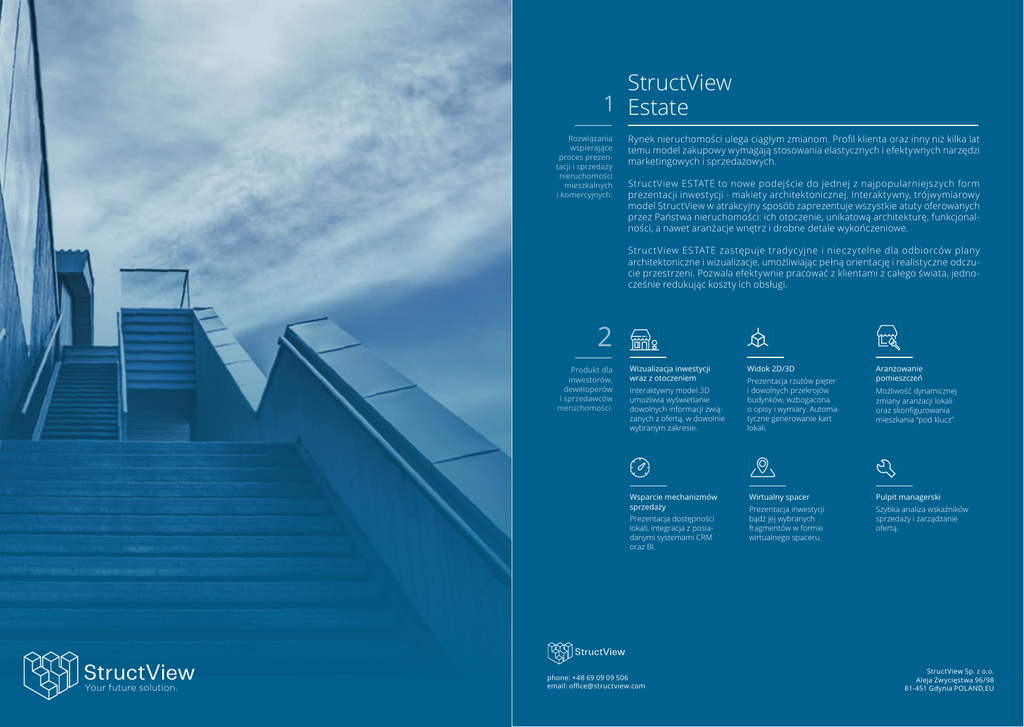 StructView 1 Estate Rozwiązania wspierające proces prezentacji i sprzedaży nieruchomości mieszkalnych i komercyjnych. Rynek nieruchomości ulega ciągłym zmianom. Profil klienta oraz inny niż kilka lat temu model zakupowy wymagają stosowania elastycznych i efektywnych narzędzi marketingowych i sprzedażowych. StructView ESTATE to nowe podejście do jednej z najpopularniejszych form prezentacji inwestycji - makiety architektonicznej. Interaktywny, trójwymiarowy model StructView w atrakcyjny sposób zaprezentuje wszystkie atuty oferowanych przez Państwa nieruchomości: ich otoczenie, unikatową architekturę, funkcjonalności, a nawet aranżacje wnętrz i drobne detale wykończeniowe. StructView ESTATE zastępuje tradyc yjne i nieczy telne dla odbiorców plany architektoniczne i wizualizacje, umożliwiając pełną orientację i realistyczne odczucie przestrzeni. Pozwala efektywnie pracować z klientami z całego świata, jednocześnie redukując koszty ich obsługi. 2 Produkt dla inwestorów, deweloperów i sprzedawców nieruchomości. Wizualizacja inwestycji wraz z otoczeniem Interaktywny model 3D umożliwia wyświetlanie dowolnych informacji związanych z ofertą, w dowolnie wybranym zakresie. Wsparcie mechanizmów sprzedaży Prezentacja dostępności lokali, integracja z posiadanymi systemami CRM oraz BI. Your future solution. phone: +48 69 09 09 506 email: [email protected] Widok 2D/3D Prezentacja rzutów pięter i dowolnych przekrojów budynków, wzbogacona o opisy i wymiary. Automatyczne generowanie kart lokali. Aranżowanie pomieszczeń Możliwość dynamicznej zmiany aranżacji lokali oraz skonfigurowania mieszkania “pod klucz”. Wirtualny spacer Pulpit managerski Prezentacja inwestycji bądź jej wybranych fragmentów w formie wirtualnego spaceru. Szybka analiza wskaźników sprzedaży i zarządzanie ofertą. StructView Sp. z o.o. Aleja Zwycięstwa 96/98 81-451 Gdynia POLAND,EU