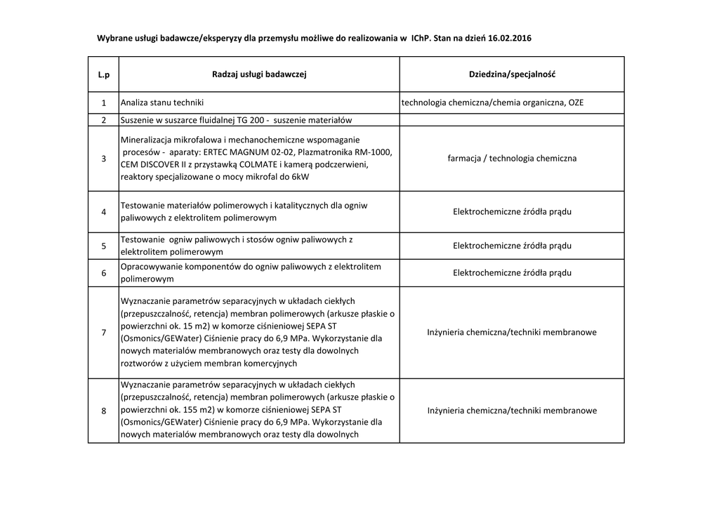 Wybrane usługi badawcze/eksperyzy dla przemysłu możliwe do realizowania w IChP. Stan na dzień 16.02.2016 Radzaj usługi badawczej L.p Dziedzina/specjalność 1 Analiza stanu techniki 2 Suszenie w suszarce fluidalnej TG 200 - suszenie materiałów 3 Mineralizacja mikrofalowa i mechanochemiczne wspomaganie procesów - aparaty: ERTEC MAGNUM 02-02, Plazmatronika RM-1000, CEM DISCOVER II z przystawką COLMATE i kamerą podczerwieni, reaktory specjalizowane o mocy mikrofal do 6kW 4 Testowanie materiałów polimerowych i katalitycznych dla ogniw paliwowych z elektrolitem polimerowym Elektrochemiczne źródła prądu 5 Testowanie ogniw paliwowych i stosów ogniw paliwowych z elektrolitem polimerowym Elektrochemiczne źródła prądu 6 Opracowywanie komponentów do ogniw paliwowych z elektrolitem polimerowym Elektrochemiczne źródła prądu 7 Wyznaczanie parametrów separacyjnych w układach ciekłych (przepuszczalność, retencja) membran polimerowych (arkusze płaskie o powierzchni ok. 15 m2) w komorze ciśnieniowej SEPA ST (Osmonics/GEWater) Ciśnienie pracy do 6,9 MPa. Wykorzystanie dla nowych materialów membranowych oraz testy dla dowolnych roztworów z użyciem membran komercyjnych 8 Wyznaczanie parametrów separacyjnych w układach ciekłych (przepuszczalność, retencja) membran polimerowych (arkusze płaskie o powierzchni ok. 155 m2) w komorze ciśnieniowej SEPA ST (Osmonics/GEWater) Ciśnienie pracy do 6,9 MPa. Wykorzystanie dla nowych materialów membranowych oraz testy dla dowolnych roztworów z użyciem membran komercyjnych technologia chemiczna/chemia organiczna, OZE farmacja / technologia chemiczna Inżynieria chemiczna/techniki membranowe Inżynieria chemiczna/techniki membranowe 9 10 11 Oznaczanie parametrów separacyjnych w układach ciekłych (przepuszczalność, retencja) membran ceramicznych o powierzchni ok. 0,03m2). Układ przepływowy (cross-flow). Wykorzystanie dla nowych materiałow membranowych w postaci modułów membranowych oraz testy dla dowolnych roztworów z użyciem membran komercynych. Instalacja mobilna Badania wielkolaboratoryjne i pilotowe procesów rozdziału membranowego (ultrafiltracja, nanofiltracja, osmoza odwrócona) z wykorzystaniem modułów membranowych typu spiral-wound (2,5x40'' powierzchnia membrany ok. 2,5 m2). Określenie i wyznaczenie parametrów procesowychparametrów w warunkach rzeczywistycg dla strumieni Okreslenie i wyznaczenie procesowych w warunkach rzeczywistych dla strumieni technologicznych. badania wielkolaboratoryjne i pilotowe procesów rozdzialu membranowego (filtracja, ultrafiltracja) z wykorzystaniem ceramicznych modułów membranowych (powierzchnia membrany ok. 0,3 m2). Stanowisko mobilne do wykorzytsania w warunkach laboratoryjnych i przemysłowych Inżynieria chemiczna/techniki membranowe Inżynieria chemiczna/techniki membranowe Inżynieria chemiczna/techniki membranowe 12 Monitorowanie przebiegu reakcji chemicznych metodą FTIR w czasie rzeczywistym z wykorzystaniem przenośnego laboratoryjnego spektrometru w podczerwieni ze światłowodem FiberConduitTM oraz oprogramowania do przetwarzania i analizy widm iC IR™ (Mettler Toledo) technologia chemiczna/analiza procesowa 13 Osadzanie galwanicznych powłok ołowianych na drobnych elementach (wymiary wanny 30x23x35 cm). Galwanotechnika 14 Wygrzewanie próbek w temperaturach do 1100˚C z możliwością zastosowania atmosfery obojętnej w oporowych piecach komorowych. Rozmiar komory do 650x600x700 mm. 15 16 Badania ekstrakcji np. surowców naturalnych za pomocą CO2 w stanie nadkrytycznym w skali laboratoryjnej (10 – 200 cm3) i w skali wielkolaboratoryjnej (do 10 litrów). Ciśnienie robocze do 30 MPa temperatura do 100 – 150 oC.prowadzonych w układach Badania laboratoryjne reakcji przepływowych pod ciśnieniem do 10 MPa w temperaturze do 300 oC lub wyższej (przy niższym ciśnieniu) Ekstrakcja nadkrytyczna Kataliza
