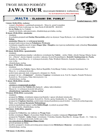 TWOJE BIURO PODRÓŻY JAWA TOUR ORAZ KSIĄDZ PROBOSZCZ ZAPRASZAJĄ NA XI PARAFIALNĄ PIELGRZYMKĘ „ MALTA - ŚLADAMI ŚW. PAWŁA” Symbol imprezy: MPS I dzień: 04.06.2016r. (sobota) - wyjazd z Karłubca w godzinach porannych – Msza św. przed wyjazdem - przejazd do Portu Lotniczego im. Jana Pawła II KRAKÓW - BALICE - lot na Maltę (do La Valetta) - transfer do hotelu, zakwaterowanie, obiadokolacja powitalna, nocleg II dzień: 05.06.2016r. (niedziela) - śniadanie - do południa przejazd nad Zatokę Marsaxlokk, pobyt na słynnym Targu Rybnym, i ew. okolicach Groty Ghar Dalam - niedzielna Masza św. w wybranym kościele - przejazd malownicza trasą na Południowe Wybrzeże - zwiedzanie megalitycznych świątyń Hagar Qim i Mnajdra oraz typowej maltańskiej osady rybackiej Marsaskala z Wieżą św. Tomasza, czas wolny - obiadokolacja, nocleg III dzień: 06.06.2016r. (poniedziałek) - śniadanie - przejazd komunikacją miejską i całodniowe zwiedzanie La Valetty – stolicy Malty: uliczki Starego Miasta, liczne tzw. „Oberże”, dawne Zajazdy rycerskie i zakonne, Kościół Karmelitanów, Kościół i Sanktuarium św. Pawła, Katedra św. Jana (Msza św. w wybranym kościele), Pałac Wielkich Mistrzów, Katedra Anglikańska, i in. - czas wolny - obiadokolacja, nocleg IV dzień: 07.06.2016r. (wtorek) - śniadanie - c.d. zwiedzanie La Valetty: Opera, Bulwar Republiki, Fortyfikacje Valetty z licznymi bastionami, Port - Msza św. w wybranym kościele - podziwianie panoram skał, związanych z dziejami św. Pawła - przejazd do tzw. „Trójmiasta” – dzielnice Cospicua i zwiedzanie m.in. Fort St. Angelo, Pomnik Wolności, Kościół św. Wawrzyńca, Pałac Inkwizytorów i in. - obiadokolacja, nocleg V dzień: 08.06.2016r. (środa) - śniadanie - całodniowy wypoczynek na plaży - ew. rejs po porcie La Valetta (dla chętnych – płatny indywidualnie) - Masza św. w wybranym kościele lub polowa - obiadokolacja regionalna z winem, nocleg* VI dzień: 09.06.2016r. (czwartek) - śniadanie - przejazd do Mdiny, zwiedzanie miejscowej Katedry i spacer uliczkami miasteczka - przejazd do Rabatu, zwiedzanie: Kościół św. Pawła z grotą, Katakumby św. Agaty, Msza św. - przejazd do Clapham Junction, podziwianie słynnych prehistorycznych kolein – wizytówki archeologicznej Malty oraz Centrum Rzemiosła Maltańskiego - późnym popołudniem spacer wzdłuż KlifówDingli, wysokich na ponad 200m - powrót do hotelu, obiadokolacja, nocleg VII dzień: 10.06.2016r. (piątek) - śniadanie - przejazd do Cirkewwa, rejs statkiem na Wyspę Gozo - krótkie zwiedzanie Mgarr z Kościołem Matki Boskiej z Lourdes i miejscem Objawienia NMP - przejazd do Victorii – stolicy Gozo i zwiedzanie: Twierdza, Katedra, Bazylika św. Jerzego, Rynek – It – Tokk i in. - Msza św. w wybranym kościele, krótki czas wolny - rejs stateczkiem do Błękitnego Okna i Groty - powrót promem na Maltę - możliwy przejazd w drodze powrotnej przez miejscowości Birkirkara i Hamrun – zwiedzanie z autokaru - obiadokolacja, nocleg VIII dzień: 11.06.2016r. (sobota) - śniadanie poranna Msza św. transfer na lotnisko w La Valetta lot do kraju (Kraków – Balice) przejazd do Karłubca wieczorem Świadczenia: - transfer autokarowy na trasie Karłubiec – Kraków (Balice) – Karłubiec - transfer autokarem na Malcie - lot na trasie Polska – La Valetta – Polska - opłaty lotniskowe i odprawa bagażowa, bagaż bilety na prom na Gozo bilety na rejs do Błękitnego Okna i do niektórych zwiedzanych obiektów (wspaniałe muzea katedralne) opieka kompetentnego pilota – przewodnika oraz lokalnego przewodnika siedem noclegów w pokojach 2 osobowych z łazienkami do pokoju 1 os. dopłata ok. 550 zł/os siedem śniadań („szwedzki stół”) i siedem obiadokolacji („szwedzki stół”) w tym jedna regionalna ubezpieczenie NW, KL i bagażu *dzień kolacji regionalnej, jak i kolejność zwiedzania może ulec zmianie Cena: 2.500 zł/os + 200 EUR/os Malta jest jedną z kolebek chrześcijaństwa. To wyspa nierozerwalnie związana z dziejami św. Pawła. Bardzo wiele tu wspaniałych świątyń katolickich (mówi się, że ok. 360) na dość małej przestrzeni. Każdy z kościołów ma swoją ciekawą historię i odrębną, interesującą architekturę. Jest też miejsce Objawienia Maryjnego. Wspaniałe krajobrazy i plaże skąpane w słońcu, mury obronne i bastiony La Valetty, megalityczne świątynie i ciepłe morze oraz śródziemnomorska roślinność, jak i egzotyczne rośliny - dopełniają reszty. Grupa śpi w jednym hotelu cały tydzień. Po śniadaniu ok. 9.00 wyjazd na zwiedzanie i Mszę św. Powrót do hotelu codziennie ok. 16.00 i jest czas wolny. Na imprezę regionalną, jak i na zwiedzanie (oprócz II dni) dowozi wynajęty autokar. Jeden dzień wolny na plażowanie lub indywidualne zwiedzanie. Płacimy w EUR. Malta jest krajem UE. ZAPISY W BIURZE TBP JAWA TOUR W GOGOLINIE - tylko osobiście. ILOŚĆ MIEJSC OGRANICZONA ZE ZGLĘDÓW LOGISTYCZNYCH Zaliczka w wysokości 1.000 zł/os (ze względu na konieczność wykupienia biletów lotniczych) RESZTA PŁATNA DO 14.02.2016r lub na spotkaniu organizacyjnym, którego termin podamy w najbliższym czasie.