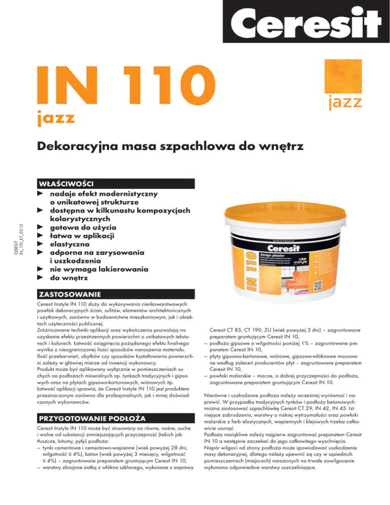 IN 110 jazz CERESIT IN_110_KT_02.15 Dekoracyjna masa szpachlowa do wnętrz WŁAŚCIWOŚCI nadaje efekt modernistyczny o unikatowej strukturze dostępna w kilkunastu kompozycjach kolorystycznych gotowa do użycia łatwa w aplikacji elastyczna odporna na zarysowania i uszkodzenia nie wymaga lakierowania do wnętrz ZASTOSOWANIE Ceresit Instyle IN 110 służy do wykonywania cienkowarstwowych powłok dekoracyjnych ścian, sufitów, elementów architektonicznych i użytkowych, zarówno w budownictwie mieszkaniowym, jak i obiektach użyteczności publicznej. Zróżnicowane techniki aplikacji oraz wykończenia pozwalają na uzyskanie efektu przestrzennych powierzchni o unikatowych teksturach i kolorach. Łatwość osiągnięcia pożądanego efektu finalnego wynika z nieograniczonej ilości sposobów nanoszenia materiału. Ilość przebarwień, ubytków czy sposobów kształtowania powierzchni zależy w głównej mierze od inwencji wykonawcy. Produkt może być aplikowany wyłącznie w pomieszczeniach suchych na podłożach mineralnych np. tynkach tradycyjnych i gipsowych oraz na płytach gipsowo-kartonowych, wiórowych itp. Łatwość aplikacji sprawia, że Ceresit Instyle IN 110 jest produktem przeznaczonym zarówno dla profesjonalnych, jak i mniej doświadczonych wykonawców. PRZYGOTOWANIE PODŁOŻA Ceresit Instyle IN 110 może być stosowany na równe, nośne, suche i wolne od substancji zmniejszających przyczepność (takich jak: tłuszcze, bitumy, pyły) podłoża: — tynki cementowe i cementowo-wapienne (wiek powyżej 28 dni, wilgotność ≤ 4%), beton (wiek powyżej 3 miesięcy, wilgotność ≤ 4%) – zagruntowane preparatem gruntującym Ceresit IN 10, — warstwy zbrojone siatką z włókna szklanego, wykonane z zaprawy Ceresit CT 85, CT 190, ZU (wiek powyżej 3 dni) – zagruntowane preparatem gruntującym Ceresit IN 10, — podłoża gipsowe o wilgotności poniżej 1% – zagruntowane preparatem Ceresit IN 10, — płyty gipsowo-kartonowe, wiórowe, gipsowo-włóknowe mocowane według zaleceń producentów płyt – zagruntowane preparatem Ceresit IN 10, — powłoki malarskie – mocne, o dobrej przyczepności do podłoża, zagruntowane preparatem gruntującym Ceresit IN 10. Nierówne i uszkodzone podłoża należy wcześniej wyrównać i naprawić. W przypadku tradycyjnych tynków i podłoży betonowych można zastosować szpachlówkę Ceresit CT 29, IN 42, IN 45. Istniejące zabrudzenia, warstwy o niskiej wytrzymałości oraz powłoki malarskie z farb elastycznych, wapiennych i klejowych trzeba całkowicie usunąć. Podłoża nasiąkliwe należy najpierw zagruntować preparatem Ceresit IN 10 a następnie zaczekać do jego całkowitego wyschnięcia. Napór wilgoci od strony podłoża może spowodować uszkodzenie masy dekoracyjnej, dlatego należy upewnić się czy w sąsiednich pomieszczeniach (miejscach) narażonych na trwałe zawilgocenie wykonano odpowiednie warstwy uszczelniające. Masa dekoracyjna Ceresit Instyle IN 110 jest gotowa do użycia. Po otworzeniu opakowania dokładnie wymieszać zawartość pojemnika przy pomocy mieszadła koszykowego. Masę dekoracyjną Ceresit Instyle IN 110 zaleca się nanosić w dwóch warstwach przy pomocy pacy ze stali nierdzewnej. Grubość jednorazowo aplikowanej warstwy nie powinna przekroczyć 3,0 mm. Po wyschnięciu warstwy podkładowej (po około 4–8 godz.) nanieść drugą warstwę tzw. wykończeniową. Łączna grubość warstw nie powinna przekroczyć 6 mm. W zależności od żądanego efektu końcowego warstwę ostateczną/ ozdobną można wykończyć na gładko lub wykonać nieregularne wzory. Nakładanie oraz wykańczanie (efekty dekoracyjne) powinno odbywać się przy nieregularnych kolistych, wertykalnych, horyzontalnych lub diagonalnych ruchach pacy. Do obróbki ostatecznej zalecane jest stosowanie pac lub kielni wykonanych z wysokogatunkowej, niskowęglowej stali nierdzewnej. Najlepsze efekty uzyskuje się przy użyciu tzw. pacy weneckiej do stiuków. Nadanie finalnej struktury powierzchni można uzyskać np. poprzez tzw. przepalanie masy dekoracyjnej, zacierając mocno i energicznie wybrane obszary. Zachowując stale wilgotny i plastyczny materiał podczas nakładania uzyskujemy powierzchnię jednorodną, gładką o zamkniętych porach. W przypadku mocnego i intensywnego ściągania/przecierania pacą nadmiaru masy powodując tzw. ”przesuszanie masy”, możemy uzyskać efekt starej, nierównomiernej, rustykalnej lub modernistycznej powierzchni. Efekty dekoracyjne np. odciśnięte elementy ozdobne, mogą być tworzone w momencie, gdy masa wstępnie jest stwardniała (nie klei się do narzędzi). W celu poprawienia odporności na wilgoć oraz zabrudzenia zalecane jest zastosować impregnat/grunt ochronny Ceresit IN 10. UWAGA Prace należy wykonywać w suchych warunkach, przy temperaturze powietrza i podłoża od +10°C do +25°C Narzędzia i świeże zabrudzenia należy myć wodą, a stwardniałe resztki usuwać mechanicznie. ZALECENIA Z uwagi na zawarte wypełniacze naturalne, mogące powodować różnice w wyglądzie – należy na jednej płaszczyźnie stosować materiał o tym samym numerze szarży produkcyjnej umieszczonym na każdym opakowaniu. Napoczęte opakowanie należy dokładnie zamykać, a jego zawartość wykorzystać w możliwie najbliższym czasie. SKŁADOWANIE Do 18 miesięcy od daty produkcji, przy składowaniu w chłodnych warunkach i w oryginalnych, nieuszkodzonych opakowaniach. Całkowicie opróżnione opakowania należy dostarczyć do recyklingu, pozostałości materiału zebrać i przekazać do utylizacji firmie posiadającej odpowiednie uprawnienia. OPAKOWANIA Wiadro 8 kg. DANE TECHNICZNE Baza: wodna dyspersja żywic akrylowych z wypełniaczami mineralnymi, pigmentami i dodatkami Gęstość: ok. 0,9 kg/dm3 Temperatura stosowania: od +10°C do +25°C Czas przesychania: ok. 4–8h Grubość zalecana: do 3 mm w jednej warstwie Przyczepność do betonu: 1,8 MPa wg PN-EN 15824:2010 Paroprzepuszczalno