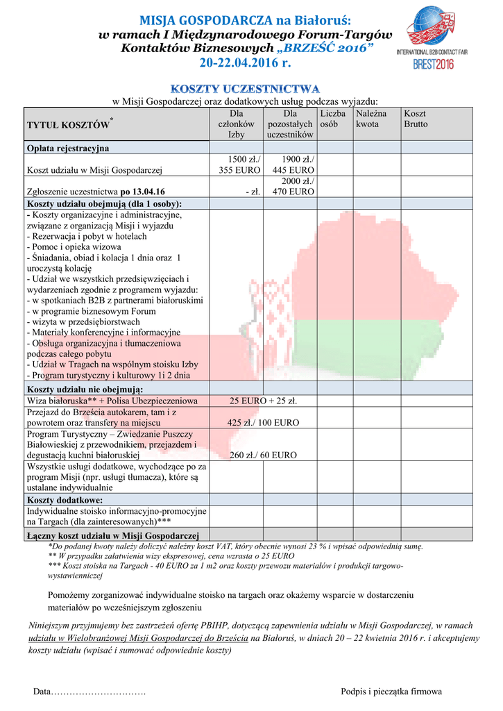MISJA GOSPODARCZA na Białoruś: w ramach I Międzynarodowego Forum-Targów Kontaktów Biznesowych „BRZEŚĆ 2016” 20-22.04.2016 r. w Misji Gospodarczej oraz dodatkowych usług podczas wyjazdu: TYTUŁ KOSZTÓW * Dla członków Izby Dla Liczba pozostałych osób uczestników Należna kwota Koszt Brutto Opłata rejestracyjna Koszt udziału w Misji Gospodarczej Zgłoszenie uczestnictwa po 13.04.16 Koszty udziału obejmują (dla 1 osoby): - Koszty organizacyjne i administracyjne, związane z organizacją Misji i wyjazdu - Rezerwacja i pobyt w hotelach - Pomoc i opieka wizowa - Śniadania, obiad i kolacja 1 dnia oraz 1 uroczystą kolację - Udział we wszystkich przedsięwzięciach i wydarzeniach zgodnie z programem wyjazdu: - w spotkaniach B2B z partnerami białoruskimi - w programie biznesowym Forum - wizyta w przedsiębiorstwach - Materiały konferencyjne i informacyjne - Obsługa organizacyjna i tłumaczeniowa podczas całego pobytu - Udział w Tragach na wspólnym stoisku Izby - Program turystyczny i kulturowy 1i 2 dnia Koszty udziału nie obejmują: Wiza białoruska** + Polisa Ubezpieczeniowa Przejazd do Brześcia autokarem, tam i z powrotem oraz transfery na miejscu Program Turystyczny – Zwiedzanie Puszczy Białowieskiej z przewodnikiem, przejazdem i degustacją kuchni białoruskiej Wszystkie usługi dodatkowe, wychodzące po za program Misji (npr. usługi tłumacza), które są ustalane indywidualnie Koszty dodatkowe: Indywidualne stoisko informacyjno-promocyjne na Targach (dla zainteresowanych)*** 1500 zł./ 355 EURO - zł. 1900 zł./ 445 EURO 2000 zł./ 470 EURO 25 EURO + 25 zł. 425 zł./ 100 EURO 260 zł./ 60 EURO Łączny koszt udziału w Misji Gospodarczej *Do podanej kwoty należy doliczyć należny koszt VAT, który obecnie wynosi 23 % i wpisać odpowiednią sumę. ** W przypadku załatwienia wizy ekspresowej, cena wzrasta o 25 EURO *** Koszt stoiska na Targach - 40 EURO za 1 m2 oraz koszty przewozu materiałów i produkcji targowowystawienniczej Pomożemy zorganizować indywidualne stoisko na targach oraz okażemy wsparcie w dostarczeniu materiałów po wcześniejszym zgłoszeniu . Niniejszym przyjmujemy bez zastrzeżeń ofertę PBIHP, dotyczącą zapewnienia udziału w Misji Gospodarczej, w ramach udziału w Wielobranżowej Misji Gospodarczej do Brześcia na Białoruś, w dniach 20 – 22 kwietnia 2016 r. i akceptujemy koszty udziału (wpisać i sumować odpowiednie koszty) Data…………………………. Podpis i pieczątka firmowa