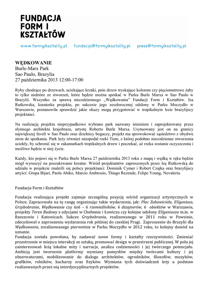 WĘDKOWANIE Burle-Marx Park Sao Paulo, Brazylia 27 października 2013 12:00-17:00 Ryby chodzące po drzewach, uciekające krzaki, pnie drzew tryskające kolorem czy pięciometrowe żaby to tylko niektóre ze stworzeń, które będzie można spotkać w Parku Burle Marxa w Sao Paulo w Brazylii. Wszystko za sprawą niecodziennego „Wędkowania” Fundacji Form i Kształtów. Iza Rutkowska, kuratorka projektu, po sukcesie jego zeszłorocznej odsłony w Parku Moczydło w Warszawie, postanowiła sprawdzić jakie okazy mogą przygotować w tropikalnym lesie brazylijscy projektanci. Na realizację projektu nieprzypadkowo wybrano park nazwany imieniem i zaprojektowany przez słynnego architekta krajobrazu, artystę Roberto Burle Marxa. Usytuowany jest on na granicy największej faveli w Sao Paulo oraz dzielnicy bogaczy, projekt ma sprowokować sąsiedztwo z obydwu stron do spotkania. Park leży również nieopodal rzeki Tiete, z której podobno niecodzienne stworzenia uciekły, by schronić się w zakamarkach tropikalnych drzew i poczekać, aż rzeka zostanie oczyszczona i możliwe będzie w niej życie. Każdy, kto pojawi się w Parku Burle Marxa 27 października 2013 roku z mapą i wędką w ręku będzie mógł wyruszyć na poszukiwanie kreatur. Wśród projektantów zaproszonych przez Izę Rutkowską do udziału w projekcie znaleźli się polscy projektanci: Dominik Cymer i Robert Czajka oraz brazylijscy artyści: Grupa Bijari, Paola Abiko, Marcio Ambrosio, Thiago Rezende, Felipe Young, Novaleria. Fundacja Form i Kształtów Fundacja realizująca projekt zajmuje szczególną pozycję wśród organizacji artystycznych w Polsce. Zapracowała na tę rangę organizując takie wydarzenia, jak: Plac Zabawiciela, EUgeniusz, Grzybobranie, Wędkowanie czy 6x6 – 6 rzemieślników, 6 dizajnerów, 6 obiektów w Warszawie, projekty Teren Budowy z edycjami w Chełmnie i Łowiczu czy kolejne odsłony EUgeniusza m.in. w Rzeszowie i Katowicach. Sukces Grzybobrania, realizowanego w 2011 roku w Powsinie, zdecydował o zaproszeniu wydarzenia rok później do czeskiej Pragi. Zaproszenie do Brazylii dla Wędkowania, zrealizowanego pierwotnie w Parku Moczydło w 2012 roku, to kolejny dowód na uznanie. Fundacja została powołana, by nadawać nowe formy i kształty rzeczywistości. Zmieniać przestrzenie w miejsca interakcji ze sztuką, promować design w przestrzeni publicznej. W polu jej zainteresowań leżą lokalne mity i narracje, analiza codzienności i jej twórczego potencjału. Ambicją jest tworzenie platformy wymiany pomysłów między twórcami kultury i jej obserwatorami, mobilizowanie do dialogu architektów, ogrodników, filozofów, muzyków, grafików, rolników, kucharzy oraz fizyków. Wymiana tych doświadczeń leży u podstaw realizowanych przez nią interdyscyplinarnych projektów. Iza Rutkowska Jest założycielką i autorką wszystkich wydarzeń realizowanych w ramach Fundacji Form i Kształtów. Jej projekty w przestrzeni publicznej są egalitarne, przyciągają osoby o każdej profesji i w każdym wieku. W plebiscycie Gazety Wyborczej Wdechy 2012 nominowana była przez redakcję w kategorii Człowiek Roku za niezwykłą wyobraźnię i dodawanie miastu kolorów, za akcje: Grzybobranie, EUgeniusz, Osiedlamy się! W grudniu 2013 księgarniach pojawi się książka Izy Rutkowskiej „Puszczam oko w przestrzeń” składająca się z kilkunastu wywiadów z najciekawszymi artystami landratowymi z całego świata. Kuratorka i autorka instalacji „Ryby chodzące po drzewach” – Iza Rutkowska www.formyiksztalty.pl Projektanci: „Szuwary” Dominik Cymer www.dominikcymer.pl „Dmuchane Ryby” Robert Czajka www.papierowemiasto.com Bijari www.bijari.com.br „Lilie” Paola Abiko www.paolaabiko.com „Zagubiony skafander” Marcio Ambrosio www.marcioambrosio.com „Rzeka” Thiago Rezende www.facebook.com/homemnaagulha, http://thiago220781.wix.com/homemnaagulha „Pień drzewa tryskający kolorem” Felipe Young http://flipink.blogspot.com.br/ „Jaszczurka” O Silva www.osilva.com.br Dofinansowano ze środków Ministra Kultury i Dziedzictwa Narodowego oraz Ambasady Rzeczypospolitej Polskiej w Brazylii i Fundacji Arona Birmana Patronat: