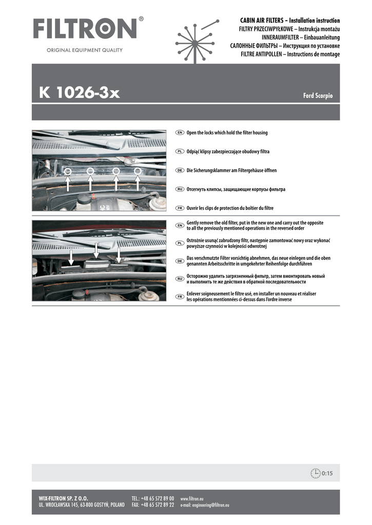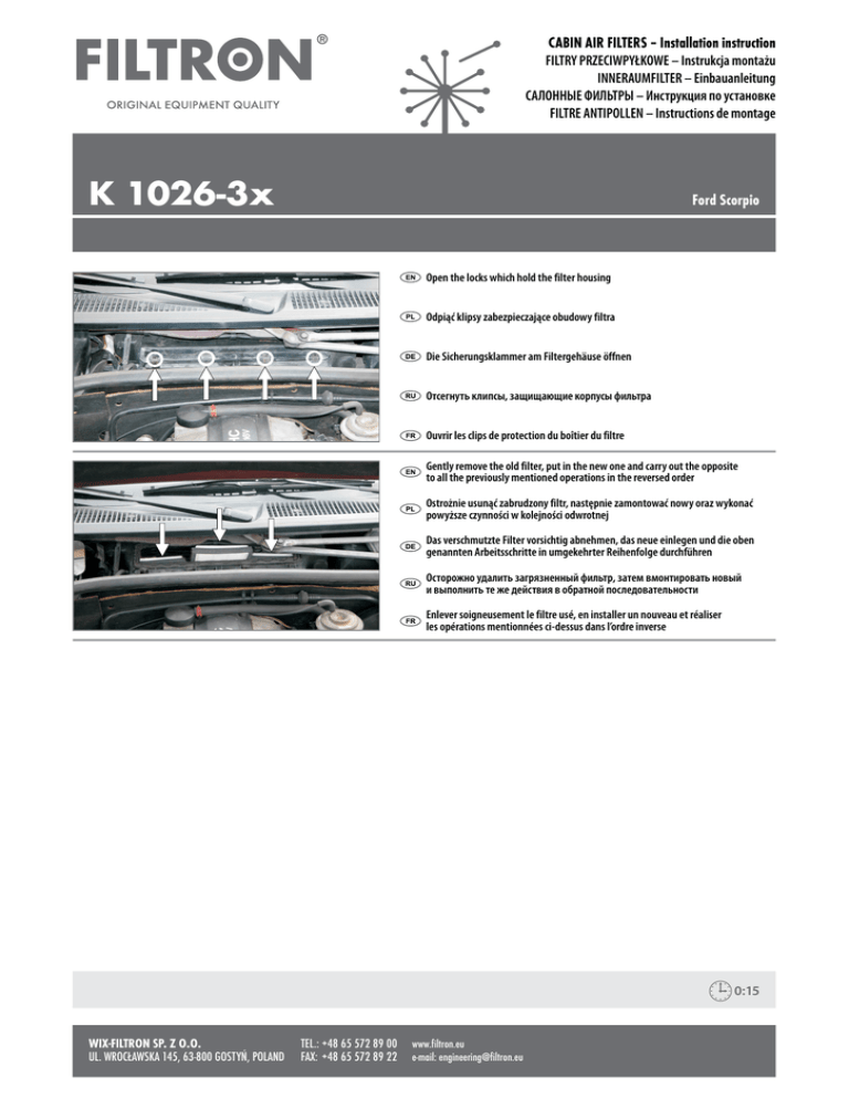 CABIN AIR FILTERS – Installation instruction FILTRY PRZECIWPYŁKOWE – Instrukcja montażu INNERAUMFILTER – Einbauanleitung САЛОННЫЕ ФИЛЬТРЫ – Инструкция по установке FILTRE ANTIPOLLEN – Instructions de montage K 1026-3x Ford Scorpio Open the locks which hold the filter housing Odpiąć klipsy zabezpieczające obudowy filtra Die Sicherungsklammer am Filtergehäuse öffnen Отсегнуть клипсы, защищающие корпусы фильтра Ouvrir les clips de protection du boîtier du filtre Gently remove the old filter, put in the new one and carry out the opposite to all the previously mentioned operations in the reversed order Ostrożnie usunąć zabrudzony filtr, następnie zamontować nowy oraz wykonać powyższe czynności w kolejności odwrotnej Das verschmutzte Filter vorsichtig abnehmen, das neue einlegen und die oben genannten Arbeitsschritte in umgekehrter Reihenfolge durchführen Осторожно удалить загрязненный фильтр, затем вмонтировать новый и выполнить те же действия в обратной последовательности Enlever soigneusement le filtre usé, en installer un nouveau et réaliser les opérations mentionnées ci-dessus dans l’ordre inverse 0:15 WIX-FILTRON SP. Z O.O. TEL.:+48 65 572 89 00 www.filtron.eu UL. WROCŁAWSKA 145, 63-800 GOSTYŃ, POLAND FAX: +48 65 572 89 22 e-mail: [email protected]