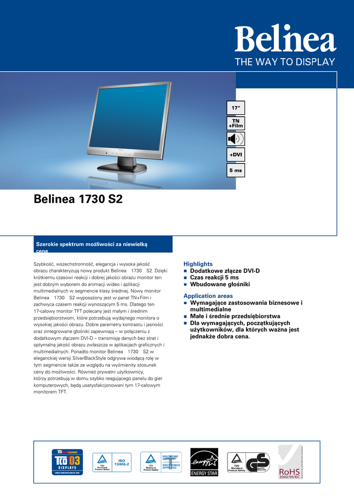 Belinea 1730 S2 Szerokie spektrum możliwości za niewielką cenę Szybkość, wszechstronność, elegancja i wysoka jakość obrazu charakteryzują nowy produkt Belinea 1730 S2. Dzięki krótkiemu czasowi reakcji i dobrej jakości obrazu monitor ten jest dobrym wyborem do animacji wideo i aplikacji multimedialnych w segmencie klasy średniej. Nowy monitor Belinea 1730 S2 wyposażony jest w panel TN+Film i zachwyca czasem reakcji wynoszącym 5 ms. Dlatego ten 17-calowy monitor TFT polecany jest małym i średnim przedsiębiorstwom, które potrzebują wydajnego monitora o wysokiej jakości obrazu. Dobre parametry kontrastu i jasności oraz zintegrowane głośniki zapewniają – w połączeniu z dodatkowym złączem DVI-D – transmisję danych bez strat i optymalną jakość obrazu zwłaszcza w aplikacjach graficznych i multimedialnych. Ponadto monitor Belinea 1730 S2 w eleganckiej wersji SilverBlackStyle odgrywa wiodącą rolę w tym segmencie także ze względu na wyśmienity stosunek ceny do możliwości. Również prywatni użytkownicy, którzy potrzebują w domu szybko reagującego panelu do gier komputerowych, będą usatysfakcjonowani tym 17-calowym monitorem TFT. Highlights Dodatkowe złącze DVI-D Czas reakcji 5 ms Wbudowane głośniki Application areas Wymagające zastosowania biznesowe i multimedialne Małe i średnie przedsiębiorstwa Dla wymagających, początkujących użytkowników, dla których ważna jest jednakże dobra cena. Belinea 1730 S2 Technical data Art. No. 111763 Wyświetlacz Rodzaj wyświetlacza Technologia panelowa Przekątna Widoczna przekątna obrazu Rozmiar obrazu S x W (maks.) Rozdzielczość nominalna Rozstaw pikseli Wyświetlane kolory (maks.) Jasność (typowa) Podświetlenie tła Kontrast (typowy) Kąt widzenia poz./pion. C/R 10:1 Kąt widzenia poz./pion. C/R 5:1 Powłoka przeciwodblaskowa Czas reakcji: (typowy) Czas reakcji TFT / Activ Matrix TN + Film 17 cali 43.18 cm 338 x 270 mm 1280 x 1024 pikseli 0.264 mm 16,7 mln 300 cd/m² 4 lampy CCFL 1000:1 160° / 160° 170° / 170° Anti Glare 5 ms 5 ms Dane elektryczne Częstotliwość pozioma Częstotliwość pionowa Maks. szerokość taśmy wideo (dot rate) Zasilanie sieciowe Częstotliwość sieciowa Pobór energii (ON) Zużycie energii (sleep) Pobór mocy (OFF) Sygnał wejściowy Moc wyjściowa wzmacniacza audio (2x) 29 - 83 kHz 55 - 75 Hz 135 MHz 100 - 240 V 50 - 60 Hz 26 W 0,9 W 0,7 W cyfrowy+analogowy 1,5 W Interfejsy Złącze mini-d-sub (15 pin) DVI-D (24-stykowe, HDCP) Wejście audio Złącze do słuchawek USB Hub (wewn.) tak tak tak tak nie Cechy Composite Sync Sync On Green Liczba pozycji zapisu (preset) Liczba pozycji zapisu (użytkownik) OSD Głośnik (wbudowany) Zasilacz Możliwość obrotu o 90° Możliwość ustawiania wysokości Kąt pochylenia do tyłu Kąt pochylenia do przodu Obrót w prawo Obrót w lewo Kompatybilność z blokadą Kensington Kolor Możliwości ustawień (OSD) Jasność Kontrast Automatyczne wyśrodkowanie obrazu Temperatura barw Kalibracja kolorów Obraz w niskiej rozdzielczości Pełny ekran Odwzorowanie 1:1 Wskaźnik częstotliwości Reset Wybór sygnału wideo OSD Timer Pozycja OSD Język(i) OSD tak nie 16 sztuk(i) 9 sztuk(i) tak tak wewnętrzny nie 0 mm 22 ° 5° 0° 0° tak (tylna część obudowy) srebrno-czarny tak tak tak tak tak Pełny ekran tak nie tak tak tak tak tak Głośność (OSD) Wyciszanie (OSD) niemiecki, angielski, francuski, włoski, niderlandzki, polski, rosyjski, hiszpański tak tak Temperatura barw 5400K 6500K 9300K Użytkownik sRGB nie tak tak tak tak Możliwości ustawień (zew.) Jasność (zewn.) Kontrast (zewn.) Automatyczne wyśrodkowanie obrazu (zewn.) Wyłączenie głosu (zewnętrzne) Blokada przycisku wł./wył. Blokada przycisku OSD Menu Power nie nie tak nie nie tak tak tak Maksymalna częstotliwość odświeżania obrazu (zależna od rozdzielczości) 640 * 480 75 Hz 800 * 600 75 Hz 1024 * 768 75 Hz 1152 * 864 75 Hz 1280 * 1024 75 Hz Znaki jakości/certyfikaty/standardy Plug & Play DDC 1 DDC 2B DDC-CI Energy Star TCO 03 TUEV GS Ergonomia TUEV Standard VESA (Odległość pomiędzy pikselami) Kompatybilność z Mac ISO 13406-2 Oznaczenie CE wg dyrektyw UE tak tak tak tak tak tak tak tak 100 x 100 mm tak tak tak Akcesoria Kabel wideo (15 pol. Mini D-Sub; długość 1,8 m) Kabel DVI-D (1,8 m, opcja) Kabel audio Kabel sieciowy Oprogramowanie dla funkcji Pivot (opcjonalnie) tak (Nr art. 30 86 91) tak tak nie Instrukcja obsługi Liczba języków instrukcji obsługi 14 Wymiary (netto) Szerokość Wysokość (netto) Głębokość (netto) Waga (netto) 368 mm 381 mm 205 mm 3.9 kg Wymiary (bez podstawy) Szerokość (bez podstawy) Wysokość (bez podstawy) Głębokość (bez podstawy) 368 mm 325 mm 62 mm Wymiary (brutto) Waga (brutto) 5.0 kg