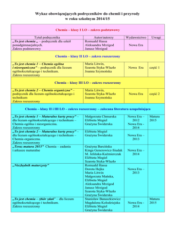Wykaz obowiązujących podręczników do chemii i przyrody w roku szkolnym 2014/15 Chemia – klasy I LO – zakres podstawowy Tytuł podręcznika „To jest chemia „ – podręcznik dla szkół ponadgimnazjalnych. Zakres podstawowy Autor/autorzy Romuald Hassa Aleksandra Mrzigod Janusz Mrzigod Wydawnictwo Uwagi Nowa Era Chemia – klasy II LO – zakres rozszerzony „To jest chemia 1 – Chemia ogólna i nieorganiczna” – podręcznik dla liceum ogólnokształcącego i technikum. Zakres rozszerzony Maria Litwin, Szarota Styka-Wlazło Joanna Szymońska Nowa Era część 1 Nowa Era część 2 Chemia – klasy III LO – zakres rozszerzony „To jest chemia 2 – Chemia organiczna” – podręcznik dla liceum ogólnokształcącego i technikum Zakres rozszerzony Maria Litwin, Szarota Styka-Wlazło Joanna Szymońska Chemia – klasy II i III LO – zakres rozszerzony – zalecana literatura uzupełniająca „To jest chemia 1 – Maturalne karty pracy” – dla liceum ogólnokształcącego i technikum – Chemia ogólna i nieorganiczna. Zakres rozszerzony „To jest chemia 2 – Maturalne karty pracy” – dla liceum ogólnokształcącego i technikum – Chemia organiczna. Zakres rozszerzony „Teraz matura 2015” Chemia – zadania i arkusze maturalne „Niezbędnik maturzysty” „To jest chemia – zbiór zdań” – dla liceum ogólnokształcącego i technikum. Zakres rozszerzony Małgorzata Chmurska Elżbieta Megiel Grażyna Świderska Elżbieta Megiel Grażyna Świderska Grażyna Barcińska Kinga Generowicz-Siudak M. Jelińska-Kaźmierczuk Elżbieta Megiel Szarota Styka-Wlazło Romuald Hassa Dorota Hejka Maria Litwin Małgorzata Mańska, Elżbieta Megiel Aleksandra Mrzigod Janusz Mrzigod Szarota Styka-Wlazło Grażyna Świderska Stanisław Banaszkiewicz Magdalena Kołodziejska Elżbieta Megiel Grażyna Świderska Nowa Era – 2012 Nowa Era 2014 Matura 2015 Nowa Era – 2013 Nowa Era – 2014 Nowa Era – 2013 Nowa Era 2014 Matura 2015 Przyroda – przedmiot uzupełniający Przyroda – klasy II LO „Przyroda 1” – liceum ogólnokształcące i technikum (fizyka, chemia. biologia, geografia) Materiały merytoryczne przeznaczone do nauki przyrody w liceum ogólnokształcącym i technikum Mirosław Gawlikowski Romuald Hassa Marek Kaczmarzyk Aleksandra Mrzigod Marek Więckowski Nowa Era 2013 część 1 Mirosław Gawlikowski Romuald Hassa Marek Kaczmarzyk Aleksandra Mrzigod Marek Więckowski Nowa Era 2013 cześć 2 Przyroda – klasy III LO „Przyroda 2” – liceum ogólnokształcące i technikum (fizyka, chemia. biologia, geografia) Materiały merytoryczne przeznaczone do nauki przyrody w liceum ogólnokształcącym i technikum