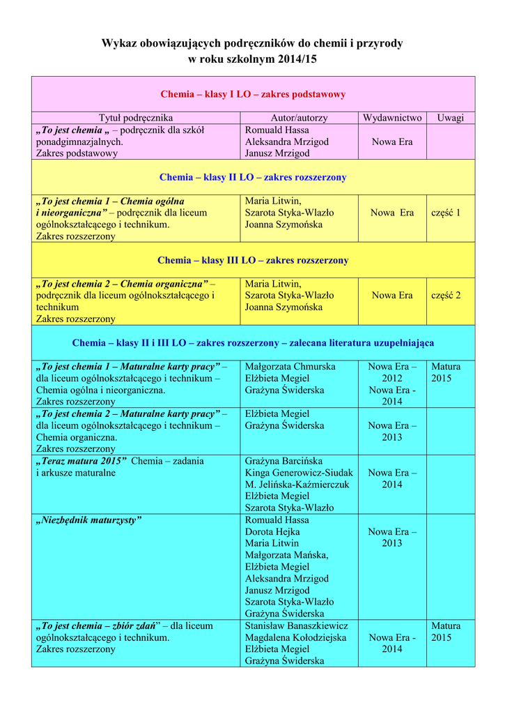 Wykaz obowiązujących podręczników do chemii i przyrody w roku