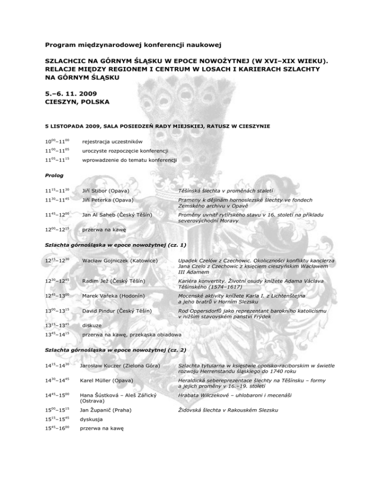 Program międzynarodowej konferencji naukowej SZLACHCIC NA GÓRNYM ŚLĄSKU W EPOCE NOWOŻYTNEJ (W XVI–XIX WIEKU). RELACJE MIĘDZY REGIONEM I CENTRUM W LOSACH I KARIERACH SZLACHTY NA GÓRNYM ŚLĄSKU 5.–6. 11. 2009 CIESZYN, POLSKA 5 LISTOPADA 2009, SALA POSIEDZEŃ RADY MIEJSKIEJ, RATUSZ W CIESZYNIE 1000–1100 rejestracja uczestników 00 05 uroczyste rozpoczęcie konferencji 05 15 wprowadzenie do tematu konferencji 11 –11 11 –11 Prolog 1115–1130 Jiří Stibor (Opava) Těšínská šlechta v proměnách staletí 11 –11 Jiří Peterka (Opava) Prameny k dějinám hornoslezské šlechty ve fondech Zemského archivu v Opavě 1145–1200 Jan Al Saheb (Český Těšín) Proměny uvnitř rytířského stavu v 16. století na příkladu severovýchodní Moravy 1200–1215 przerwa na kawę 30 45 Szlachta górnośląska w epoce nowożytnej (cz. 1) 1215–1230 Wacław Gojniczek (Katowice) Upadek Czelów z Czechowic. Okoliczności konfliktu kanclerza Jana Czelo z Czechowic z księciem cieszyńskim Wacławem III Adamem 1230–1245 Radim Jeţ (Český Těšín) Kariéra konvertity. Životní osudy knížete Adama Václava Těšínského (1574–1617) 1245–1300 Marek Vařeka (Hodonín) Mocenské aktivity knížete Karla I. z Lichtenštejna a jeho bratrů v Horním Slezsku 1300–1315 David Pindur (Český Těšín) Rod Oppersdorfů jako reprezentant barokního katolicismu v nižším stavovském panství Frýdek 1315–1345 diskuze 45 15 13 –14 przerwa na kawę, przekąska obiadowa Szlachta górnośląska w epoce nowożytnej (cz. 2) 1415–1430 Jarosław Kuczer (Zielona Góra) Szlachta tytularna w księstwie opolsko-raciborskim w świetle rozwoju Herrenstandu śląskiego do 1740 roku 1430–1445 Karel Müller (Opava) Heraldická sebereprezentace šlechty na Těšínsku – formy a jejich proměny v 16.–19. století 1445–1500 Hana Šústková – Aleš Zářický (Ostrava) Hrabata Wilczekové – uhlobaroni i mecenáši 1500–1515 Jan Ţupanič (Praha) Židovská šlechta v Rakouském Slezsku 15 45 dyskusja 45 00 przerwa na kawę 15 –15 15 –16 Między Austrią a Prusami (cz. 1) 1600–1615 Małgorzata Konopnicka (Zielona Góra) Między lojalizmem wobec Habsburgów a pruską rzeczywistością. Szlachta górnośląska na dworze pruskim (1740–1806) 1615–1630 Milan Myška (Ostrava) Albert Josef hrabě Hodic – slezský šlechtic mezi Rakouskem a Pruskem 1630–1645 Tomasz Jaworski (Zielona Góra) Von Richthofen – od szlachectwa do triumfu intelektu 45 15 16 –17 dyskusja 1900 kolacja, spotkanie towarzyskie (Hotel Piast, ul. Nádraţní 18, Český Těšín) 6 LISTOPADA 2009, SALA KONFERENCYJNA UNIWERSYTETU ŚLĄSKIEGO, CIESZYN, UL. BIELSKA 62 845–900 rejestracja, rozpoczęcie Między Austrią a Prusami (cz. 2) 900–915 Dušan Uhlíř (Opava) Rodina knížat Lichnovských z Voštic mezi Vídní a Berlínem 9 –9 Jiří Jung (Ostrava) „Chuchelná – Berlín.“ Kulturní a společenské styky knížete Karla Maxe Lichnowského a jeho ženy Mechtildy s berlínskou společností v první třetině 20. století 930–945 Václav Horčička (Praha) Vyvlastnění majetku knížete Františka Josefa II. von und zu Liechtenstein v Československu v roce 1945 a jeho dopad na československo-lichtenštejnské vztahy v poválečném období 15 30 945–1015 15 30 10 –10 dyskusja przerwa na kawę Migracja i kariera (cz. 1) 1030–1045 Bożena Czwojdrak (Katowice) Jan Mężyk z Dąbrowy(†1437) – Ślązak w służbie Korony 10 –11 Petr Kozák (Opava) Z dolnoslezské Olešnice do hlavního města Českého království. Pozoruhodný život opavského zemského hejtmana Bernarda Bírky z Násilé (†1483) 1100–1115 Jerzy Sperka (Katowice) Migracja szlachty górnośląskiej do Królestwa Polskiego i jej kariery w późnym średniowieczu (wybrane przykłady) 1115–1130 Jan Štěpán (Olomouc) Kariéra slezského šlechtice ve vztahu k olomouckému biskupství na příkladu Václava Pavlovského z Pavlovic – – mezi determinujícím nepotismem a arivismem 1130–1200 dyskusja 45 00 00 45 12 –13 przerwa obiadowa Migracja i kariera (cz. 2) 1345–1400 Sławomir Górzyński (Warszawa) Rodzina książąt Sułkowskich z Bielska – kariera od szlachcica do księcia 1400–1415 Jiří Kubeš (Pardubice) Z Doupova do Tworogu. Životní osudy Franze Julia Verduga (1661–1712) mezi Čechami a Slezskem 1415–1430 Tomáš Krejčík (Ostrava) Antonín Wittmann von Denglaz – v cizích službách 14 –14 Jiří Brňovják (Ostrava) Příklady cizích šlechtických rodů usazený na Opavsku na přelomu 19. a 20. století 1445–1500 dyskusja końcowa 30 00 15 45 zakończenie konferencji Organizatorzy konferencji Katedra Historii i Centrum Historii Gospodarczej i Społecznej Uniwersytetu Ostrawskiego w Ostrawie Nobilitas in historia moderna przy Uniwersytecie w Ostrawie (seria wydawnicza) Instytut Historii Uniwersytetu Śląskiego w Katowicach Muzeum Ziemi Cieszyńskiej w Czeskim Cieszynie Sponsorzy konferencji Miasto Cieszyn Hotel Piast (Český Těšín) Stronice webove Katedra Historii Uniwersytetu Ostrawskiego w Ostrawie – http://ff.osu.cz/khi/ Centrum Historii Gospodarczej i Społecznej Uniwersytetu Ostrawskiego w Ostrawie – http://ff.osu.cz/chd/ Instytut Historii Uniwersytetu Śląskiego w Katowicach – http://www.historia.us.edu.pl/ Muzeum Ziemi Cieszyńskiej w Czeskim Cieszynie – http://www.muzeumct.cz/ Organizacja - kontakt: Mgr. Jiří Brňovják, Ph.D. Katedra historie a Centrum pro hospodářské a sociální dějiny Filozofická fakulta Ostravské univerzity v Ostravě Reální 5, 701 03 Ostrava Česká republika, [email protected]