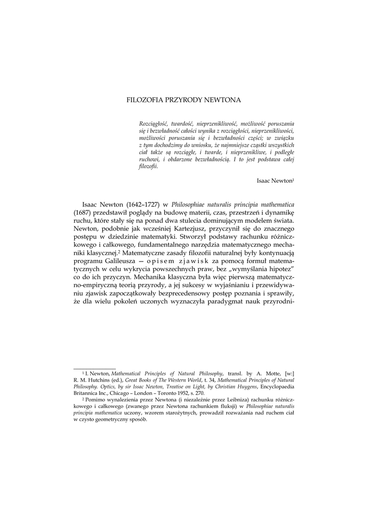 FILOZOFIA PRZYRODY NEWTONA Rozciągłość, twardość, nieprzenikliwość, możliwość poruszania się i bezwładność całości wynika z rozciągłości, nieprzenikliwości, możliwości poruszania się i bezwładności części; w związku z tym dochodzimy do wniosku, że najmniejsze cząstki wszystkich ciał także są rozciągłe, i twarde, i nieprzenikliwe, i podległe ruchowi, i obdarzone bezwładnością. I to jest podstawa całej filozofii. Isaac Newton1 Isaac Newton (1642–1727) w Philosophiae naturalis principia mathematica (1687) przedstawił poglądy na budowę materii, czas, przestrzeń i dynamikę ruchu, które stały się na ponad dwa stulecia dominującym modelem świata. Newton, podobnie jak wcześniej Kartezjusz, przyczynił się do znacznego postępu w dziedzinie matematyki. Stworzył podstawy rachunku różniczkowego i całkowego, fundamentalnego narzędzia matematycznego mechaniki klasycznej.2 Matematyczne zasady filozofii naturalnej były kontynuacją programu Galileusza — o p i s e m z j a w i s k za pomocą formuł matematycznych w celu wykrycia powszechnych praw, bez „wymyślania hipotez” co do ich przyczyn. Mechanika klasyczna była więc pierwszą matematyczno-empiryczną teorią przyrody, a jej sukcesy w wyjaśnianiu i przewidywaniu zjawisk zapoczątkowały bezprecedensowy postęp poznania i sprawiły, że dla wielu pokoleń uczonych wyznaczyła paradygmat nauk przyrodni- _____________ 1 I. Newton, Mathematical Principles of Natural Philosophy, transl. by A. Motte, [w:] R. M. Hutchins (ed.), Great Books of The Western World, t. 34, Mathematical Principles of Natural Philosophy. Optics, by sir Issac Newton, Treatise on Light, by Christian Huygens, Encyclopaedia Britannica Inc., Chicago – London – Toronto 1952, s. 270. 2 Pomimo wynalezienia przez Newtona (i niezależnie przez Leibniza) rachunku różniczkowego i całkowego (zwanego przez Newtona rachunkiem fluksji) w Philosophiae naturalis principia mathematica uczony, wzorem starożytnych, prowadził rozważania nad ruchem ciał w czysto geometryczny sposób. 144 ATOMIZM W FIZYCE KLASYCZNEJ czych.3 Pogląd głoszący, że wszelkie procesy fizyczne są ostatecznie procesami czysto mechanicznymi nazwano m e c h a n i c y z m e m.4 Newton był twórcą mechaniki i zarazem zwolennikiem atomistycznej koncepcji materii. „Należy jednak podkreślić, że mechanicyzm to przede wszystkim wskazanie na własności mechaniczne, takie jak sprężystość, lepkość i ciśnienie, jako podstawowe dla materii, a na mechanikę jako na podstawową teorię przyrodniczą. Przekonanie o atomowej budowie materii jest założeniem niezależnym od mechaniki”.5 Kartezjusz na przykład, który sformułował całkowicie mechanistyczną koncepcję przyrody, był przeciwnikiem atomizmu. Dla zwolenników teorii Kartezjusza, w której wszelkie oddziaływania między ciałami uznawano za rezultat bezpośredniego kontaktu, w Newtonowskiej teorii grawitacji dopatrywano się nawet ponownego wprowadzenia do opisu przyrody jakości ukrytych, usuniętych z ontologicznego modelu świata przez zwolenników mechanicyzmu.6 W dziele Newtona obecne są dwie warstwy — naukowa i filozoficzna.7 Ponieważ matematyczne zasady filozofii przyrody mają w myśli Newtona znaczenie podstawowe, analiza poglądów dotyczących materii, czasu i przestrzeni wymaga krótkiego omówienia zasad mechaniki. Nie należy _____________ 3 Chociaż powstanie mechaniki kwantowej i teorii względności obaliło Newtonowskie przekonania o absolutnym charakterze czasu i przestrzeni oraz zachwiało wiarę w deterministyczne prawa przyrody, to jednak nie przekreśliło znaczenia samej mechaniki Newtona, lecz podważyło jedynie przekonanie o jej uniwersalności. W obszarze doświadczenia ograniczonym do sfery makroskopowej fizycy nadal stosują z powodzeniem mechanikę klasyczną. 4 Dodać jednak trzeba, że choć Newtonowski obraz świata zwykło się nazywać „światem-maszyną”, to całokształt filozoficznych poglądów samego Newtona daleki był od tego, co współcześnie określamy mianem filozofii mechanicyzmu. Dla Newtona matematyka, mechanika i optyka stanowiły tylko drobną część jego szerokich zainteresowań — uczony zajmował się również alchemią, astrologią, historią i teologią, a pojęcie siły przyciągania działającej na odległość sytuuje nawet koncepcję Newtona w opozycji do „czystego mechanicyzmu”, jakim była Kartezjańska koncepcja oddziaływań przez bezpośredni kontakt. Dla Newtona „koncepcje metafizyczne i teologiczne były gwarancją logicznej spójności jego systemu” (A. Teske, Wolterowskie „Elementy filozofii Newtona” — ich znaczenie dawniej i dziś, [w:] Voltaire, Elementy filozofii Newtona, tłum. H. Konczewska, PWN, Warszawa 1956, s. XXVII); por. także M. Heller, Bóg i materia, [w:] M. Heller, J. Życiński, Wszechświat…, s. 85–95. O alchemicznych zainteresowaniach Newtona por. Ch. Webster, From Paracelsus to Newton. Magic and the Modern Science, Cambridge University Press, Cambridge – London – New York – New Rochelle – Melbourne – Sydney 1980; S. I. Wawiłow, Izaak Newton, tłum. J. Guranowski, Czytelnik, Spółdzielnia Wydawniczo-Oświatowa, Kraków 1952 (rozdz. XI, Chemiczne i alchemiczne prace Newtona, s. 165–176); K. Figala, Newton’s Alchemy, [w:] I. B. Cohen, G. E. Smith (eds.), The Cambridge Companion to Newton, Cambridge University Press, Cambridge 2002, s. 370–384. 5 M. Tempczyk, Fizyka…, s. 28. 6 Por. I. B. Cohen, Revolution…, s. 159. 7 Por. A. Rupert Hall, M. Boas Hall (eds.), Unpublished Scientific Papers of Isaac Newton. A Selection from the Portsmouth Collection in the University Library, Cambridge, Cambridge University Press, Cambridge 1962, s. 184. ATOMIZM NEWTONA 145 jednak przy tym zapominać, że dla samego Newtona ukoronowaniem teorii matematyczno-empirycznych były koncepcje metafizyczne teologiczne.8 8.1 DYNAMIKA Newton sformułował trzy zasady dy