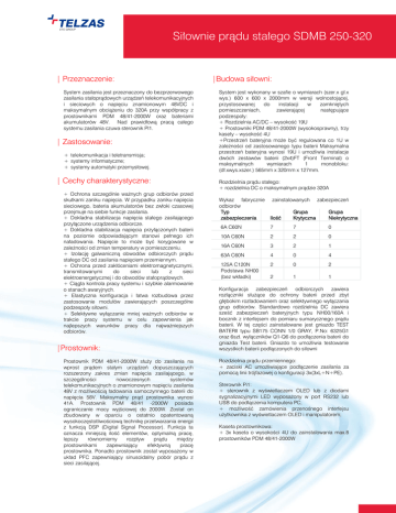 Siłownie prądu stałego SDMB 250-320 | Przeznaczenie: System zasilania jest przeznaczony do bezprzerwowego zasilania stałoprądowych urządzeń telekomunikacyjnych i sieciowych o napięciu znamionowym 48VDC i maksymalnym obciążeniu do 320A przy współpracy z prostownikami PDM 48/41-2000W oraz bateriami akumulatorów 48V. Nad prawidłową pracą całego systemu zasilania czuwa sterownik PI1. | Zastosowanie: + telekomunikacja i teletransmisja; + systemy informatyczne; + systemy automatyki przemysłowej. | Cechy charakterystyczne: + Ochrona szczególnie ważnych grup odbiorów przed skutkami zaniku napięcia. W przypadku zaniku napięcia sieciowego, bateria akumulatorów bez zwłoki czasowej przejmuje na siebie funkcje zasilania. + Dokładna stabilizacja napięcia stałego zasilającego przyłączone urządzenia odbiorcze. + Dokładna stabilizacja napięcia przyłączonych baterii na poziomie odpowiadającym stanowi pełnego ich naładowania. Napięcie to może być korygowane w zależności od zmian temperatury w pomieszczeniu. + Izolację galwaniczną obwodów odbiorczych prądu stałego DC od zasilania napięciem przemiennym. + Ochrona przed zakłóceniami elektromagnetycznymi, transmitowanymi do sieci lub z sieci elektroenergetycznej i do obwodów stałoprądowych. + Ciągła kontrola pracy systemu i szybkie alarmowanie o stanach awaryjnych. + Elastyczna konfiguracja i łatwa rozbudowa przez zastosowanie modułów zawierających poszczególne podzespoły siłowni. + Selektywne wyłączanie mniej ważnych odbiorów w trakcie pracy systemu w celu zapewnienia jak najlepszych warunków pracy dla najważniejszych odbiorów. |Prostownik: Prostownik PDM 48/41-2000W służy do zasilania na wprost prądem stałym urządzeń dopuszczających rozszerzony zakres zmian napięcia zasilającego, w szczególności nowoczesnych systemów telekomunikacyjnych o znamionowym napięciu zasilania 48V z możliwością ładowania samoczynnego baterii do napięcia 58V. Maksymalny prąd prostownika wynosi 41A. Prostownik PDM 48/41 -2000W posiada ograniczanie mocy wyjściowej do 2000W. Został on zbudowany w oparciu o ostatnio opatentowaną wysokoczęstotliwościową technikę przetwarzania energii z funkcją DSP (Digital Signal Processor). Funkcja ta oznacza mniejszą ilość elementów, optymalną pracę, lepszy równomierny rozpływ prądu między prostownikami zapewniający efektywną pracę prostownika. Ponadto prostownik został wyposażony w układ PFC zapewniający sinusoidalny pobór prądu z sieci zasilającej. |Budowa siłowni: System jest wykonany w szafie o wymiarach (szer.x gł.x wys.) 600 x 600 x 2000mm w wersji wolnostojącej, przystosowanej do instalacji w zamkniętych pomieszczeniach, zawierającej następujące podzespoły: + Rozdzielnia AC/DC – wysokość 19U + Prostowniki PDM 48/41-2000W (wysokosprawny), trzy kasety – wysokość 4U +Przestrzeń bateryjna może być regulowana co 1U w zależności od zastosowanego typu baterii Maksymalna przestrzeń bateryjna wynosi 19U i umożliwia instalacje dwóch zestawów baterii (2x4)FT (Front Terminal) o maksymalnych wymiarach 1 monobloku: (dł.xwys.xszer.) 565mm x 320mm x 127mm. Rozdzielnia prądu stałego: + rozdzielnia DC o maksymalnym prądzie 320A Wykaz fabrycznie odbiorów Typ zabezpieczenia zainstalowanych zabezpieczeń Ilość Grupa Krytyczna Grupa Niekrytyczna 6A C60N 7 7 0 10A C60N 2 2 0 16A C60N 3 2 1 63A C60N 4 0 4 125A C120N Podstawa NH00 (bez wkładki) 2 0 2 2 1 1 Konfiguracja zabezpieczeń odbiorczych zawiera rozłączniki służące do ochrony baterii przed zbyt głębokim rozładowaniem oraz selektywnego wyłączania grup odbiorów. Standardowo rozdzielnia DC zawiera sześć zabezpieczeń bateryjnych typu NH00/160A i bocznik z interfejsem do pomiaru sumarycznego prądu baterii. W tej części zainstalowane jest gniazdo TEST BATERII typu SB175 CONN 1/0 GRAY, P.No: 6325G1 oraz 6szt. wyłączników Q1-Q6 do podłączenia baterii do gniazda Test baterii. Gniazdo to umożliwia testowanie wszystkich baterii podłączonych do siłowni Rozdzielnia prądu przemiennego: + zaciski AC umożliwiające podłączenie zasilania za pomocą linii trójfazowej o konfiguracji 3x(3xL+N+PE). Sterownik Pi1: + sterownik z wyświetlaczem OLED lub z diodami sygnalizacyjnymi LED wyposażony w port RS232 lub USB do podłączenia komputera PC; + możliwość zamówienia przenośnego interfejsu użytkownika z wyświetlaczem OLED i manipulatorem; Kaseta prostownikowa: + 3x kaseta o wysokości 4U do zainstalowania max.8 prostowników PDM 48/41-2000W |Aspekty związane z środowiskiem naturalnym oraz bezpieczeństwem: Podczas projektowania wyrobu wzięto pod uwagę następujące aspekty związane z ochroną środowiska: + dostosowanie do unijnej dyrektywy RoHS ograniczającej zastosowanie niebezpiecznych materiałów; + dostosowanie do unijnej dyrektywy WEE o zużytym sprzęcie elektronicznym i elektrycznym; + dostosowanie do unijnych dyrektyw LVD i EMC zapewniając bezpieczeństwo wyrobu w stosunku do otoczenia oraz jego kompatybilność elektromagnetyczną; + uzyskanie wysokiej sprawności, przez co zmniejszenie ilości zużywanej energii elektrycznej; Podstawowe parametry siłowni: Parametry wejściowe: Napięcie wejściowe Vac 3x230/400 Zakres zmian napięcia wejściowego fazowego Vac 85-300 Częstotliwość Hz 45-65 Współczynnik mocy 1 Parametry wyjściowe: Zakres regulacji napięcia Stabilizacja napięcia wyjściowego Vdc Maks. prąd wyjściowy Adc Maks. moc wyjściowa W 16000 Psofometryczne napięcie tętnień mV <2 % 48...58 ±1 320 Dane ogólne: Chłodzenie - konwekcyjne Sprawność % 95,2% Stopień ochrony - IP 20 Kompatybilność elektromagnetyczna - Wymagania bezpieczeństwa Wymiary zewnętrzne szafy (WxSxG) Masa siłowni bez baterii i prostowników Wymiary prostownika (WxSxG) Masa prostownika mm kg mm kg zgodnie z EN 60 950 600 x 600 x 2000 100 87,9 x 85,3 x 272 2,4 |Podstawowe funkcje sterownika siłowni: + Pomiary: - napięcia na wyjściu sił