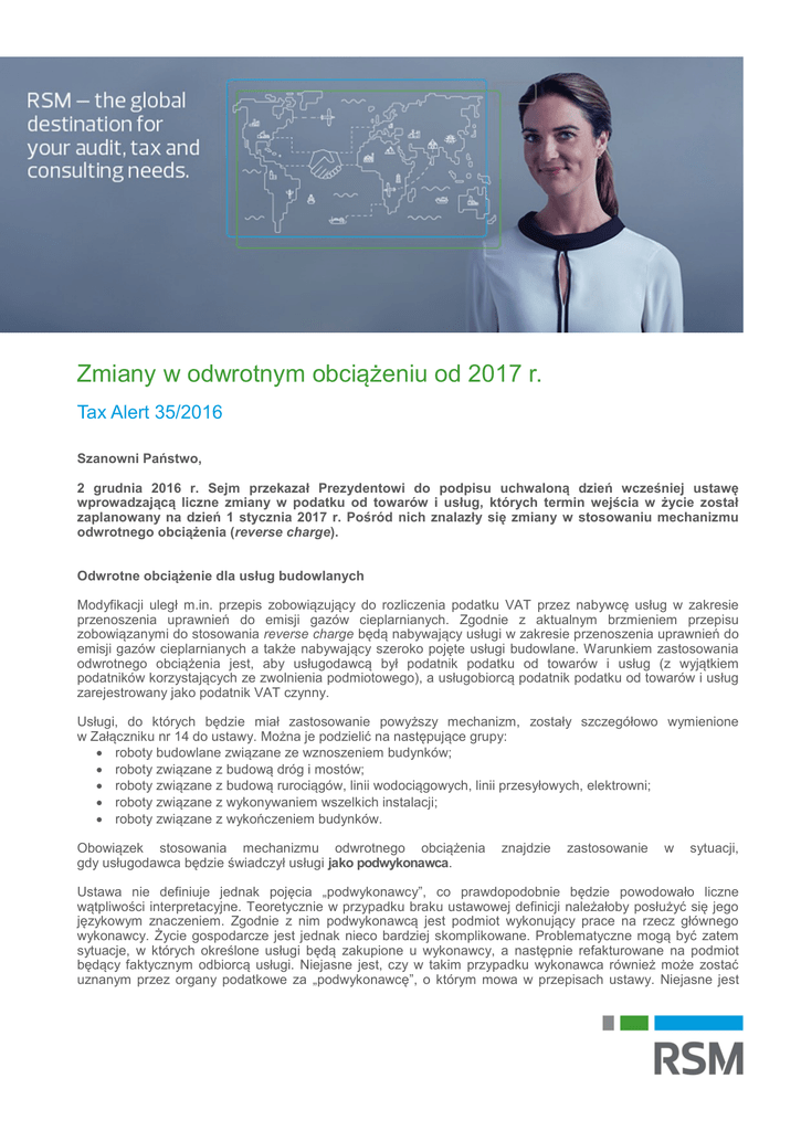 Zmiany w odwrotnym obciążeniu od 2017 r. Tax Alert 35/2016 Szanowni Państwo, 2 grudnia 2016 r. Sejm przekazał Prezydentowi do podpisu uchwaloną dzień wcześniej ustawę wprowadzającą liczne zmiany w podatku od towarów i usług, których termin wejścia w życie został zaplanowany na dzień 1 stycznia 2017 r. Pośród nich znalazły się zmiany w stosowaniu mechanizmu odwrotnego obciążenia (reverse charge). Odwrotne obciążenie dla usług budowlanych Modyfikacji uległ m.in. przepis zobowiązujący do rozliczenia podatku VAT przez nabywcę usług w zakresie przenoszenia uprawnień do emisji gazów cieplarnianych. Zgodnie z aktualnym brzmieniem przepisu zobowiązanymi do stosowania reverse charge będą nabywający usługi w zakresie przenoszenia uprawnień do emisji gazów cieplarnianych a także nabywający szeroko pojęte usługi budowlane. Warunkiem zastosowania odwrotnego obciążenia jest, aby usługodawcą był podatnik podatku od towarów i usług (z wyjątkiem podatników korzystających ze zwolnienia podmiotowego), a usługobiorcą podatnik podatku od towarów i usług zarejestrowany jako podatnik VAT czynny. Usługi, do których będzie miał zastosowanie powyższy mechanizm, zostały szczegółowo wymienione w Załączniku nr 14 do ustawy. Można je podzielić na następujące grupy: roboty budowlane związane ze wznoszeniem budynków; roboty związane z budową dróg i mostów; roboty związane z budową rurociągów, linii wodociągowych, linii przesyłowych, elektrowni; roboty związane z wykonywaniem wszelkich instalacji; roboty związane z wykończeniem budynków. Obowiązek stosowania mechanizmu odwrotnego obciążenia gdy usługodawca będzie świadczył usługi jako podwykonawca. znajdzie zastosowanie w sytuacji, Ustawa nie definiuje jednak pojęcia „podwykonawcy”, co prawdopodobnie będzie powodowało liczne wątpliwości interpretacyjne. Teoretycznie w przypadku braku ustawowej definicji należałoby posłużyć się jego językowym znaczeniem. Zgodnie z nim podwykonawcą jest podmiot wykonujący prace na rzecz głównego wykonawcy. Życie gospodarcze jest jednak nieco bardziej skomplikowane. Problematyczne mogą być zatem sytuacje, w których określone usługi będą zakupione u wykonawcy, a następnie refakturowane na podmiot będący faktycznym odbiorcą usługi. Niejasne jest, czy w takim przypadku wykonawca również może zostać uznanym przez organy podatkowe za „podwykonawcę”, o którym mowa w przepisach ustawy. Niejasne jest też, czy zmiana wpłynie na rozliczenia konsorcjów lub kosztów kwalifikowanych w zamówieniach publicznych. Przykładowe rozliczenie w przypadku świadczenia usług budowlanych przez podwykonawcę zawarliśmy na poniższym grafie. Nabywca biżuterii rozliczy VAT należny Wskutek uzupełnienia Załącznika nr 11 do ustawy mechanizmem odwrotnego obciążenia zostały objęte również towary takie jak: srebro, złoto (inne niż inwestycyjne), platyna (nieobrobiona plastycznie, w postaci półproduktu lub proszku), metale nieszlachetne, metale nieżelazne wraz z ich wyrobami oraz biżuteria. W rezultacie, jeśli dokonującym dostawy towarów wymienionych powyżej będzie podatnik podatku od towarów i usług (niepodlegający zwolnieniu podmiotowemu), natomiast nabywcą będzie podatnik zarejestrowany jako podatnik VAT czynny, a sama dostawa nie będzie podlegała zwolnieniu, zobowiązanym do rozliczenia podatku będzie nabywca. Dostawa procesorów z limitem Reverse charge zostanie także objęta dostawa procesorów wykonana w ramach jednolitej gospodarczo transakcji przekraczającej kwotę 20 000,00 zł. Za jednolitą gospodarczo transakcję uznaje się transakcję wykonaną w ramach jednej umowy, nawet jeżeli dokonana jest więcej niż jedna dostawa, na podstawie odrębnych zamówień dokumentowanych większą liczbą faktur. Podatnicy staną wobec obowiązku monitorowania wartości dostaw procesorów i zastosowania odwrotnego obciążenia w przypadku spełnienia warunków. RSM Poland jest członkiem RSM, 6. co do wielkości sieci niezależnych firm doradczych i audytorskich, która posiada ponad 760 biur w ponad 120 krajach i zatrudnia więcej niż 38.300 specjalistów na świecie. RSM Poland działa na polskim rynku już od 1991 r. Przez ten czas zyskaliśmy ogromną wiedzę i doświadczenie. Udało nam się także stworzyć unikatowy zespół najlepszych specjalistów. Naszą firmę tworzą nasi klienci, których potrzeby stawiamy na pierwszym miejscu, dlatego oferujemy im kompleksową obsługę dostosowaną indywidualnie do ich potrzeb. To nasi klienci decydują o wachlarzu naszych usług, a my dajemy im możliwość rozwoju i wzrostu na każdym etapie ich działalności. Z wieloletniego doświadczenia wiemy, że nasze podejście jest gwarancją obopólnego sukcesu. W razie jakichkolwiek pytań lub potrzeby omówienia tematu, gorąco zachęcamy do kontaktu: Piotr LISS Tax Partner Doradca podatkowy (10240) E: [email protected] M: +48 696 488 369 Dział Doradztwa Podatkowego RSM Poland RSM Poland Spółka Doradztwa Podatkowego S.A. Droga Dębińska 3b 61-555 Poznań T: +48 61 8515 766 F: +48 61 8515 786 www.rsmpoland.pl [email protected] RSM Poland BLOG Praktyczny przewodnik po podatkach i biznesie. Zapraszamy do lektury! Prosimy zwrócić uwagę, że zaprezentowany tekst nie powinien być rozumiany jako porada prawna, gdyż każdy indywidualny przypadek wymaga odrębnej, rzetelnej analizy. Z tego względu RSM Poland Spółka Doradztwa Podatkowego S.A. oraz RSM Poland Audyt S.A. nie ponoszą żadnej odpowiedzialności w związku z wykorzystaniem informacji, porad i wskazówek zamieszczonych w niniejszej publikacji. © RSM Poland, 2016 09.12.2016 THE POWER OF BEING UNDERSTOOD AUDIT | TAX | CONSULTING RSM Poland is a member of the RSM network and trades as RSM. RSM is the trading name used by the members of the RSM network. Each member of the RSM network is an independent accounting and consulting firm which prac