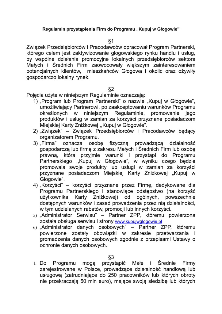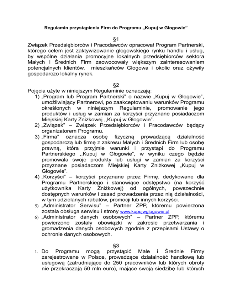 Regulamin przystąpienia Firm do Programu „Kupuj w Głogowie” §1 Związek Przedsiębiorców i Pracodawców opracował Program Partnerski, którego celem jest zaktywizowanie głogowskiego rynku handlu i usług, by wspólne działania promocyjne lokalnych przedsiębiorców sektora Małych i Średnich Firm zaowocowały większym zainteresowaniem potencjalnych klientów, mieszkańców Głogowa i okolic oraz ożywiły gospodarczo lokalny rynek. §2 Pojęcia użyte w niniejszym Regulaminie oznaczają: 1) „Program lub Program Partnerski” o nazwie „Kupuj w Głogowie”, umożliwiający Partnerowi, po zaakceptowaniu warunków Programu określonych w niniejszym Regulaminie, promowanie jego produktów i usług w zamian za korzyści przyznane posiadaczom Miejskiej Karty Zniżkowej ,,Kupuj w Głogowie”. 2) „Związek” – Związek Przedsiębiorców i Pracodawców będący organizatorem Programu. 3) „Firma” oznacza osobę fizyczną prowadzącą działalność gospodarczą lub firmę z zakresu Małych i Średnich Firm lub osobę prawną, która przyjmie warunki i przystąpi do Programu Partnerskiego ,,Kupuj w Głogowie”, w wyniku czego będzie promowala swoje produkty lub usługi w zamian za korzyści przyznane posiadaczom Miejskiej Karty Zniżkowej „Kupuj w Głogowie”. 4) „Korzyści” – korzyści przyznane przez Firmę, dedykowane dla Programu Partnerskiego i stanowiące odstępstwo (na korzyść użytkownika Karty Zniżkowej) od ogólnych, powszechnie dostępnych warunków i zasad prowadzenia przez nią działalności, w tym udzielanych rabatów, promocji lub innych korzyści. 5) „Administrator Serwisu” – Partner ZPP, któremu powierzona została obsługa serwisu i strony www.kupujwglogowie.pl 6) „Administrator danych osobowych” – Partner ZPP, któremu powierzone zostały obowiązki w zakresie przetwarzania i gromadzenia danych osobowych zgodnie z przepisami Ustawy o ochronie danych osobowych. §3 1. Do Programu mogą przystąpić Małe i Średnie Firmy zarejestrowane w Polsce, prowadzące działalność handlową lub usługową (zatrudniające do 250 pracowników lub których obroty nie przekraczają 50 mln euro), mające swoją siedzibę lub których miejsce prowadzonej działalności znajduje się na terenie Głogowa lub powiatu głogowskiego. 2. Z możliwości przystąpienia do Programu wyłączone są sklepy i markety wielkopowierzchniowe oraz dyskonty handlowe, a także firmy partnerów prowadzących działalność usługową lub handlową w ramach korporacji, które prowadzą własną politykę marketingową i których partner nie jest w stanie ustanowić własnych rabatów, promocji lub innych korzyści mogących być określonych Programem. 3. Przystąpienie do Programu przez Firmę następuje na podstawie zgłoszenia (pisemnej deklaracji) upoważnionego przedstawiciela Firmy, po akceptacji niniejszego Regulaminu. 4. Przystąpienie do programu jest bezpłatne do dn. 30.06.2014 r. 5. Dla Firm, które złożą deklarację przystąpienia do Programu w okresie od 01.07.2014 do 31.07.2014 r. pobierana będzie opłata wstępna w wysokości promocyjnej, tj. 50 zł. 6. Od dnia 01.08.2014 r. opłata za przystąpienie do Programu wynosić będzie 100 zł. 7. Z opłaty, o której mowa w ust. 5 i 6 zwolnione są Firmy będące członkami Związku Przedsiębiorców i Pracodawców. 8. Zmiana oferty rabatowej lub promocyjnej Firmy w Serwisie (na stronie www.kupujwglogowie.pl) zostanie wprowadzona przez jego Administratora w ciągu 48 godzin (licząc dni robocze) i jest bezpłatna, jeśli Firma dostarczy Administratorowi gotowe materiały. 9. Jeśli wprowadzenie zmiany wiąże się z przygotowaniem materiałów graficznych przez Administratora Serwisu, pobierana będzie opłata w wysokości od 20 zł do 70 zł, w zależności od stopnia skomplikowania i czasochłonności planowanej zmiany i będzie wyceniana indywidualnie przez Administratora Serwisu w porozumieniu z firmą zlecającą. 10. Zasady lub wysokość udzielonego rabatu, promocji lub innej korzyści określa Firma, przy czym oferta Firmy, która ma być dedykowana dla tego Programu ma stanowić odstępstwo na korzyść użytkowników Karty od ogólnych, powszechnie dostępnych warunków i zasad prowadzenia przez nią działalności, w tym udzielania rabatów, promocji lub innych korzyści. §4 1. Firma przystępująca do Programu jest zobowiązana do: 1) przeszkolenia personelu w zakresie znajomości i zasad Programu oraz profesjonalnej obsługi klienta w tym zakresie. 2) udzielania obowiązkowego (przynajmniej jednego obowiązującego w danym czasie) rabatu, promocji, gratisu lub innej korzyści klientom - posiadaczom Karty, zgodnie z własnymi założeniami, które odpowiadają informacji podanej przez Firmę na stronie www.kupujwglogowie.pl . 3) obowiązkowego oznakowania lokalu, w którym prowadzona jest działalność, naklejką z logo Programu. 4) W przypadku posiadania strony internetowej, umieszczenia logo Programu wraz z przekierowaniem na www.kupujwglogowie.pl . 2. Nieprzestrzeganie powyższych zasad Programu skutkuje wykluczeniem z Programu. 1. Aktualny 2. 3. 4. 5. 6. 7. 8. §5 Programu Regulamin znajduje się na stronie www.kupujwglogowie.pl . ZPP zastrzega sobie prawo do zamknięcia Programu w całości, a Firmom nie przysługują z tego tytułu żadne roszczenia wobec ZPP. W przypadku zamknięcia Programu, na stronie www.kupujwglogowie.pl oraz w miejscu dystrybucji Kart podana zostanie informacja z 30 - dniowym wyprzedzeniem. ZPP zastrzega możliwość dokonywania zmian w niniejszym Regulaminie. Wszelkie zmiany w Regulaminie obowiązują od momentu wskazanego w nowym Regulaminie, zamieszczanym każdorazowo na stronie www.kupujwglogowie.pl . Firma zobowiązuje się do przestrzegania przepisów prawa mających zastosowanie do wszelkich czynności Firmy związanych z jej udziałem w Programie. ZPP zastrzega sobie prawo zablokowania udziału Firmy w Programie, jeśli Firma nie będzie przestrze