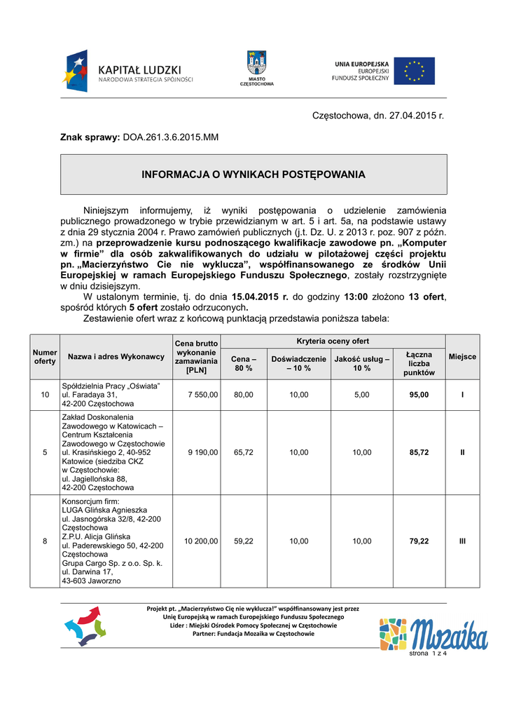 Częstochowa, dn. 27.04.2015 r. Znak sprawy: DOA.261.3.6.2015.MM INFORMACJA O WYNIKACH POSTĘPOWANIA Niniejszym informujemy, iż wyniki postępowania o udzielenie zamówienia publicznego prowadzonego w trybie przewidzianym w art. 5 i art. 5a, na podstawie ustawy z dnia 29 stycznia 2004 r. Prawo zamówień publicznych (j.t. Dz. U. z 2013 r. poz. 907 z późn. zm.) na przeprowadzenie kursu podnoszącego kwalifikacje zawodowe pn. „Komputer w firmie” dla osób zakwalifikowanych do udziału w pilotażowej części projektu pn. „Macierzyństwo Cie nie wyklucza”, współfinansowanego ze środków Unii Europejskiej w ramach Europejskiego Funduszu Społecznego, zostały rozstrzygnięte w dniu dzisiejszym. W ustalonym terminie, tj. do dnia 15.04.2015 r. do godziny 13:00 złożono 13 ofert, spośród których 5 ofert zostało odrzuconych. Zestawienie ofert wraz z końcową punktacją przedstawia poniższa tabela: Numer oferty Nazwa i adres Wykonawcy Cena brutto wykonanie zamawiania [PLN] Kryteria oceny ofert Cena – 80 % Doświadczenie – 10 % Jakość usług – 10 % Łączna liczba punktów Miejsce 10 Spółdzielnia Pracy „Oświata” ul. Faradaya 31, 42-200 Częstochowa 7 550,00 80,00 10,00 5,00 95,00 I 5 Zakład Doskonalenia Zawodowego w Katowicach – Centrum Kształcenia Zawodowego w Częstochowie ul. Krasińskiego 2, 40-952 Katowice (siedziba CKZ w Częstochowie: ul. Jagiellońska 88, 42-200 Częstochowa 9 190,00 65,72 10,00 10,00 85,72 II 8 Konsorcjum firm: LUGA Glińska Agnieszka ul. Jasnogórska 32/8, 42-200 Częstochowa Z.P.U. Alicja Glińska ul. Paderewskiego 50, 42-200 Częstochowa Grupa Cargo Sp. z o.o. Sp. k. ul. Darwina 17, 43-603 Jaworzno 10 200,00 59,22 10,00 10,00 79,22 III Projekt pt. „Macierzyństwo Cię nie wyklucza!” współfinansowany jest przez Unię Europejską w ramach Europejskiego Funduszu Społecznego Lider : Miejski Ośrodek Pomocy Społecznej w Częstochowie Partner: Fundacja Mozaika w Częstochowie strona 1 z 4 Numer oferty Nazwa i adres Wykonawcy Cena brutto wykonanie zamawiania [PLN] Kryteria oceny ofert Cena – 80 % Doświadczenie – 10 % Jakość usług – 10 % Łączna liczba punktów Miejsce 13 Wyższa Szkoła Zarządzania w Częstochowie ul. 1 Maja 40, 42-200 Częstochowa 8 174,90 73,88 0,00 3,00 76,88 IV 2 AUO OSK „OLIMP” s.c. Al. Armii Krajowej 22 A, 97-300 Piotrków Trybunalski 10 820,00 55,82 10,00 10,00 75,82 V 11 Ośrodek Szkolenia Dokształcania i Doskonalenia Kadr KURSOR Piotr Wasak ul. Partyzantów 9, 22-400 Zamość 12 228,00 49,39 10,00 10,00 69,39 VI 6 Fabryka Specjalistów ul. Okrężna 14, 42-280 Częstochowa 10 444,30 57,83 7,00 3,00 67,83 VII 7 Wielkopolska Akademia Nauki i Rozwoju Jakub Michałowski ul. Przełęcz 51, 60-115 Poznań 13 320,00 45,35 10,00 10,00 65,35 VIII 1 3 Collegium Medyczne Medica s.c. Anna Wasiłek, Grzegorz Wasiłek Akademia Kształcenie Kadr „Medica” ul. Mieszka I 4, 73-110 Stargard Szczeciński Oferta odrzucona Uzasadnienie: Oferta została odrzucona ze względu na wykluczenie Wykonawcy z udziału w postępowaniu o udzielenie zamówienia na podstawie art. 24 ust. 2 pkt 4 ustawy Prawo zamówień publicznych – 10 340,00 Wykonawca nie wykazał spełnienia warunków udziału w postępowaniu w zakresie dysponowania potencjałem technicznym niezbędnym do wykonania zamówienia – nieuzupełnienie oryginału zobowiązania podmiotu oddającego do dyspozycji Wykonawcy lokal do przeprowadzenia zajęć. Centrum Biznesu i Promocji Kadr Sp. z o.o. Os. Słoneczne 14, 24-400 Ostrowiec Świętokrzyski Oferta odrzucona Uzasadnienie: Oferta została odrzucona ze względu na wykluczenie Wykonawcy z udziału w postępowaniu o udzielenie zamówienia na podstawie art. 24 ust. 2 pkt 4 ustawy Prawo zamówień publicznych – 9 595,00 Wykonawca nie wykazał spełnienia warunków udziału w postępowaniu w zakresie dysponowania potencjałem technicznym niezbędnym do wykonania zamówienia – nieuzupełnienie oryginału zobowiązania podmiotu oddającego do dyspozycji Wykonawcy lokal do przeprowadzenia zajęć. Projekt pt. „Macierzyństwo Cię nie wyklucza!” współfinansowany jest przez Unię Europejską w ramach Europejskiego Funduszu Społecznego Lider : Miejski Ośrodek Pomocy Społecznej w Częstochowie Partner: Fundacja Mozaika w Częstochowie strona 2 z 4 Numer oferty 4 Nazwa i adres Wykonawcy Centrum Kształcenia Zawodowego i Języków Obcych PRO EUROPA Stanisław Fijałkowski ul. Szeroka 7/11 a lok. 17, 97-200 Tomaszów Mazowiecki Cena brutto wykonanie zamawiania [PLN] Kryteria oceny ofert Cena – 80 % Doświadczenie – 10 % Jakość usług – 10 % Łączna liczba punktów Miejsce Oferta odrzucona Uzasadnienie: Oferta została odrzucona ze względu na wykluczenie Wykonawcy z udziału w postępowaniu o udzielenie zamówienia na podstawie art. 24 ust. 2 pkt 4 ustawy Prawo zamówień publicznych – 19 800,00 Wykonawca nie wykazał spełnienia warunków udziału w postępowaniu w zakresie dysponowania potencjałem technicznym niezbędnym do wykonania zamówienia – nieuzupełnienie oryginału zobowiązania podmiotu oddającego do dyspozycji Wykonawcy lokal do przeprowadzenia zajęć. Oferta odrzucona Uzasadnienie: 9 12 Bacom Bartosz Wesołowski ul. Kołłątaja 6 A, 41-200 Sosnowiec Niepubliczna Placówka Kształcenia Ustawicznego Krzysztof Mirski Doradztwo Prawne i Szkolenia EkoKonsult ul. Wodna 17 lok. 2.5, 30556 Kraków Oferta została odrzucona na podstawie art. 89 ust. 1 pkt 2 ustawy Prawo zamówień publicznych ze względu na niezgodność z treścią ogłoszenia o zamówieniu. 16 039,20 Zamawiający wymagał, aby posiłki były podawane w miejscu szkolenia, ale w osobnym odpowiednio przygotowanym do tego celu pomieszczeniu (roz. I ust. 9 pkt 3 ogłoszenia o zamówieniu). Wykazany przez Wykonawcę lokal nie spełnia powyższego wymogu, co powoduje niezgodność oferty z treścią ogłoszenia o zamówieniu i skutkuje jej oferty. Oferta odrzucona Uzasadnienie: Oferta została odrzucona ze względu