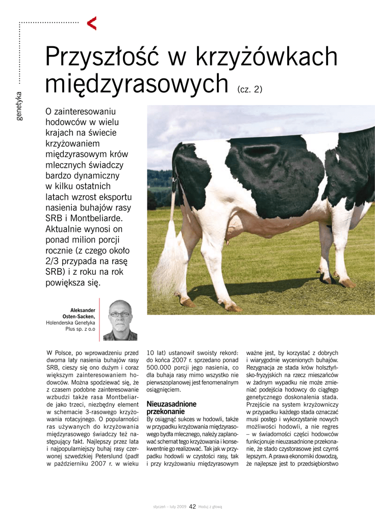 genetyka .......................... .......................... Przyszłość w krzyżówkach międzyrasowych (cz. 2) O zainteresowaniu hodowców w wielu krajach na świecie krzyżowaniem międzyrasowym krów mlecznych świadczy bardzo dynamiczny w kilku ostatnich latach wzrost eksportu nasienia buhajów rasy SRB i Montbeliarde. Aktualnie wynosi on ponad milion porcji rocznie (z czego około 2/3 przypada na rasę SRB) i z roku na rok powiększa się. Aleksander Osten-Sacken, Holenderska Genetyka Plus sp. z o.o W Polsce, po wprowadzeniu przed dwoma laty nasienia buhajów rasy SRB, cieszy się ono dużym i coraz większym zainteresowaniem hodowców. Można spodziewać się, że z czasem podobne zainteresowanie wzbudzi także rasa Montbeliarde jako trzeci, niezbędny element w schemacie 3-rasowego krzyżowania rotacyjnego. O popularności ras używanych do krzyżowania międzyrasowego świadczy też następujący fakt. Najlepszy przez lata i najpopularniejszy buhaj rasy czerwonej szwedzkiej Peterslund (padł w październiku 2007 r. w wieku 10 lat) ustanowił swoisty rekord: do końca 2007 r. sprzedano ponad 500.000 porcji jego nasienia, co dla buhaja rasy mimo wszystko nie pierwszoplanowej jest fenomenalnym osiągnięciem. Nieuzasadnione przekonanie By osiągnąć sukces w hodowli, także w przypadku krzyżowania międzyrasowego bydła mlecznego, należy zaplanować schemat tego krzyżowania i konsekwentnie go realizować. Tak jak w przypadku hodowli w czystości rasy, tak i przy krzyżowaniu międzyrasowym styczeń – luty 2009 42 Hoduj z głową ważne jest, by korzystać z dobrych i wiarygodnie wycenionych buhajów. Rezygnacja ze stada krów holsztyńsko-fryzyjskich na rzecz mieszańców w żadnym wypadku nie może zmieniać podejścia hodowcy do ciągłego genetycznego doskonalenia stada. Przejście na system krzyżowniczy w przypadku każdego stada oznaczać musi postęp i wykorzystanie nowych możliwości hodowli, a nie regres – w świadomości części hodowców funkcjonuje nieuzasadnione przekonanie, że stado czystorasowe jest czymś lepszym. A prawa ekonomiki dowodzą, że najlepsze jest to przedsiębiorstwo (w tym przypadku rolne), które przynosi największy zysk. Jeśli więc wprowadzenie nowych technologii i rozwiązań pozwala ten zysk zwiększyć – należy z nich skorzystać. Trzy kolory kolczyków Jeśli chodzi o organizację krycia w stadzie zwierząt krzyżówkowych, to jest ona bardzo prosta. Zwierzęta każdego z poziomów kojarzeń W krzyżówce trójrasowej (Hf x SRB) x Mo lub (Hf x Mo) x SRB możemy otrzymać krowy czarnolub czerwono-białe. .......................... .......................... genetyka r e k l a m a styczeń – luty 2009 43 Hoduj z głową genetyka .......................... .......................... oznacza się dodatkowymi, kolorowymi kolczykami – np. krowy Hf niebieskimi, krowy z pokolenia F1 (Hf x SRB) czerwonymi, a krowy z pokolenia F2 (Hf x SRB x Mo) żółtymi. Wiemy wówczas, że wszystkie zwierzęta oznaczone niebieskimi kolczykami (tj. po ojcu rasy Hf) kryjemy nasieniem buhajów rasy SRB, zwierzęta oznaczone czerwonymi kolczykami (tj. po ojcu rasy SRB) kryjemy nasieniem buhajów rasy Montbeliarde, a zwierzęta oznaczone żółtymi kolczykami (tj. po ojcu rasy Mo) kryjemy nasieniem buhajów holsztyńsko-fryzyjskich. Podobnie postępujemy w kolejnych pokoleniach, znacząc urodzone jałówki jednym z trzech kolorów kolczyka w zależności od tego, jakiej rasy był ojciec. Przedstawiony schemat dotyczy rotacji z użyciem trzech ras; w przypadku dwóch ras postępujemy analogicznie, używając do znaczenia zwierząt dwa kolory kolczyków. Wykorzystanie prostego systemu znakowania eliminuje konieczność prowadzenia doboru buhajów dla każdej krowy w stadzie, likwiduje też zagrożenia płynące ze wzrostu inbredu i możliwości popełnienia pomyłki w doborze buhaja odpowiedniej rasy dla każdej krytej sztuki. wyjaśnienie, że pierwsze pokolenie (F1) nie może być wpisane do ksiąg zwierząt hodowlanych – warunkiem wpisu jest posiadanie przez zwierzę minimum 75% krwi jednej z ras wyjściowych. Jest to możliwe już w drugim pokoleniu i w następnych w przypadku krzyżowania wypierającego; przyjęcie trójrasowego schematu krzyżowania rotacyjnego takiej możliwości nie daje. Trzeba jednak jasno powiedzieć, że wpis do ksiąg nie może być w żadnym przypadku celem samym w sobie – celem prowadzenia produkcji mleka, tak jak każdej innej działalności gospodarczej, jest zysk. A wzrostowi tego zysku niewątpliwie sprzyja obniżenie kosztów produkcji, co jest możliwe dzięki krzyżowaniu międzyrasowemu z buhajami wybranych, dobrych i sprawdzonych w praktyce ras. Jeśli chodzi o rejestrację pochodzenia zwierząt krzyżówkowych, to w odniesieniu do buhajów zarejestrowanych w systemie Symlek jest to obowiązek organizacji prowadzącej indywidualną ocenę mleczności. I nie ma to nic wspólnego z wpisem krów do ksiąg zwierząt hodowlanych – są to dwie zupełnie odrębne sprawy. Rolnikom decydującym się na użycie do krzyżowania w swoim stadzie krów holsztyńsko-fryzyjskich nasienia buhajów innych ras należy się Hodowcy, którzy korzystają z indywidualnej oceny mleczności krów, mogą spotkać się z niczym nieuzasadnionym twierdzeniem, że krzyżo- O wpisach do ksiąg Krzyżówki też pod oceną mleczności wanie międzyrasowe powinno być stosowane w stadach użytkowych, natomiast stada oceniane muszą utrzymywać zwierzęta czystorasowe. Trudno zrozumieć takie twierdzenie – może ono wynikać z przekonania wygłaszających je osób, że najważniejsza jest realizacja programów hodowlanych, a bezpośredni interes ekonomiczny rolnika jest zdecydowanie mniej ważny. Trudno się z tym zgodzić – to rolnik i jego stado są podmiotem w sprawie i nic nie może odbywać się jego kosztem. Każdy ma prawo podjąć samodzielną, optymalną dla siebie decyzję hodowlaną i nic nie stoi na przeszkodzie, by w stad