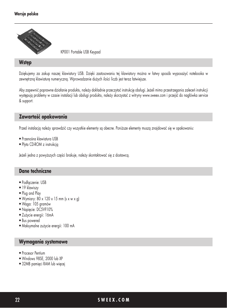 Wersja polska KP001 Portable USB Keypad Wstęp Dziękujemy za zakup naszej klawiatury USB. Dzięki zastosowaniu tej klawiatury można w łatwy sposób wyposażyć notebooka w zewnętrzną klawiaturę numeryczną. Wprowadzanie dużych ilości liczb jest teraz łatwiejsze. Aby zapewnić poprawne działanie produktu, należy dokładnie przeczytać instrukcję obsługi. Jeżeli mimo przestrzegania zaleceń instrukcji występują problemy w czasie instalacji lub obsługi produktu, należy skorzystać z witryny www.sweex.com i przejść do nagłówka service & support. Zawartość opakowania Przed instalacją należy sprawdzić czy wszystkie elementy są obecne. Poniższe elementy muszą znajdować się w opakowaniu: • Przenośna klawiatura USB • Płyta CD-ROM z instrukcją Jeżeli jedna z powyższych części brakuje, należy skontaktować się z dostawcą. Dane techniczne • Podłączenie: USB • 19 klawiszy • Plug and Play • Wymiary: 80 x 120 x 15 mm (s x w x g) • Waga: 105 gramów • Napięcie: DC5V?10% • Zużycie energii: 16mA • Bus powered • Maksymalne zużycie energii: 100 mA Wymagania systemowe • Procesor Pentium • Windows 98SE, 2000 lub XP • 32MB pamięci RAM lub więcej 22 SWEEX.COM Wersja polska Instalacja urządzenia Rozwój sprzętu komputerowego jest bardzo szybki. Należy upewnić się, że system operacyjny został zaktualizowany przed rozpoczęciem instalacji. Aktualizację można wykonać w łatwy sposób przez uruchomienie przeglądarki Internet Explorer i wybranie opcji Windows Update w menu Extra. Windows 98SE Podłączyć wtyczkę USB do wolnego portu USB. Windows informuje o wykryciu nowego sprzętu. Istnieje możliwość, że komputer poprosi o użycie płyty Windows 98SE CD-ROM. W takim przypadku należy włożyć płytę Windows 98SE CD-ROM do napędu CD-ROM. System Windows skopiuje kilka plików z płyty CD-ROM i wyświetli komunikat informujący o zakończeniu instalacji. Windows 2000 i XP Podłączyć wtyczkę USB do wolnego portu USB. Windows informuje o wykryciu nowego sprzętu. Urządzenie jest instalowane automatycznie. Obsługa klawiatury Naciśnij klawisz “Num Lock” jeden raz, aby włączyć klawiaturę. Zielona dioda LED zapala się i klawiatura numeryczna jest gotowa do użycia. Po kolejnym naciśnięciu klawisza “Num Lock” zielona dioda gaśnie i klawiatura numeryczna jest wyłączona. W tym momencie strzałki i klawisze Page Up (PgUp), Page Down (PgDn), Home, Insert (Ins) i Delete (Del) mogą być używane. Pozostałe klawisze, Backspace (BS) i Enter można używać przez cały czas. Gwarancja Wszystkie produkty opatrzone marką Sweex posiadają 3 lata gwarancji. Tylko cyfrowe aparaty fotograficzne i kamery posiadają 2 lata gwarancji. Nie udzielamy gwarancji na dostarczone oprogramowanie lub baterie (akumulatory). Z usług gwarancyjnych można skorzystać za pośrednictwem sprzedawcy, u którego został zakupiony produkt. 23