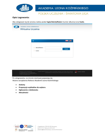 Opis Logowania: Aby zalogować się do serwisu należy podać login/identyfikator (numer albumu) oraz hasło. Po zalogowaniu, na stronie startowej pojawiają się: Ważne zarządzenia Rektora Akademii Leona Koźmińskiego Ankiety Propozycje wykładów do wyboru Ogłoszenia z dziekanatu Aktualności Opis wybranych funkcji menu: Aktualny status i informacje o praktykach studenckich Formularz zgłoszeniowy i informacje dotyczące Wymiany Międzynarodowej Lista wybranych przedmiotów i ich wartości w punktach ECTS Lista materiałów do zajęć, zamieszczonych przez wykładowców do pobrania przez studentów System umożliwiający zapisy na przedmioty do wyboru Powrót do ogłoszeń na stronie głównej System płatności elektronicznych Kod autoryzacyjny wykorzystywany jako potwierdzenie tożsamości użytkownika podczas rozmowy telefonicznej Możliwość wyszukania wykładowcy, jego adresu email, planu zajęć oraz dyżuru Wylogowanie z serwisu Wirtualnej Uczelni Twoje studia: Dane studenta Aktualny tok studiów Przebieg studiów – informacja o poprzednich semestrach i przeniesieniach od momentu rozpoczęcia studiów na Uczelni Oceny – możliwość przeglądnięcia ocen z aktualnego oraz poprzednich semestrów Prowadzący – informacje o prowadzącym dany przedmiot i dyżurach danego prowadzącego Plan studiów – informacje o przedmiotach, formie zajęć i zaliczenia oraz ilości godzin. Plan zajęć Moduły i grupy zajęciowych – informacje o grupach Stypendia – przyznane stypendia na uczelni Decyzje – decyzje z dziekanatu Twoje dane finansowe: Dane Finansowe – ogólne dane, numer NIP, nazwa Banku itp. Stan Rozliczeń – rodzaje opłat, data wpłaty, zaległe wpłaty Dyplom: Praca dyplomowa informacje - dane dotyczące pracy dyplomowej Wybór Promotora – możliwość wyboru promotora. Opcja staje się aktywna w przypadku, kiedy jesteśmy na odpowiednim semestrze i np. od średniej za dotychczasowy przebieg studiów – w przypadku uaktywnienia opcji przez uczelnię osoby z większa średnia będą miały pierwszeństwo W razie dodatkowych pytań bądź wątpliwości prosimy o kontakt: Dział Obsługi Klienta & Wdrażania Innowacyjnych Rozwiązań Zaprasza do pokoju A115 w godzinach: Poniedziałek Wtorek Środa Czwartek Piątek Sobota Niedziela email: [email protected] tel: +48 22 519 21 45 8:00 - 18:00 8:00 - 18:00 8:00 - 18:00 8:00 - 19:00 8:00 - 19:00 8:00 - 16:00 8:00 - 16:00