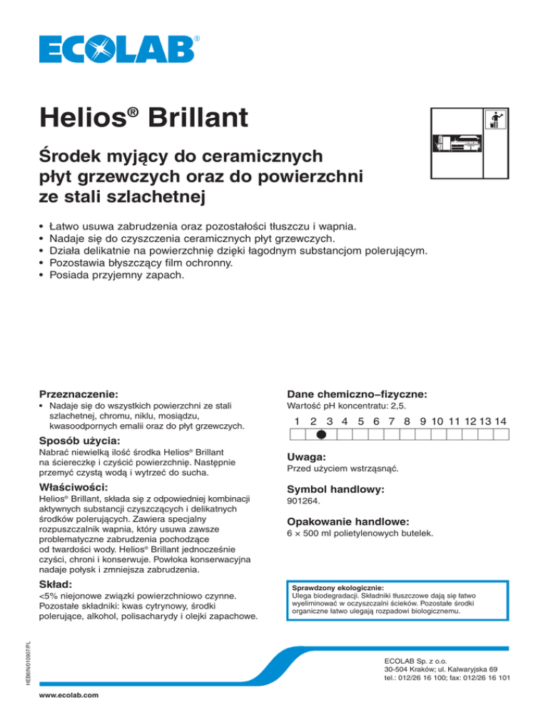 Helios® Brillant Środek myjący do ceramicznych płyt grzewczych oraz do powierzchni ze stali szlachetnej • • • • • Łatwo usuwa zabrudzenia oraz pozostałości tłuszczu i wapnia. Nadaje się do czyszczenia ceramicznych płyt grzewczych. Działa delikatnie na powierzchnię dzięki łagodnym substancjom polerującym. Pozostawia błyszczący film ochronny. Posiada przyjemny zapach. Przeznaczenie: Dane chemiczno−fizyczne: • Nadaje się do wszystkich powierzchni ze stali szlachetnej, chromu, niklu, mosiądzu, kwasoodpornych emalii oraz do płyt grzewczych. Wartość pH koncentratu: 2,5. 1 2 3 4 5 6 7 8 9 10 11 12 13 14 Sposób użycia: Nabrać niewielką ilość środka Helios® Brillant na ściereczkę i czyścić powierzchnię. Następnie przemyć czystą wodą i wytrzeć do sucha. Uwaga: Właściwości: Symbol handlowy: Helios® Brillant, składa się z odpowiedniej kombinacji aktywnych substancji czyszczących i delikatnych środków polerujących. Zawiera specjalny rozpuszczalnik wapnia, który usuwa zawsze problematyczne zabrudzenia pochodzące od twardości wody. Helios® Brillant jednocześnie czyści, chroni i konserwuje. Powłoka konserwacyjna nadaje połysk i zmniejsza zabrudzenia. 901264. Skład: HEB6IN/010907/PL <5% niejonowe związki powierzchniowo czynne. Pozostałe składniki: kwas cytrynowy, środki polerujące, alkohol, polisacharydy i olejki zapachowe. Przed użyciem wstrząsnąć. Opakowanie handlowe: 6 × 500 ml polietylenowych butelek. Sprawdzony ekologicznie: Ulega biodegradacji. Składniki tłuszczowe dają się łatwo wyeliminować w oczyszczalni ścieków. Pozostałe środki organiczne łatwo ulegają rozpadowi biologicznemu. ECOLAB Sp. z o.o. 30-504 Kraków; ul. Kalwaryjska 69 tel.: 012/26 16 100; fax: 012/26 16 101 www.ecolab.com