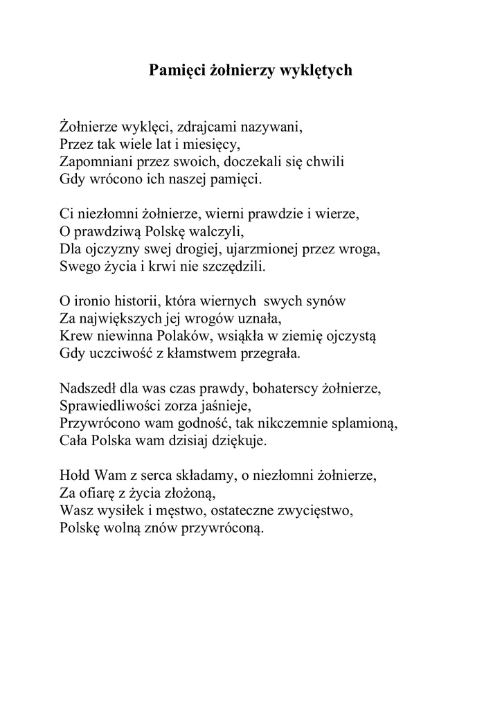 Pamięci żołnierzy wyklętych Żołnierze wyklęci, zdrajcami nazywani, Przez tak wiele lat i miesięcy, Zapomniani przez swoich, doczekali się chwili Gdy wrócono ich naszej pamięci. Ci niezłomni żołnierze, wierni prawdzie i wierze, O prawdziwą Polskę walczyli, Dla ojczyzny swej drogiej, ujarzmionej przez wroga, Swego życia i krwi nie szczędzili. O ironio historii, która wiernych swych synów Za największych jej wrogów uznała, Krew niewinna Polaków, wsiąkła w ziemię ojczystą Gdy uczciwość z kłamstwem przegrała. Nadszedł dla was czas prawdy, bohaterscy żołnierze, Sprawiedliwości zorza jaśnieje, Przywrócono wam godność, tak nikczemnie splamioną, Cała Polska wam dzisiaj dziękuje. Hołd Wam z serca składamy, o niezłomni żołnierze, Za ofiarę z życia złożoną, Wasz wysiłek i męstwo, ostateczne zwycięstwo, Polskę wolną znów przywróconą.