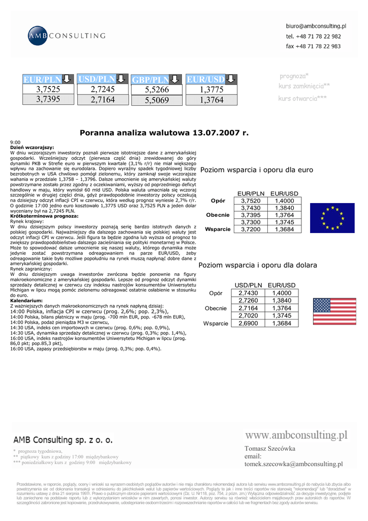 EUR/PLN 3,7525 3,7395 USD/PLN 2,7245 2,7164 GBP/PLN 5,5266 5,5069 prognoza* EUR/USD 1,3775 1,3764 kurs zamknięcia** kurs otwarcia*** Poranna analiza walutowa 13.07.2007 r. 9:00 Dzień wczorajszy: W dniu wczorajszym inwestorzy poznali pierwsze istotniejsze dane z amerykańskiej gospodarki. Wcześniejszy odczyt (pierwsza część dnia) zrewidowanej do góry dynamiki PKB w Strefie euro w pierwszym kwartale (3,1% r/r) nie miał większego wpływu na zachowanie się eurodolara. Dopiero wyraźny spadek tygodniowej liczby bezrobotnych w USA chwilowo pomógł zielonemu, który zamknął swoje wczorajsze wahania w przedziale 1,3758 – 1,3796. Dalsze umocnienie się amerykańskiej waluty powstrzymane zostało przez zgodny z oczekiwaniami, wyższy od poprzedniego deficyt handlowy w maju, który wyniósł 60 mld USD. Polska waluta umacniała się wczoraj szczególnie w drugiej części dnia, gdyż prawdopodobnie inwestorzy polscy oczekują na dzisiejszy odczyt inflacji CPI w czerwcu, która według prognoz wyniesie 2,7% r/r. O godzinie 17:00 jedno euro kosztowało 1,3775 USD oraz 3,7525 PLN a jeden dolar wyceniany był na 2,7245 PLN. Krótkoterminowa prognoza: Rynek krajowy: W dniu dzisiejszym polscy inwestorzy poznają serię bardzo istotnych danych z polskiej gospodarki. Najważniejszy dla dalszego zachowania się polskiej waluty jest odczyt inflacji CPI w czerwcu. Jeśli figura ta będzie zgodna lub wyższa od prognoz to zwiększy prawdopodobieństwo dalszego zacieśniania się polityki monetarnej w Polsce. Może to spowodować dalsze umocnienie się naszej waluty, którego dynamika może jedynie zostać powstrzymana odreagowaniem na parze EUR/USD, żeby odreagowanie takie było możliwe popołudniu na rynek muszą napłynąć dobre dane z amerykańskiej gospodarki. Rynek zagraniczny: W dniu dzisiejszym uwaga inwestorów zwrócona będzie ponownie na figury makroekonomiczne z amerykańskiej gospodarki. Lepsze od prognoz odczyt dynamiki sprzedaży detalicznej w czerwcu czy indeksu nastrojów konsumentów Uniwersytetu Michigan w lipcu mogą pomóc zielonemu odreagować ostatnie osłabienie w stosunku do euro. Kalendarium: Z ważniejszych danych makroekonomicznych na rynek napłyną dzisiaj: 14:00 Polska, inflacja CPI w czerwcu (prog. 2,6%; pop. 2,3%), 14:00 Polska, bilans płatniczy w maju (prog. -700 mln EUR, pop. -678 mln EUR), 14:00 Polska, podaż pieniądza M3 w czerwcu, 14:30 USA, indeks cen importowych w czerwcu (prog. 0,6%; pop. 0,9%), 14:30 USA, dynamika sprzedaży detalicznej w czerwcu (prog. 0,3%; pop. 1,4%), 16:00 USA, indeks nastrojów konsumentów Uniwersytetu Michigan w lipcu (prog. 86,0 pkt; pop.85,3 pkt), 16:00 USA, zapasy przedsiębiorstw w maju (prog. 0,3%; pop. 0,4%). * prognoza tygodniowa, ** piątkowy kurs z godziny 17:00 międzybankowy *** poniedziałkowy kurs z godziny 9:00 międzybankowy Poziom wsparcia i oporu dla euro Opór Obecnie Wsparcie EUR/PLN 3,7520 3,7430 3,7395 3,7300 3,7200 EUR/USD 1,4000 1,3840 1,3764 1,3745 1,3684 Poziom wsparcia i oporu dla dolara Opór Obecnie Wsparcie USD/PLN EUR/USD 2,7430 1,4000 2,7260 1,3840 2,7164 1,3764 2,7020 1,3745 2,6900 1,3684 Tomasz Szecówka email: [email protected] Przedstawione, w raporcie, poglądy, oceny i wnioski sa wyrazem osobistych poglądów autorów i nie maja charakteru rekomendacji autora lub serwisu www.ambconsulting.pl do nabycia lub zbycia albo powstrzymania sie od dokonania transakcji w odniesieniu do jakichkolwiek walut lub papierów wartościowych. Poglądy te jak i inne treści raportów nie stanowią "rekomendacji" lub "doradztwa" w rozumieniu ustawy z dnia 21 sierpnia 1997r. Prawo o publicznym obrocie papierami wartościowymi (Dz. U. Nr118, poz. 754, z pózn. zm.) Wyłączna odpowiedzialność za decyzje inwestycyjne, podjęte lub zaniechane na podstawie raportu lub z wykorzystaniem wniosków w nim zawartych, ponosi inwestor. Autorzy serwisu sa również wa ł ścicielem majątkowych praw autorskich do raportów. W szczególności zabronione jest kopiowanie, przedrukowywanie, udostępnianie osobom trzecim i rozpowszechnianie raportów w całości lub we fragmentach bez zgody autorów serwisu.