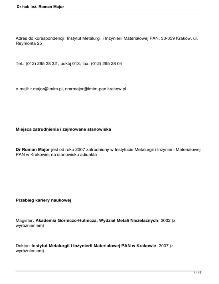 Dr hab inż. Roman Major - Instytut Metalurgii i Inżynierii