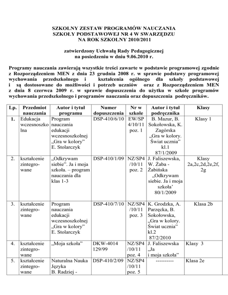 SZKOLNY ZESTAW PROGRAMÓW NAUCZANIA