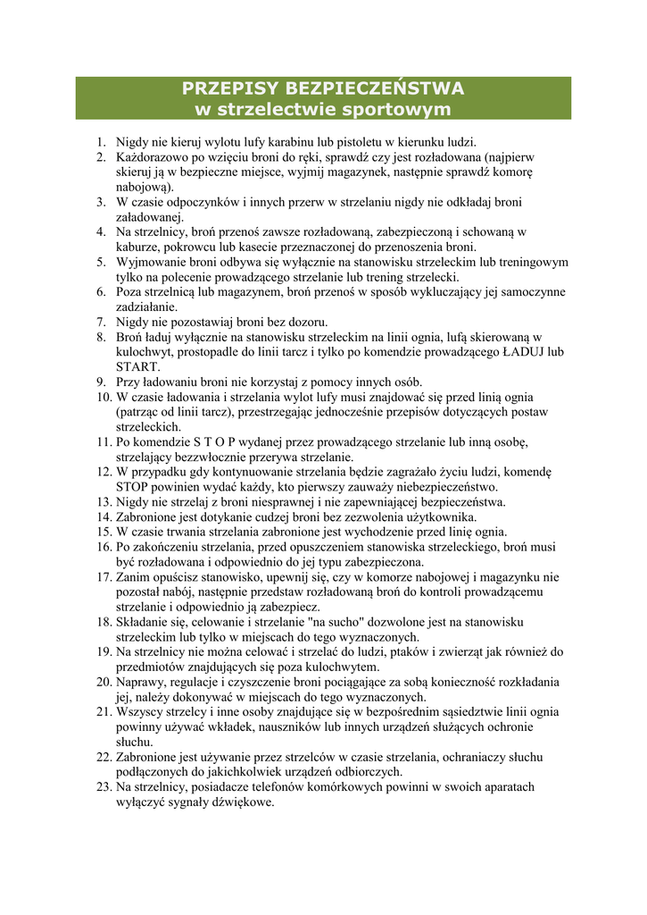 PRZEPISY BEZPIECZEŃSTWA w strzelectwie sportowym 1. Nigdy nie kieruj wylotu lufy karabinu lub pistoletu w kierunku ludzi. 2. Każdorazowo po wzięciu broni do ręki, sprawdź czy jest rozładowana (najpierw skieruj ją w bezpieczne miejsce, wyjmij magazynek, następnie sprawdź komorę nabojową). 3. W czasie odpoczynków i innych przerw w strzelaniu nigdy nie odkładaj broni załadowanej. 4. Na strzelnicy, broń przenoś zawsze rozładowaną, zabezpieczoną i schowaną w kaburze, pokrowcu lub kasecie przeznaczonej do przenoszenia broni. 5. Wyjmowanie broni odbywa się wyłącznie na stanowisku strzeleckim lub treningowym tylko na polecenie prowadzącego strzelanie lub trening strzelecki. 6. Poza strzelnicą lub magazynem, broń przenoś w sposób wykluczający jej samoczynne zadziałanie. 7. Nigdy nie pozostawiaj broni bez dozoru. 8. Broń ładuj wyłącznie na stanowisku strzeleckim na linii ognia, lufą skierowaną w kulochwyt, prostopadle do linii tarcz i tylko po komendzie prowadzącego ŁADUJ lub START. 9. Przy ładowaniu broni nie korzystaj z pomocy innych osób. 10. W czasie ładowania i strzelania wylot lufy musi znajdować się przed linią ognia (patrząc od linii tarcz), przestrzegając jednocześnie przepisów dotyczących postaw strzeleckich. 11. Po komendzie S T O P wydanej przez prowadzącego strzelanie lub inną osobę, strzelający bezzwłocznie przerywa strzelanie. 12. W przypadku gdy kontynuowanie strzelania będzie zagrażało życiu ludzi, komendę STOP powinien wydać każdy, kto pierwszy zauważy niebezpieczeństwo. 13. Nigdy nie strzelaj z broni niesprawnej i nie zapewniającej bezpieczeństwa. 14. Zabronione jest dotykanie cudzej broni bez zezwolenia użytkownika. 15. W czasie trwania strzelania zabronione jest wychodzenie przed linię ognia. 16. Po zakończeniu strzelania, przed opuszczeniem stanowiska strzeleckiego, broń musi być rozładowana i odpowiednio do jej typu zabezpieczona. 17. Zanim opuścisz stanowisko, upewnij się, czy w komorze nabojowej i magazynku nie pozostał nabój, następnie przedstaw rozładowaną broń do kontroli prowadzącemu strzelanie i odpowiednio ją zabezpiecz. 18. Składanie się, celowanie i strzelanie "na sucho" dozwolone jest na stanowisku strzeleckim lub tylko w miejscach do tego wyznaczonych. 19. Na strzelnicy nie można celować i strzelać do ludzi, ptaków i zwierząt jak również do przedmiotów znajdujących się poza kulochwytem. 20. Naprawy, regulacje i czyszczenie broni pociągające za sobą konieczność rozkładania jej, należy dokonywać w miejscach do tego wyznaczonych. 21. Wszyscy strzelcy i inne osoby znajdujące się w bezpośrednim sąsiedztwie linii ognia powinny używać wkładek, nauszników lub innych urządzeń służących ochronie słuchu. 22. Zabronione jest używanie przez strzelców w czasie strzelania, ochraniaczy słuchu podłączonych do jakichkolwiek urządzeń odbiorczych. 23. Na strzelnicy, posiadacze telefonów komórkowych powinni w swoich aparatach wyłączyć sygnały dźwiękowe. 24. Podczas strzelania wszyscy strzelcy powinni używać bezodpryskowych okularów strzeleckich lub innych podobnych środków ochronnych. 25. Na strzelnicy zabrania się palenia tytoniu, spożywania alkoholu lub używania środków odurzających oraz przebywania na terenie strzelnicy osób będących pod ich wpływem. 26. Za bezpieczeństwo użytkowników strzelnicy oraz osób im towarzyszących odpowiada prowadzący strzelanie. 27. Za szkody powstałe podczas strzelania oraz spowodowanie wypadku odpowiada właściciel lub zarządca strzelnicy, prowadzący strzelanie lub trening strzelecki albo korzystający ze strzelnicy, na zasadach określonych w odrębnych przepisach. 28. Na teren strzelnicy zwierzęta mogą być wprowadzone tylko w wyjątkowych przypadkach oraz obowiązkowo powinny być trzymane na uwięzi i pod ścisłym nadzorem opiekuna. 29. Osobę naruszającą regulamin strzelnicy usuwa się ze strzelnicy.