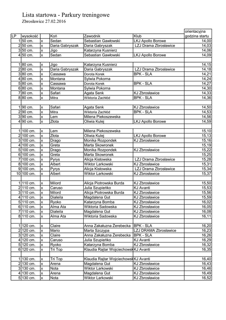 Lista startowa - Parkury treningowe Zbrosławice 27.02.2016 LP 1 2 3 4 wysokość 50 cm. 50 cm. 50 cm. 50 cm. x x x x 1 2 3 4 5 6 7 8 80 cm. 80 cm. 80 cm. 80 cm. 80 cm. 80 cm. 80 cm. 80 cm. Zawodnik Sebastian Gawłowski Daria Gabryszak Katarzyna Kusnierz Sebastian Gawłowski x x x x x x x x Jigo Daria Gabryszak Cassawa Montana Cassawa Montana Safari Katarzyna Kusnierz Daria Gabryszak Mitra Wiktoria Zachłód 1 2 3 4 90 cm. 90 cm. 90 cm. 90 cm. x x x x Safari Agata Senk Mitra Wiktoria Zachłód KJ Zbrosławice BPK - SLA Lem Złota Milena Piekoszewska Oliwia Kulej LKJ Apollo Borowe 1 2 3 4 5 6 7 8 9 10 100 cm. 100 cm. 100 cm. 100 cm. 100 cm. 100 cm. 100 cm. 100 cm. 100 cm. 100 cm. x x x x x x x x x x Lem Złota Drago Greta Drago Greta Pyrys Albert Pyrys Albert Milena Piekoszewska Oliwia Kulej Monika Rozpondek Marta Skowronek Monika Rozpondek Marta Skowronek Alicja Kistowska Wiktor Larkowski Alicja Kistowska Wiktor Larkowski 1 2 3 4 5 6 7 8 110 cm. 110 cm. 110 cm. 110 cm. 110 cm. 110 cm. 110 cm. 110 cm. x x x x x x x x Milord Caruso Milord Dialeila Ryoko Alma Ata Dialeila Alma Ata Alicja Piotrowska Burda Julia Szupieńko Alicja Piotrowska Burda Magdalena Gut Katarzyna Bomba Wiktoria Sadowska Magdalena Gut Wiktoria Sadowska 1 2 3 4 5 6 120 cm. 120 cm. 120 cm. 120 cm. 120 cm. 120 cm. x x x x x x Claire Mario Claire Caruso Ryoko Tri Top Anna Zakałuzna Żerebecka BPK - SLA Marta Szczypa LZJ DRAMA Zbrosławice Anna Zakałuzna Żerebecka BPK - SLA Julia Szupieńko KJ Avanti Katarzyna Bomba KJ Zbrosławice Klaudia Rajtar WojciechowskaKJ Avanti 16,20 16,23 16,26 16,29 16,32 16,35 1 2 3 4 5 130 cm. 130 cm. 130 cm. 130 cm. 130 cm. x x x x x Tri Top Arena Nota Arena Nota Klaudia Rajtar WojciechowskaKJ Avanti Magdalena Gut KJ Zbrosławice Wiktor Larkowski KJ Zbrosławice Magdalena Gut KJ Zbrosławice Wiktor Larkowski KJ Zbrosławice 16,40 16,43 16,46 16,49 16,52 Dorota Korek Klub LKJ Apollo Borowe LZJ Drama Zbrosławice orientacyjna godzina startu 14,00 14,03 14,06 14,09 Koń Sedan Daria Gabryszak Jigo Sedan LKJ Apollo Borowe LZJ Drama Zbrosławice BPK - SLA Sylwia Pokorna Dorota Korek Sylwia Pokorna Agata Senk BPK - SLA KJ Zbrosławice BPK - SLA 14,15 14,18 14,21 14,24 14,27 14,30 14,33 14,36 14,50 14,53 14,56 14,59 LZJ Drama Zbrosławice KJ Zbrosławice LZJ Drama Zbrosławice KJ Zbrosławice 15,10 15,13 15,16 15,19 15,22 15,25 15,28 15,31 15,34 15,37 KJ Zbrosławice KJ Avanti KJ Zbrosławice KJ Zbrosławice KJ Zbrosławice KJ Zbrosławice KJ Zbrosławice KJ Zbrosławice 15,50 15,53 15,56 15,59 16,02 16,05 16,08 16,11 LKJ Apollo Borowe KJ Zbrosławice KJ Zbrosławice