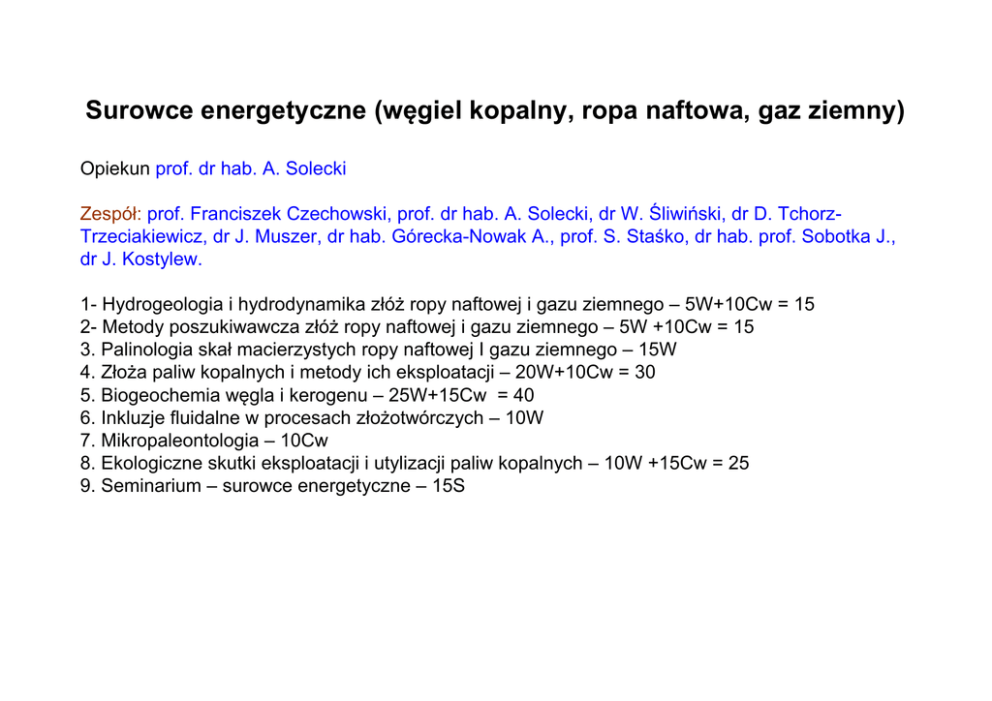 Surowce energetyczne (węgiel kopalny, ropa naftowa, gaz ziemny) Opiekun prof. dr hab. A. Solecki Zespół: prof. Franciszek Czechowski, prof. dr hab. A. Solecki, dr W. Śliwiński, dr D. TchorzTrzeciakiewicz, dr J. Muszer, dr hab. Górecka-Nowak A., prof. S. Staśko, dr hab. prof. Sobotka J., dr J. Kostylew. 1- Hydrogeologia i hydrodynamika złóż ropy naftowej i gazu ziemnego – 5W+10Cw = 15 2- Metody poszukiwawcza złóż ropy naftowej i gazu ziemnego – 5W +10Cw = 15 3. Palinologia skał macierzystych ropy naftowej I gazu ziemnego – 15W 4. Złoża paliw kopalnych i metody ich eksploatacji – 20W+10Cw = 30 5. Biogeochemia węgla i kerogenu – 25W+15Cw = 40 6. Inkluzje fluidalne w procesach złożotwórczych – 10W 7. Mikropaleontologia – 10Cw 8. Ekologiczne skutki eksploatacji i utylizacji paliw kopalnych – 10W +15Cw = 25 9. Seminarium – surowce energetyczne – 15S Biogeochemia węgla i kerogenu Prof. dr hab. Franciszek Czechowski • Paleośrodowisko i pierwotni producenci • Makrostrukturalna i molekularna budowa osadowej materii organicznej organicznej oraz kierunki jej przekształce gla i kerogenu przekszta ceń ce w tworzenie się si węgla • Specyficzność Specyficzno strukturalna biogennych molekularnych markeró markerów w środowiskach rodowiskach depozycji i ich biologiczne prekursory • Biogeochemiczne metody określenia okre lenia typu kerogenu oraz oceny stopnia jego przeobrażenia przeobra enia • Metodologia badania biogeomarkerów • Biogeomarkery jako narzędzie oceny: natury środowiska depozycyjnego, dojrzałości termicznej, migracji, biodegradacji, wymycia wodnego. • Przykłady zastosowania biogeomarkerów w geologii naftowej: do oceny stadium procesu generacji węglowodorów, korelacji ropa naftowa – skała macierzysta, oceny ciągłości złoża Palinologia skał macierzystych ropy naftowej i gazu ziemnego Dr hab. Anna Górecka-Nowak Palinologia dyscyplina nauk przyrodniczych zajmująca się mikroskopijnej wielkości kopalnymi cząstkami organicznymi, które pozostały po rozpuszczeniu skały w kwasach nieorganicznych Palinofacja - materia organiczna uzyskana ze skał osadowych w wyniku standardowej maceracji palinologicznej w kwasach nieorganicznych Palinomorfy - mikroskamieniałości organiczne (akritarchy, Chitinozoa, skolekodonty, mikroforaminiferida, spory grzybów, spory roślin zarodnikowych, ziarna pyłku roślin nasiennych, dinoflagellaty, algi) Określenie typu kerogenu metodą palinologiczną • Badania składu i stanu zachowania palinofacji na podstawie analizy mikroskopowej (światło przechodzące i badania we fluorescencji); • Skład palinofacji jest analizowany przez kwantyfikację jej składników i korelację z typem kerogenu; • Za pomocą badań mikroskopowych metodą palinologiczną można określić – typ kerogenu , co odnosi się bezpośrednio do podstawowego typu węglowodorów, wytworzonych z badanych skał źródłowych; – stan zachowania kerogenu, który wskazuje poziom generowania węglowodorów Typy kerogenu w preparatach palinologicznych I typ II typ III typ Określenie stopnia dojrzałości termicznej MO Skala zmian termicznych w oparciu o barwę palinomorf wg Battena (1981, 1996) oraz korelacja z innymi skalami zmian termicznych i generacją węglowodorów Mikropaleontologia 10 godz. - wykład prowadzący: dr Jolanta Muszer Mikropaleontologia jako nauka – historia, cele i zastosowania, metodyka badań. Omówienie grup mikroskamieniałości przydatnych do stratygrafii skał zbiornikowych dla surowców energetycznych (terminologia, ewolucja zastosowanie): otwornice, nannoplankton wapienny, radiolarie, okrzemki, małżoraczki, konodonty Mikropaleontologia - zastosowanie • Po I wojnie światowej – rozwój przemysłu motoryzacyjnego • od lat 1920-tych wzrost znaczenia mikropaleontologii w USA (przemysł naftowy!; własne laboratoria mikropaleontologiczne) Otwornice i ich indeks barwy (FCI) Nannoplankton wapienny, okrzemki, radiolarie Konodonty i ich CAI (wskaźnik barwy - temperatur) Inkluzje fluidalne w procesach złożotwórczych (10 godz., 1 punkt ECTS) Dr Joanna Kostylew (Zakład Mineralogii i Petrologii) Badania inkluzji fluidalnych pozwalają określić typ i skład chemiczny roztworów biorących udział w powstawianiu minerałów, m.in. w warunkach diagenezy i w procesach hydrotermalnych. Dzięki temu badania inkluzji fluidalnych są bardzo ważnym narzędziem wykorzystywanym do odtwarzania warunków powstawania złóż węglowodorów oraz wielu typów złóż metali. Ilustracje: www.geopetro.ethz.ch Inkluzje fluidalne w procesach złożotwórczych (10 godz., 1 punkt ECTS) Dr Joanna Kostylew (Zakład Mineralogii i Petrologii) Podczas wykładu studenci będą mogli poznać: •Mechanizmy powstawania inkluzji fluidalnych i ich klasyfikacje. •Metody badań inkluzji fluidalnych. •Zastosowanie analizy inkluzji fluidalnych w geologii złóż ropy naftowej i gazu ziemnego oraz innych złóż surowców nieenergetycznych. Ilustracje: www.geopetro.ethz.ch Metody poszukiwawcze złóż ropy naftowej i gazu ziemnego dr hab. prof. Jerzy Sobotka • Sejsmiczne (refleksyjne), geoelektryczne- otworowe, radiometryczne- otworowe. • Przykłady komputerowego modelowania i interpretacja zdjęć przekrojów poszukiwawczych. • Interpretacje jakościowe i ilościowe danych sejsmicznych. • Metodyka prowadzenia pomiarów sejsmicznych z wykorzystaniem techniki „wibrosejs”. • Kompleksowa interpretacja profilowań otworów wiertniczych. • Geochemiczne metody poszukiwań węglowodorów Metody poszukiwawcze złóż ropy naftowej i gazu ziemnego prof. dr hab. Andrzej Solecki http://www.microprolabs.de/english/oil-gas-industry_mpog.htm?PHPSESSID=d4c897650d4123e44c0bf079360c39d8 Złoża paliw kopalnych i metody ich eksploatacji Ropa naftowa, gaz ziemny • • • • • • • • • • systemy naftowe budowanie modeli ocena ryzyka pułapki prowincje roponośne i gazonośne złoża niekonwencjonal