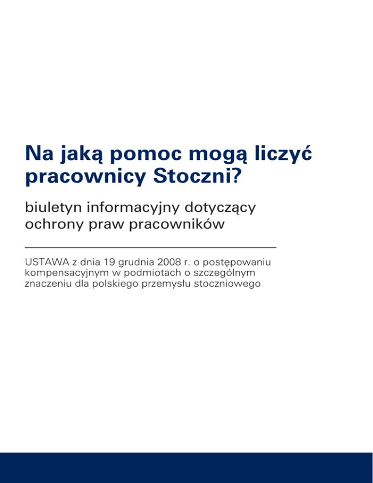 Na jaką pomoc mogą liczyć pracownicy Stoczni? biuletyn informacyjny dotyczący ochrony praw pracowników USTAWA z dnia 19 grudnia 2008 r. o postępowaniu kompensacyjnym w podmiotach o szczególnym znaczeniu dla polskiego przemysłu stoczniowego Szanowni Państwo, Rozpoczyna się proces przekształceń Stoczni, w których Państwo pracują. Jako Prezes Agencji Rozwoju Przemysłu zwracam się do Was, aby wyjaśnić, na czym będzie on polegał oraz przedstawić informacje, jakie osłony i pomoc będą Państwu przysługiwały. Nie zostaną Państwo pozostawieni sami sobie. Przyjęta ustawa, która reguluje proces przekształceń Stoczni, była szeroko konsultowana przez rząd ze stoczniowymi związkami zawodowymi. Jednym z najważniejszych jej aspektów była troska o Państwa bezpieczeństwo. Nie możemy obiecać, że każdy zachowa swoje miejsce pracy. Dlatego w ustawie został zapisany program ochrony pracowników. W ramach tego programu ustawa zapewnia Państwu możliwość dobrowolnego odejścia z pracy połączonego z wypłatą zwolnionego z podatku odszkodowania. Jego wysokość zależeć będzie od stażu pracy danej osoby w przemyśle stoczniowym. Im staż dłuższy, tym odszkodowanie będzie wyższe. Ustawa zapewnia także pomoc w szkoleniach, poszukiwaniu pracy i dofinansowaniu uruchomienia własnej działalności gospodarczej. Sytuacja, w której znalazły się Stocznie, oznaczać będzie dla wielu z Państwa konieczność zmiany zatrudnienia oraz przekwalifikowania się. Wiem, że to nie pracownicy ponoszą odpowiedzialność za problemy, które doprowadziły do dzisiejszej sytuacji. Jednak od trudnych decyzji nie uciekniemy – możemy tylko dokładać wszelkich starań, aby koszty społeczne były jak najmniejsze. Broszura, którą Państwo mają w rękach, zawiera najważniejsze informacje na temat możliwości skorzystania przez Państwa ze świadczeń, jakie daje zawarty w ustawie system ochrony pracowników. Pragnę Państwa zapewnić, że kierowana przeze mnie Agencja Rozwoju Przemysłu dołoży najwyższej staranności, aby przekształcenia Stoczni przeprowadzić skutecznie i w jak najbardziej bezpieczny dla Państwa sposób. Wybrany przez stoczniowe związki zawodowe przedstawiciel pracowników będzie w pełni monitorować proces zmian, aby zapewnić Państwu informacje i niezbędną pomoc. Obiecuję także, że będą Państwo w sposób rzetelny i wyczerpujący informowani o wszystkich ważnych sprawach, w tym przede wszystkim o programie osłonowym. Broszura, którą dla Państwa przygotowaliśmy, jest pierwszym tego rodzaju materiałem informacyjnym. Jeśli pojawia się nowe pytania, będziemy niezwłocznie przygotowywali jej kolejne wydania. Uruchomione też zostaną w stoczniach punkty informacyjne i doradcze. Ze swej strony pragnę zadeklarować, że dołożę wszelkich starań, by proces przekształceń przebiegał z należnym szacunkiem dla pracowników i ich potrzeb oraz w atmosferze dialogu społecznego. Z poważaniem, Wojciech Dąbrowski Prezes Agencji Rozwoju Przemysłu Ochrona praw pracowników w ustawie stoczniowej Ustawa zapewnia stoczniowcom (oraz pracownikom spółek, w których Stocznie posiadają ponad połowę udziałów lub akcji, pod warunkiem, że ich działalność była związana z produkcją stoczniową) jednorazowe odszkodowanie oraz pakiet usług wspierających znalezienie nowego miejsca pracy opracowany przez Agencję Rozwoju Przemysłu połączony ze świadczeniem wypłacanym co miesiąc przez pół roku. Ustawa obejmuje: • pracowników Stoczni, którzy zostali zatrudnieni na umowę o pracę nie później niż 31 października 2008 r. • pracowników, którzy przeszli do Stoczni po tym terminie, ale – bezpośrednio przed rozpoczęciem pracy w Stoczni pracowali w przedsiębiorstwie, które przynajmniej w połowie było własnością Stoczni i którego działalność polegała na świadczeniu usług na rzecz Stoczni oraz: – zostali zatrudnieni na takich samych warunkach, na jakich pracowali w poprzednim przedsiębiorstwie. Z odszkodowania i wymienionego na wstępie pakietu nie skorzystają: • władze Stoczni (prezes i członkowie zarządu), • osoby zatrudnione na okres próbny, • osoby zatrudnione na umowę o pracę w celu przygotowania zawodowego, • posiadacze prawomocnych orzeczeń stwierdzających nabycie uprawnień do emerytury, którzy ukończyli 65 lat życia w przypadku mężczyzn i 60 lat w przypadku kobiet • renciści całkowicie niezdolni do pracy w rozumieniu przepisów ZUS, • pracownicy przebywający na urlopie bezpłatnym, którzy nie zgłosili powrotu z tego urlopu w terminie uzgodnionym ze stocznią w ciągu 7 dni od otrzymania od stoczni pouczenia o takiej możliwości. Odszkodowania – czyli „program dobrowolnych odejść” Jaka jest kwota odszkodowania? Wysokość odszkodowania jest zróżnicowana i zależy od stażu pracy – Im dłuższy staż pracy, tym większa szansa na skorzystanie z wyższej kwoty odszkodowania. Ważne! Dla określenia wysokości odszkodowania liczy się tylko staż pracy w „przedsiębiorstwach morskiej stoczni produkcyjnej” Według ustawy oznacza to: 1) przedsiębiorstwo państwowe Stocznia im. Komuny Paryskiej z siedzibą w Gdyni, spółkę Stocznia Gdynia S.A. z siedzibą w Gdyni – lub spółki z ich udziałem, których podstawowym realizowanym przedmiotem działalności było świadczenie usług na rzecz tych podmiotów lub produkcja stoczniowa; 2) przedsiębiorstwo państwowe Szczecińska Stocznia im. Adolfa Warskiego w Szczecinie, spółkę Stocznia Szczecińska S.A. z siedzibą w Szczecinie, spółkę Stocznia Szczecińska Porta Holding S.A. z siedzibą w Szczecinie oraz spółkę Stocznia Szczecińska Nowa Sp. z o.o. z siedzibą w Szczecinie – lub spółki z ich udziałem, których podstawowym realizowanym przedmiotem działalności było świadczenie usług na rzecz tych podmiotów lub produkcja stoczniowa Ustawa określa cztery progi stażu pracy, od któ