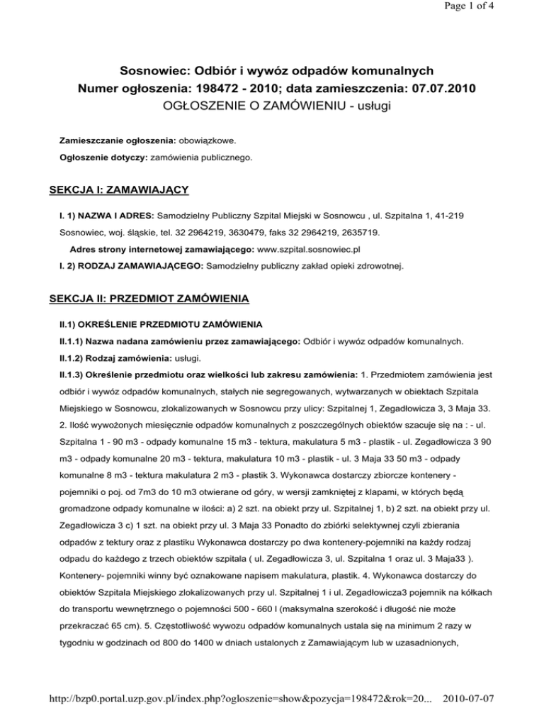 Page 1 of 4 Sosnowiec: Odbiór i wywóz odpadów komunalnych Numer ogłoszenia: 198472 - 2010; data zamieszczenia: 07.07.2010 OGŁOSZENIE O ZAMÓWIENIU - usługi Zamieszczanie ogłoszenia: obowiązkowe. Ogłoszenie dotyczy: zamówienia publicznego. SEKCJA I: ZAMAWIAJĄCY I. 1) NAZWA I ADRES: Samodzielny Publiczny Szpital Miejski w Sosnowcu , ul. Szpitalna 1, 41-219 Sosnowiec, woj. śląskie, tel. 32 2964219, 3630479, faks 32 2964219, 2635719. Adres strony internetowej zamawiającego: www.szpital.sosnowiec.pl I. 2) RODZAJ ZAMAWIAJĄCEGO: Samodzielny publiczny zakład opieki zdrowotnej. SEKCJA II: PRZEDMIOT ZAMÓWIENIA II.1) OKREŚLENIE PRZEDMIOTU ZAMÓWIENIA II.1.1) Nazwa nadana zamówieniu przez zamawiającego: Odbiór i wywóz odpadów komunalnych. II.1.2) Rodzaj zamówienia: usługi. II.1.3) Określenie przedmiotu oraz wielkości lub zakresu zamówienia: 1. Przedmiotem zamówienia jest odbiór i wywóz odpadów komunalnych, stałych nie segregowanych, wytwarzanych w obiektach Szpitala Miejskiego w Sosnowcu, zlokalizowanych w Sosnowcu przy ulicy: Szpitalnej 1, Zegadłowicza 3, 3 Maja 33. 2. Ilość wywoŜonych miesięcznie odpadów komunalnych z poszczególnych obiektów szacuje się na : - ul. Szpitalna 1 - 90 m3 - odpady komunalne 15 m3 - tektura, makulatura 5 m3 - plastik - ul. Zegadłowicza 3 90 m3 - odpady komunalne 20 m3 - tektura, makulatura 10 m3 - plastik - ul. 3 Maja 33 50 m3 - odpady komunalne 8 m3 - tektura makulatura 2 m3 - plastik 3. Wykonawca dostarczy zbiorcze kontenery pojemniki o poj. od 7m3 do 10 m3 otwierane od góry, w wersji zamkniętej z klapami, w których będą gromadzone odpady komunalne w ilości: a) 2 szt. na obiekt przy ul. Szpitalnej 1, b) 2 szt. na obiekt przy ul. Zegadłowicza 3 c) 1 szt. na obiekt przy ul. 3 Maja 33 Ponadto do zbiórki selektywnej czyli zbierania odpadów z tektury oraz z plastiku Wykonawca dostarczy po dwa kontenery-pojemniki na kaŜdy rodzaj odpadu do kaŜdego z trzech obiektów szpitala ( ul. Zegadłowicza 3, ul. Szpitalna 1 oraz ul. 3 Maja33 ). Kontenery- pojemniki winny być oznakowane napisem makulatura, plastik. 4. Wykonawca dostarczy do obiektów Szpitala Miejskiego zlokalizowanych przy ul. Szpitalnej 1 i ul. Zegadłowicza3 pojemnik na kółkach do transportu wewnętrznego o pojemności 500 - 660 l (maksymalna szerokość i długość nie moŜe przekraczać 65 cm). 5. Częstotliwość wywozu odpadów komunalnych ustala się na minimum 2 razy w tygodniu w godzinach od 800 do 1400 w dniach ustalonych z Zamawiającym lub w uzasadnionych, http://bzp0.portal.uzp.gov.pl/index.php?ogloszenie=show&pozycja=198472&rok=20... 2010-07-07 Page 2 of 4 sporadycznych przypadkach na telefoniczne zgłoszenie Zamawiającego. W przypadku pojemników na makulaturę lub plastik odbiór następować będzie na telefoniczne zgłoszenie Zamawiającego. 6. Wywóz odpadów będzie potwierdzany przez stosowny kwit, podpisany przez Wykonawcę oraz Zamawiającego wraz z wyszczególnieniem ilości wywoŜonych odpadów, ustalonej na podstawie wagi oraz daty wykonanej usługi. 7. Zamawiający informuje, Ŝe obiekt zlokalizowany przy ul. 3 Maja 33 będzie w uŜytkowaniu Szpitala Miejskiego w Sosnowcu do ok. końca października 2010r. Z chwilą przeniesienia oddziałów z obiektu przy ul. 3 Maja 33 na ul. Zegadłowicza 3, pojemniki na odpady będą dostarczone na ul. Zegadłowicza 3. 8. Wykonawca złoŜy pisemne oświadczenie, Ŝe usługa będzie realizowana w sposób zgodny z zasadami gospodarowania odpadami, wymaganiami ochrony środowiska oraz planami gospodarki odpadami w oparciu o aktualnie obowiązujące akty prawne: Ustawa z dnia 27 kwietnia 2001r. o odpadach- Prawo ochrony środowiska / Dz. U. z 2008r. Nr 25, poz. 150 z późn. zm /. Ustawa z dnia 27 kwietnia 2001r. o odpadach / Dz. U. z 2007r. Nr 39, poz. 251 z późn. zm./. Ustawa z dnia 13 września 1996 r. o utrzymaniu czystości i porządku w gminach / Dz. U. z 2005 r. Nr 236, poz. 2008 z późn. zm./ Ustawa o transporcie drogowym z dnia 6 września 2001r. / Dz. U. z 2007r. Nr 125 poz. 874 z późn. zm./. II.1.4) Czy przewiduje się udzielenie zamówień uzupełniających: nie. II.1.5) Wspólny Słownik Zamówień (CPV): 90.51.10.00-2. II.1.6) Czy dopuszcza się złoŜenie oferty częściowej: nie. II.1.7) Czy dopuszcza się złoŜenie oferty wariantowej: nie. II.2) CZAS TRWANIA ZAMÓWIENIA LUB TERMIN WYKONANIA: Okres w miesiącach: 12. SEKCJA III: INFORMACJE O CHARAKTERZE PRAWNYM, EKONOMICZNYM, FINANSOWYM I TECHNICZNYM III.1) WADIUM Informacja na temat wadium: Zamawiający niw wymaga wniesienia wadium III.2) ZALICZKI Czy przewiduje się udzielenie zaliczek na poczet wykonania zamówienia: nie III.3) WARUNKI UDZIAŁU W POSTĘPOWANIU ORAZ OPIS SPOSOBU DOKONYWANIA OCENY SPEŁNIANIA TYCH WARUNKÓW III. 3.1) Uprawnienia do wykonywania określonej działalności lub czynności, jeŜeli przepisy prawa nakładają obowiązek ich posiadania Opis sposobu dokonywania oceny spełniania tego warunku Spełnienie warunku - na podstawie dostarczonego dokumentu - aktualnego pozwolenia na prowadzenie działalności w zakresie zbierania i transportu odpadów oraz aktualne pozwolenie na odbiór odpadów z terenu miasta Sosnowca III.3.2) Wiedza i doświadczenie http://bzp0.portal.uzp.gov.pl/index.php?ogloszenie=show&pozycja=198472&rok=20... 2010-07-07 Page 3 of 4 Opis sposobu dokonywania oceny spełniania tego warunku Na podstawie oświadczenia według załącznika nr 2 do SIWZ III.3.3) Potencjał techniczny Opis sposobu dokonywania oceny spełniania tego warunku Na podstawie oświadczenia według załącznika nr 2 do SIWZ III.3.4) Osoby zdolne do wykonania zamówienia Opis sposobu dokonywania oceny spełniania tego warunku Na podstawie oświadczenia według załącznika nr 2 do SIWZ III.3.5) Sytuacja ekonomiczna i finansowa Opis sposobu dokonywania oceny spełniania tego warunku Na podstawie oświadczenia według załącznika nr 2 do SIWZ III.4) INFORMACJA O OŚWIADCZENIACH LUB DOKUMENTACH, JAKIE MAJĄ DOSTARCZYĆ WYKO